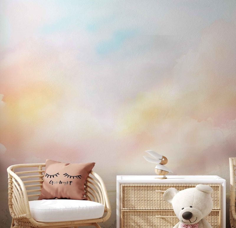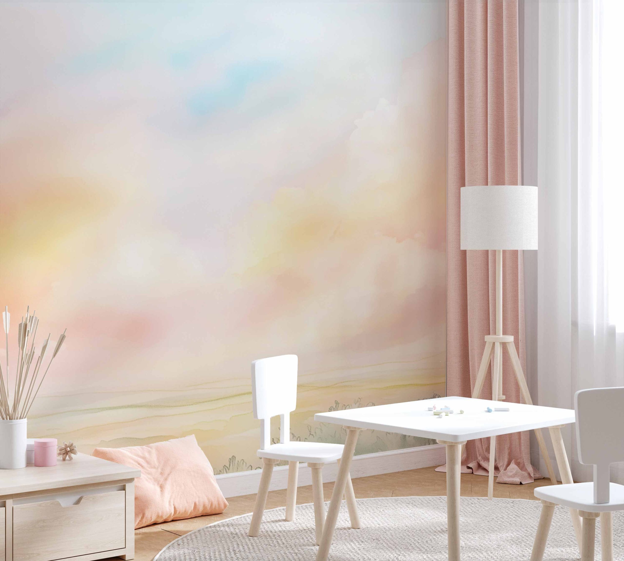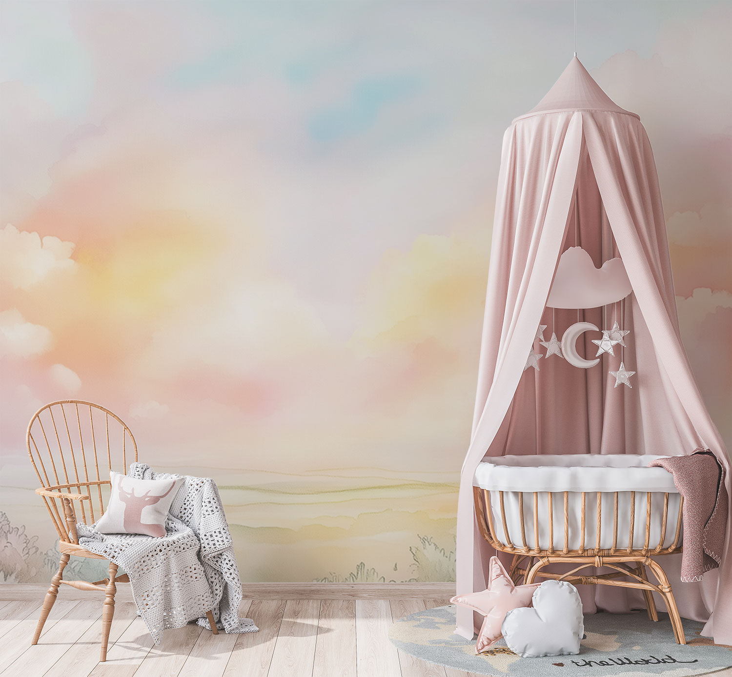 Zachte pasteltinten dansen over de muren in een dromerig landschap vol pluizige wolken. Een levendige regenboog buigt zich over weelderige groene velden waar bomen zachtjes ruisen. Dit behang brengt de magie van een zonnige lentedag naar binnen en creëert een kalme, veilige omgeving die de fantasie prikkelt en zorgt voor zoete dromen in elke kinderkamer.