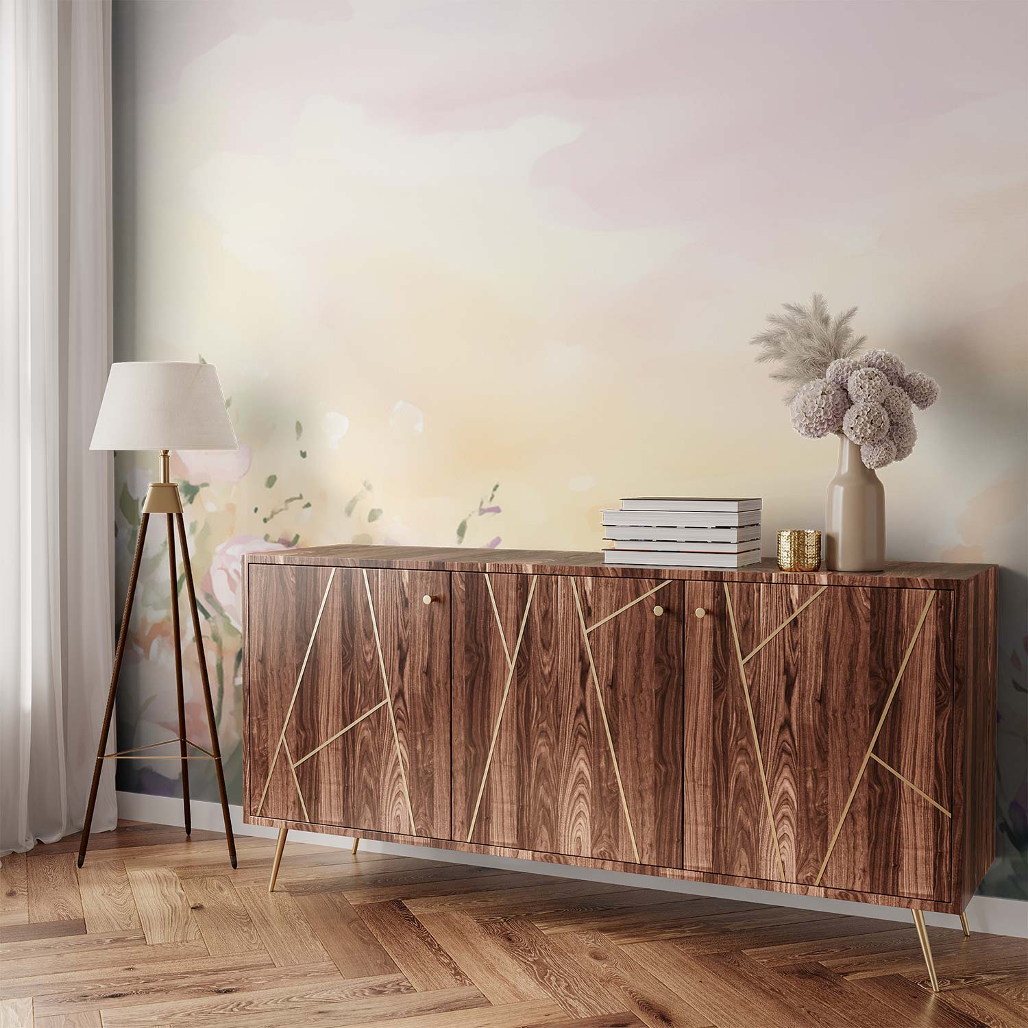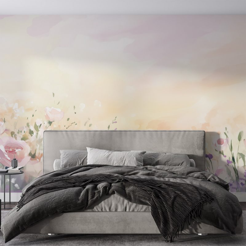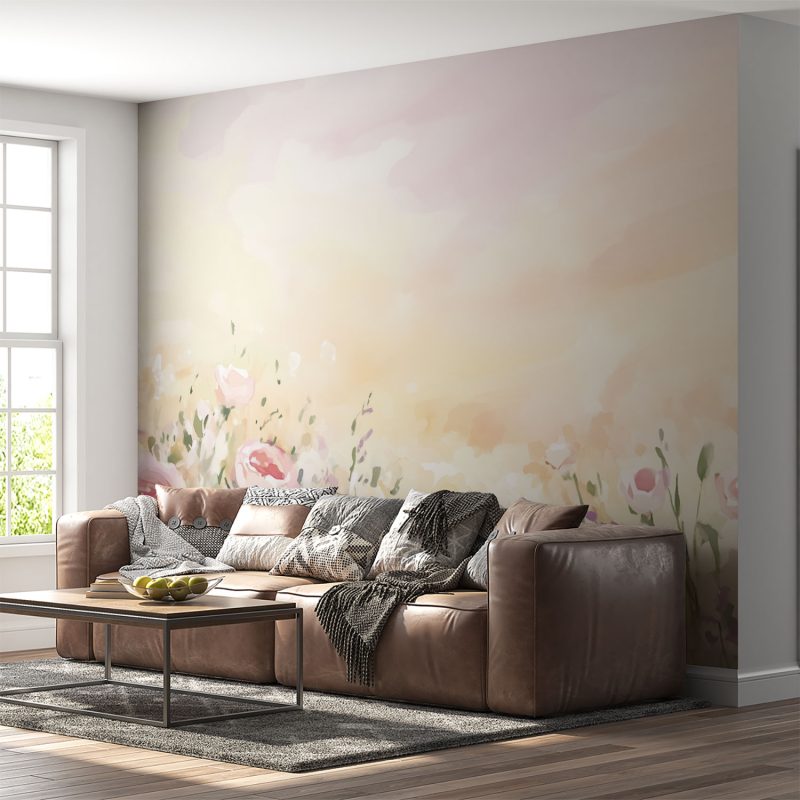 Zachte pasteltinten van roze, wit en geel dansen over het behang in een impressionistische bloemenzee. Rozen wiegen zachtjes in een dromerige compositie die rust en sereniteit uitstraalt. Deze levendige waterverluchtigheid brengt de tedere schoonheid van de natuur naar binnen, perfect voor een kalme en harmonieuze sfeer in elke leefruimte.
