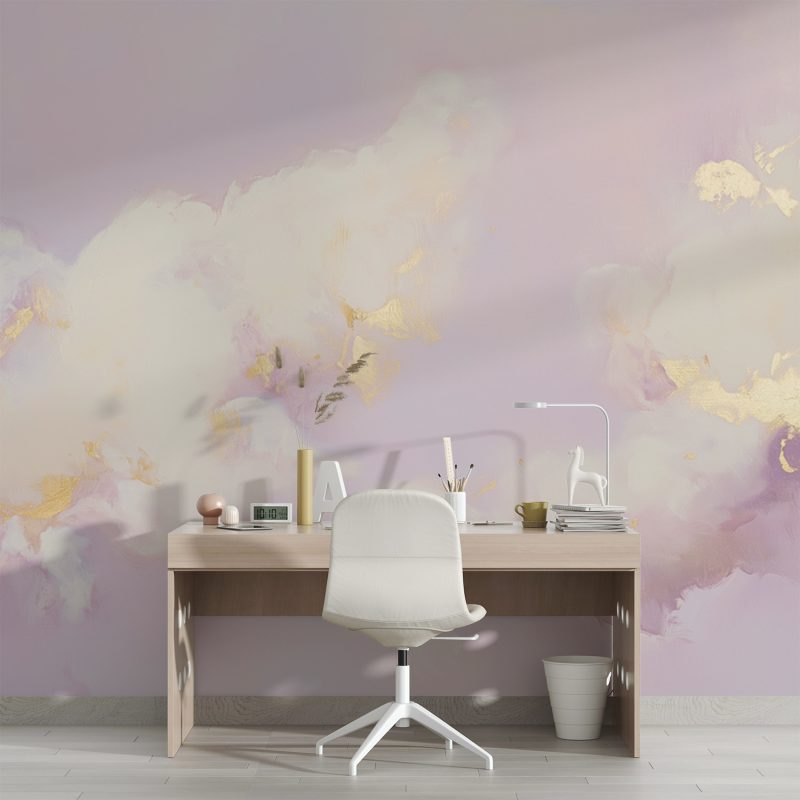 Zwevende pastelroze en witte wolken dansen over dit behang, verrijkt met gouden accenten die een luxueuze glans toevoegen. De dieptewerking brengt een serene sfeer tot leven, alsof je naar een kalme hemel kijkt. Perfect voor een rustgevende slaapkamer of een stijlvolle woonkamer, waar het direct een gevoel van harmonie en elegantie brengt.