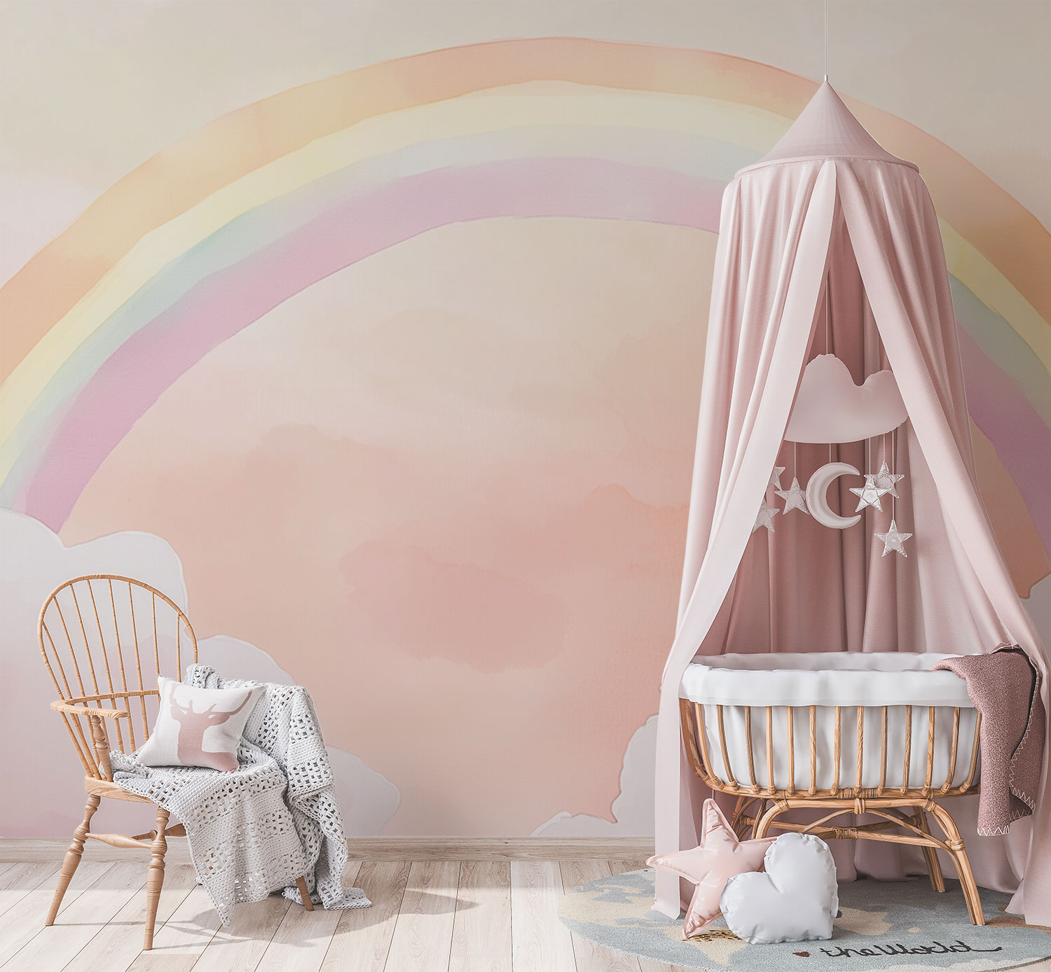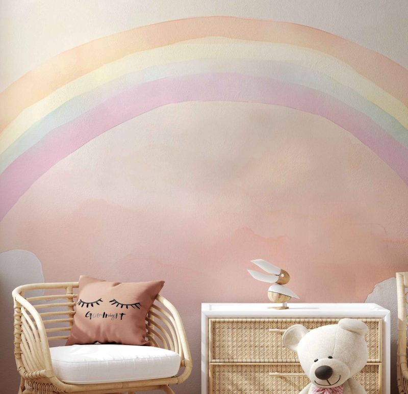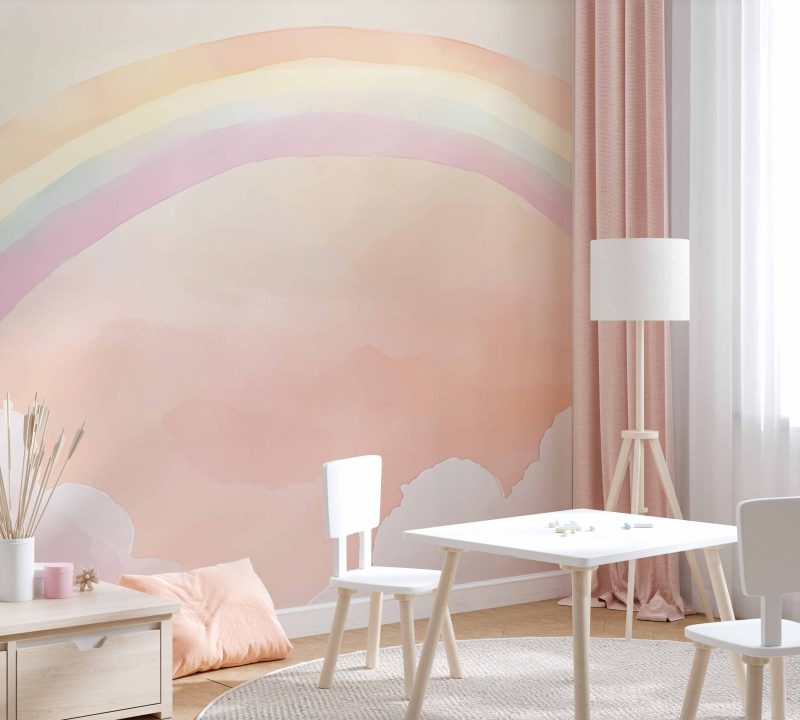 Zachte pastelkleuren dansen over de muur in een vrolijke regenboogboog, omringd door dromerige witte wolken. Dit serene tafereel brengt magische rust en verwondering in de kinderkamer, waar kleintjes wegdromen bij de eindeloze mogelijkheden die de lucht symboliseert. Perfect om een speelse, hoopvolle sfeer te creëren die inspireert tot fantasie en nieuwe avonturen.