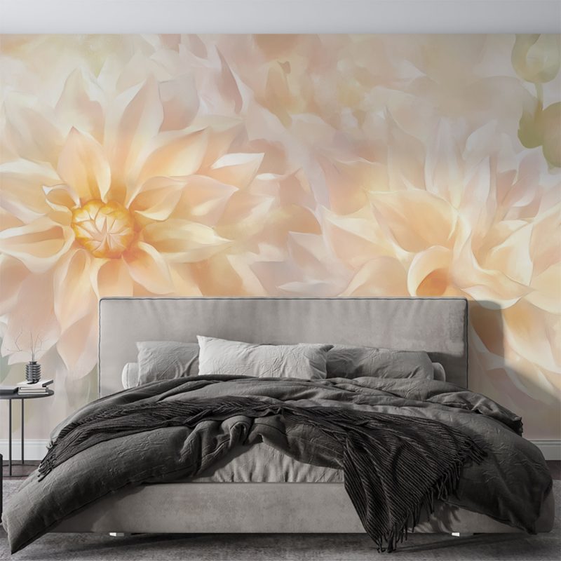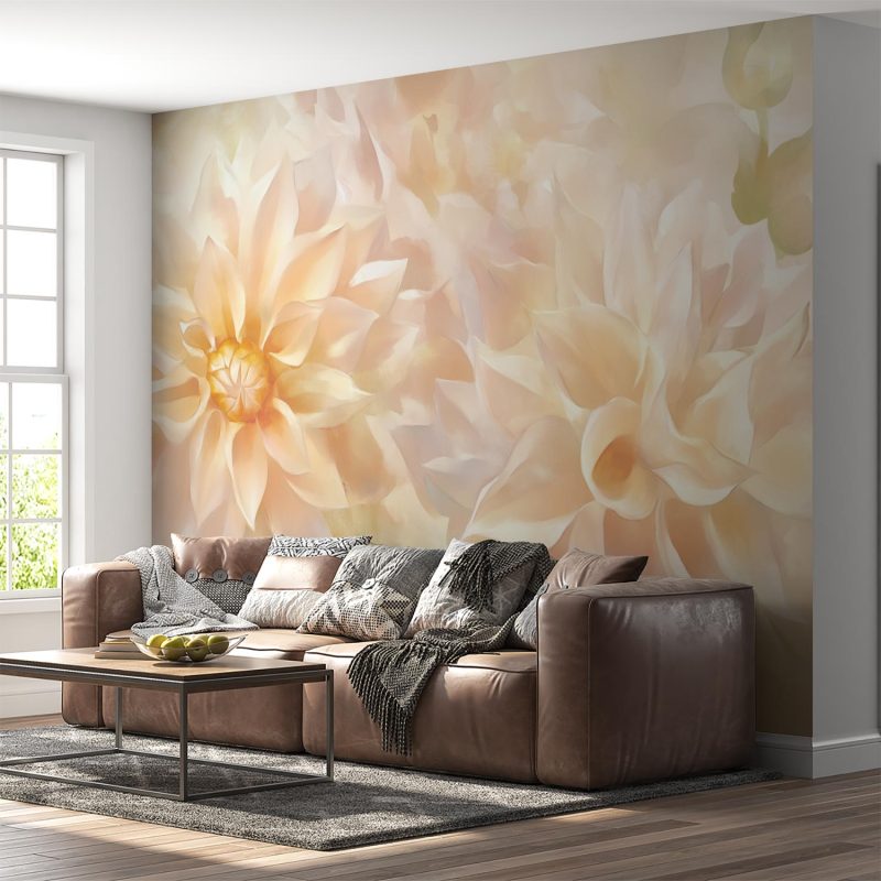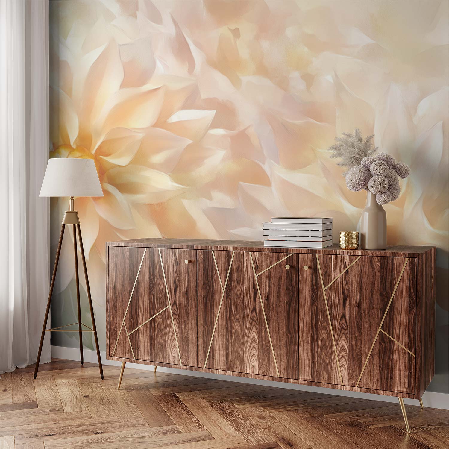 Zachte pasteltinten omarmen een levendige dahlia in volle bloei. Zonnige gele hartjes stralen warmte uit terwijl delicate bloemblaadjes zachtjes lijken te bewegen. Dit kunstzinnige bloemenportret brengt een serene natuurlijke sfeer in je ruimte. De harmonieuze compositie werkt als een rustpunt voor het oog en transformeert elke muur in een kalmerend blikvanger vol organische schoonheid.