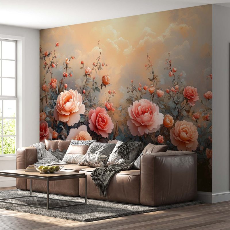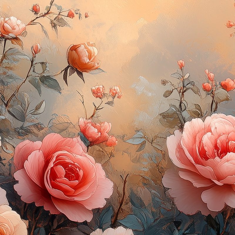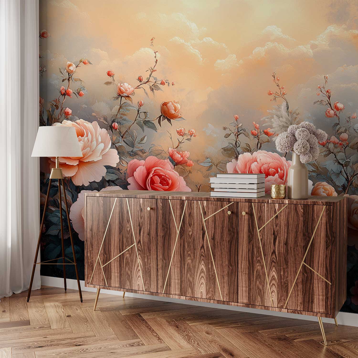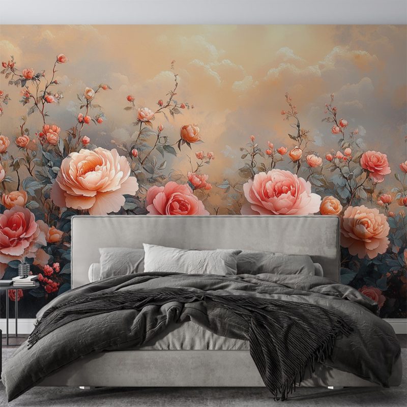 Verwarmend roze en oranje rozen dansen in volle bloei, als een zacht briesje door de tuin waait. Dromerige wolkenluchten geven diepte aan dit levendige tafereel vol serene schoonheid. Breng de rustgevende charme van een bloeiende tuin naar binnen, waar deze harmonieuze compositie elke ruimte transformeert tot een oase van natuurlijke elegantie en tijdloze stijl.