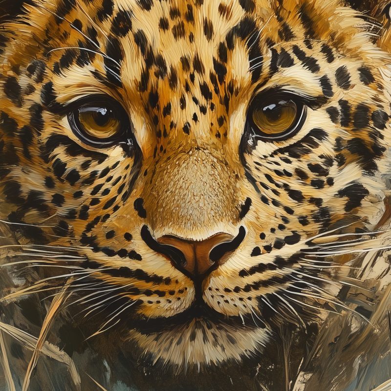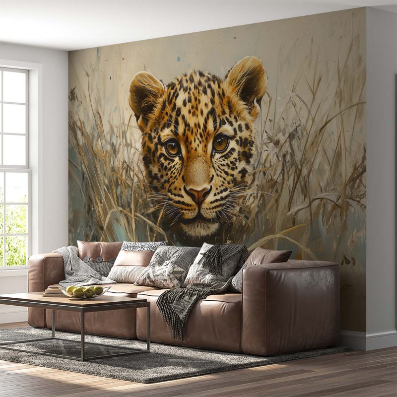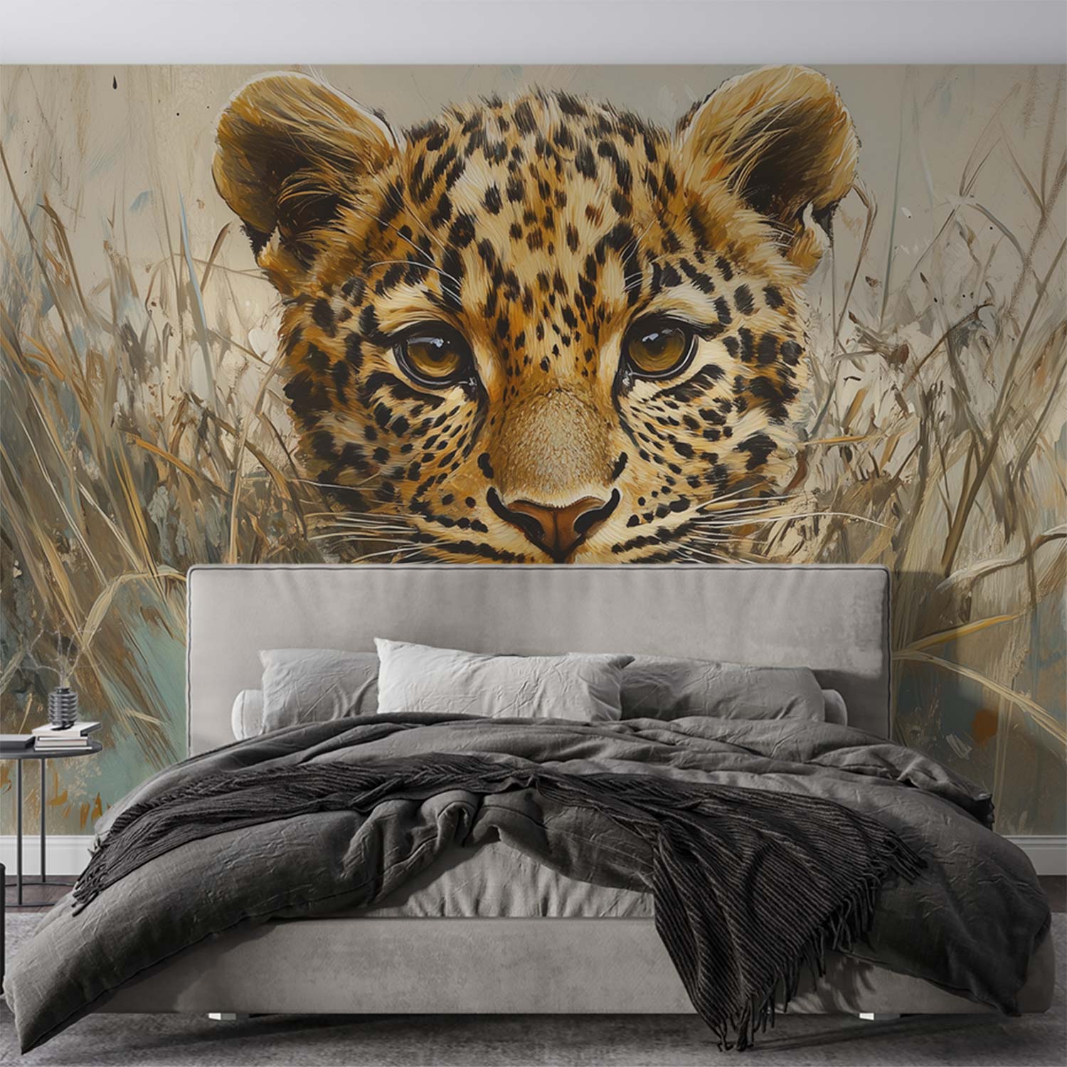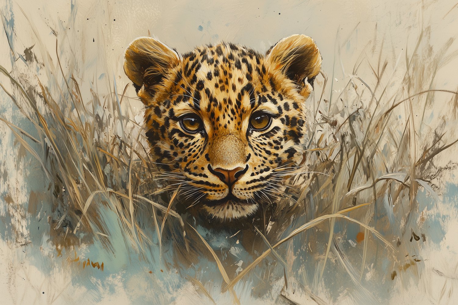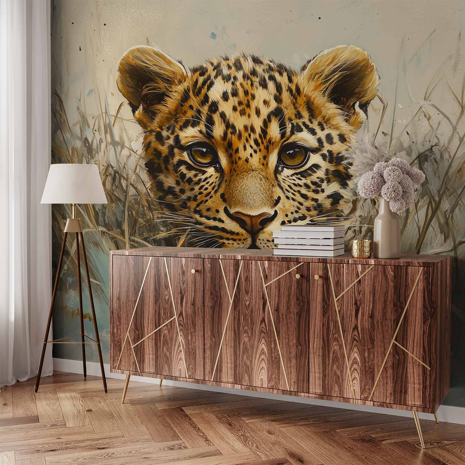 Zachte aardetinten vangen de serene kracht van dit luipaard in zijn natuurlijke omgeving. Zijn indringende blik en gedetailleerde vacht lijken tot leven te komen tegen het wuivende gras. Deze realistische weergave brengt een gevoel van wilde elegantie en rust in je ruimte, perfect voor wie verfijning en natuurlijke schoonheid waardeert in het interieur.