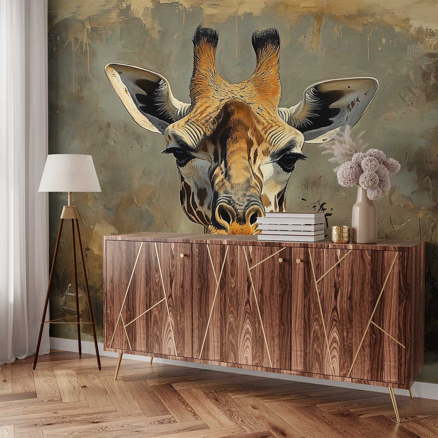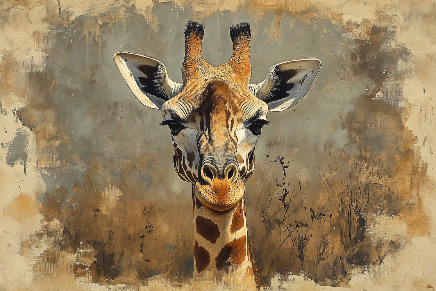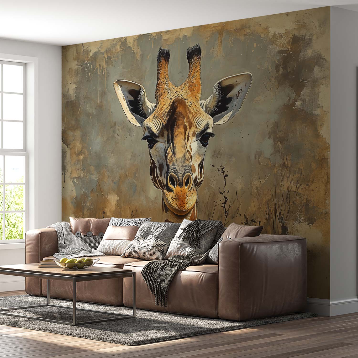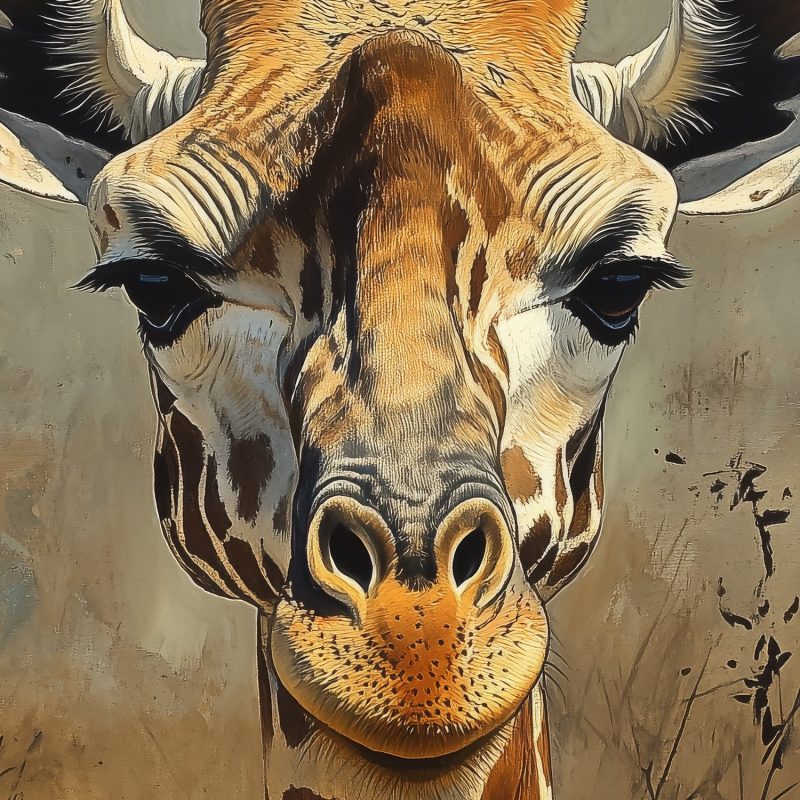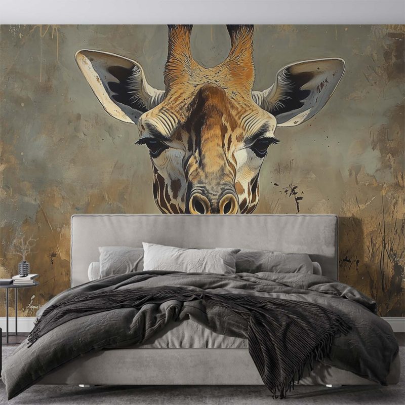 Majestueus rijst de giraffe op uit een warme aarde van beige en bruin. Zijn realistische blik trekt je meteen de savanne in, waar rust en natuur samensmelten. Dit levendige tafereel brengt een gevoel van sereniteit en vrijheid in je interieur, perfect voor wie verlangt naar een natuurlijke, aardse sfeer in huis.