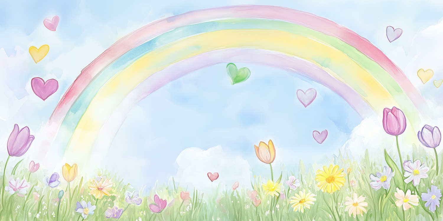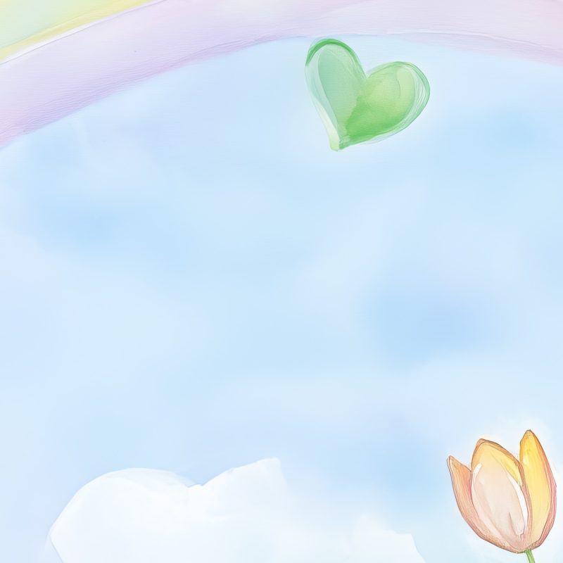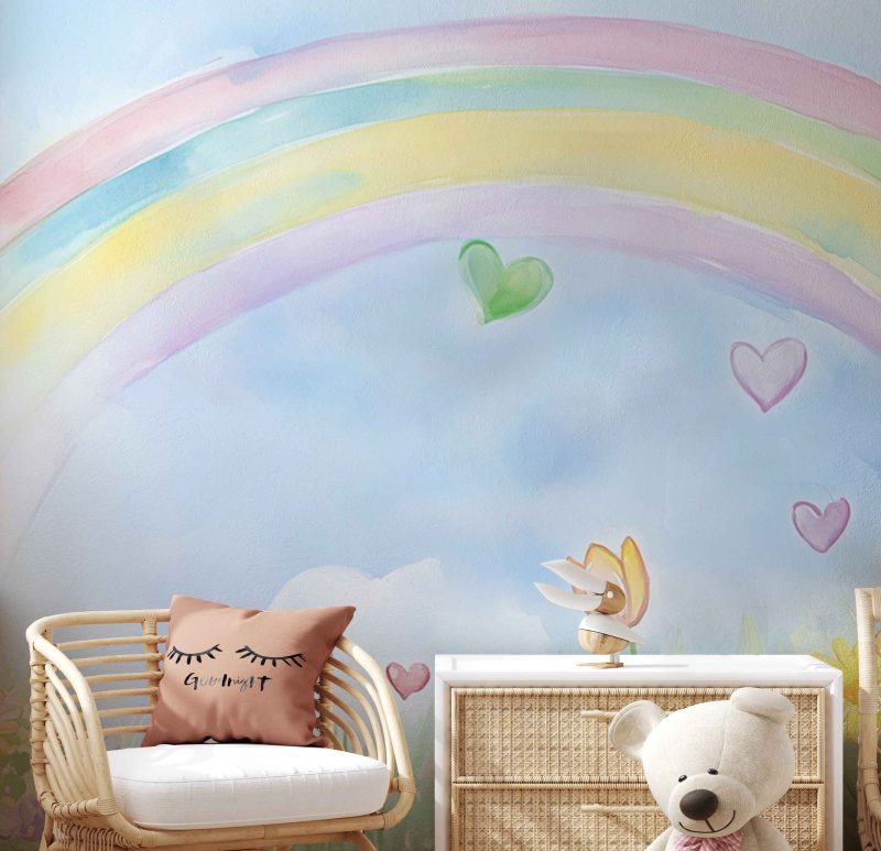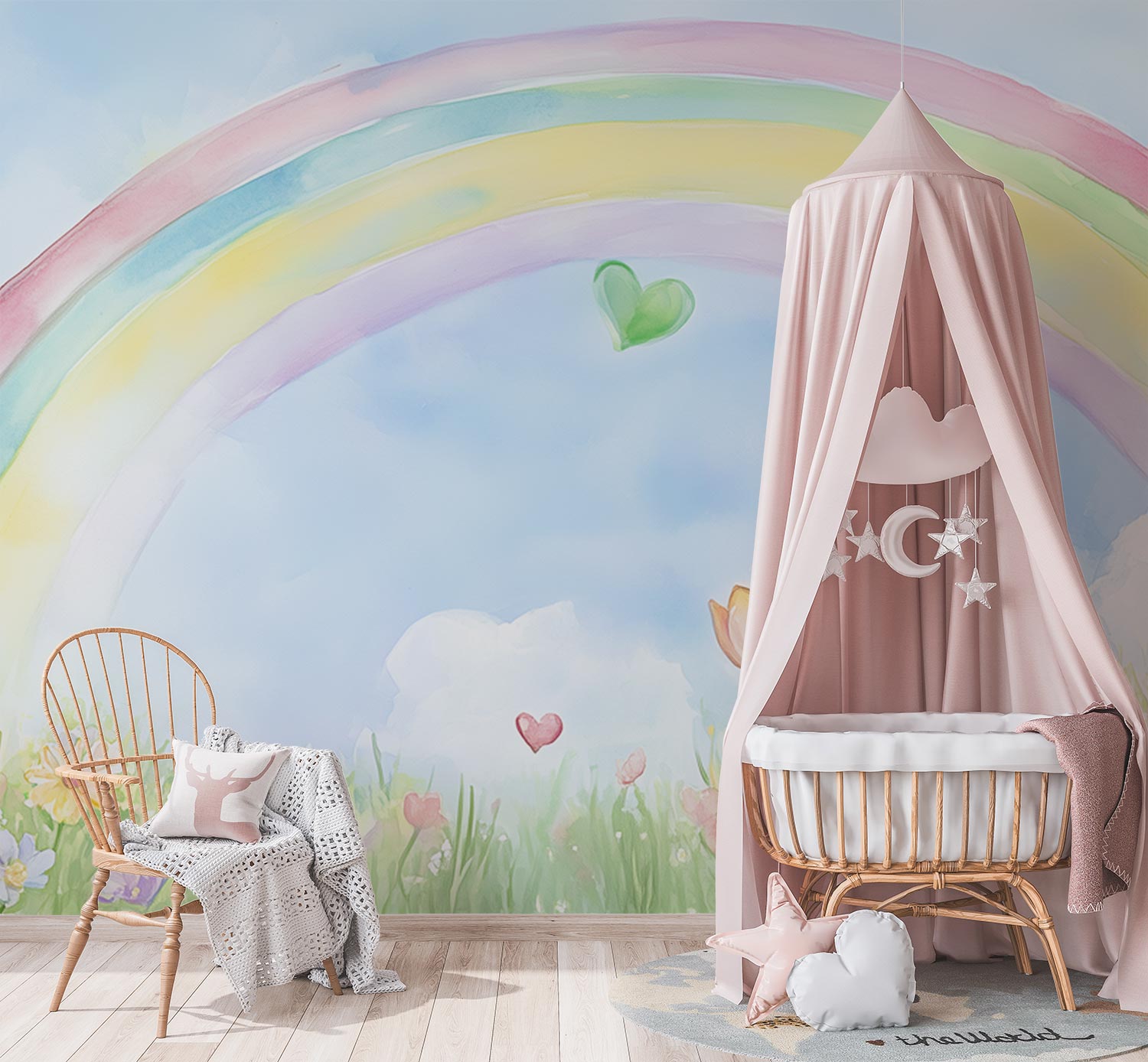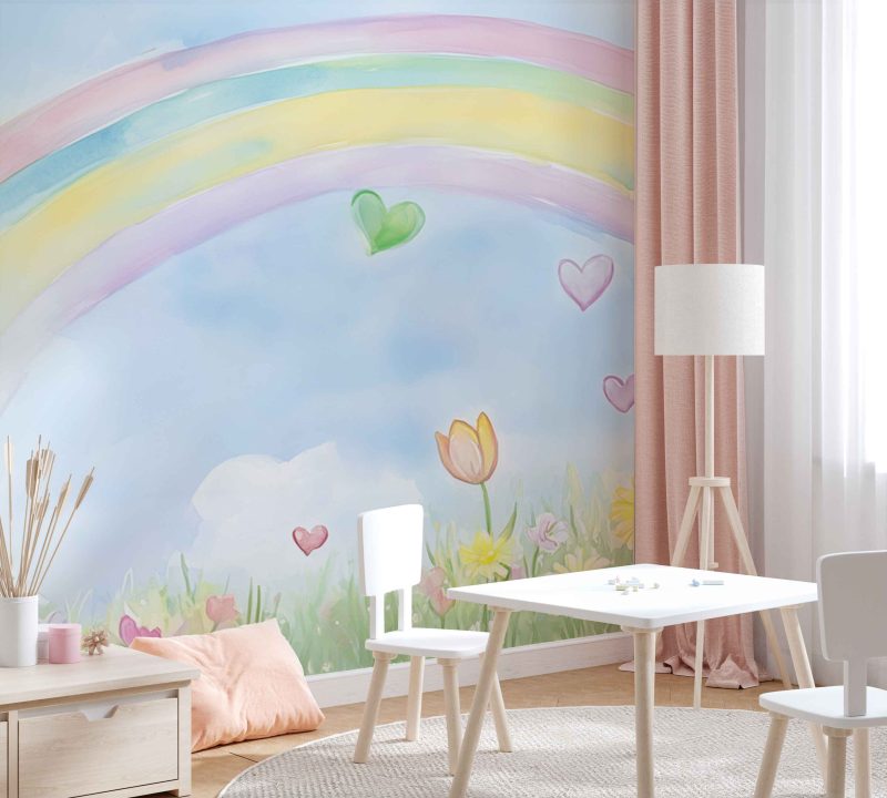 Dansende regenboogkleuren wervelen over een stralend blauwe hemel, omringd door zwevende hartjes en pluizige wolken. Beneden wuiven vrolijke tulpen en madeliefjes in een zee van kleur. Dit fantasierijke behang brengt pure vreugde in de kinderkamer en stimuleert de verbeelding met zijn speelse, levendige sfeer die elke dag tot avontuur nodigt.