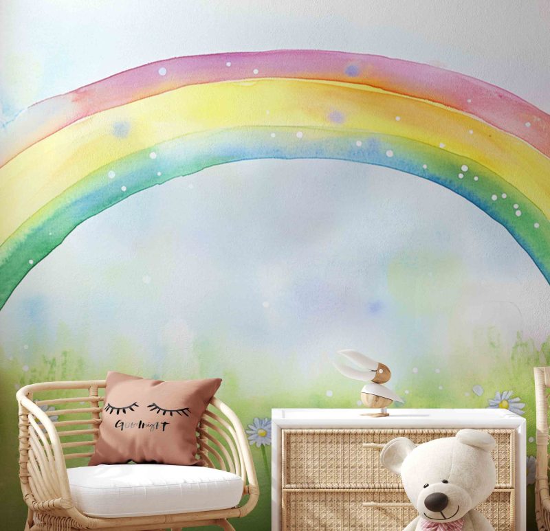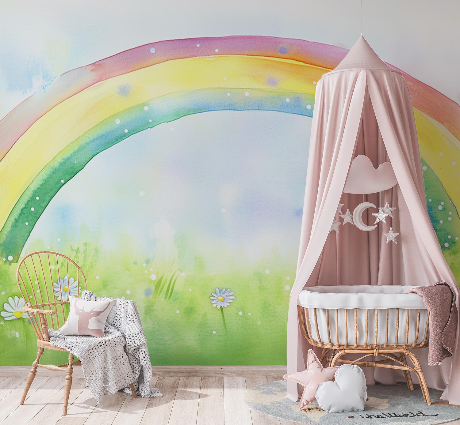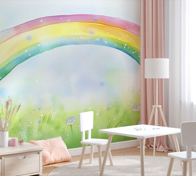 Kleurrijke regenboogbogen dansen over een zacht groen veld vol witte madeliefjes. Dit waterverfbehang ademt een dromerige sfeer vol harmonie en vrolijkheid, alsof de kamer elk moment in een sprookjeslandschap verandert. Perfect voor een kinderkamer waar fantasie mag ontwaken en kleuren de dag vrolijker maken.