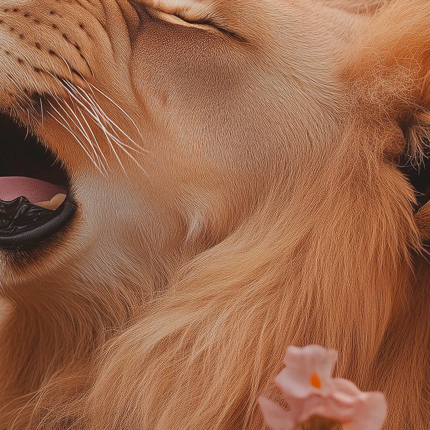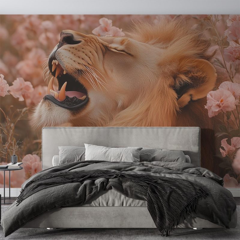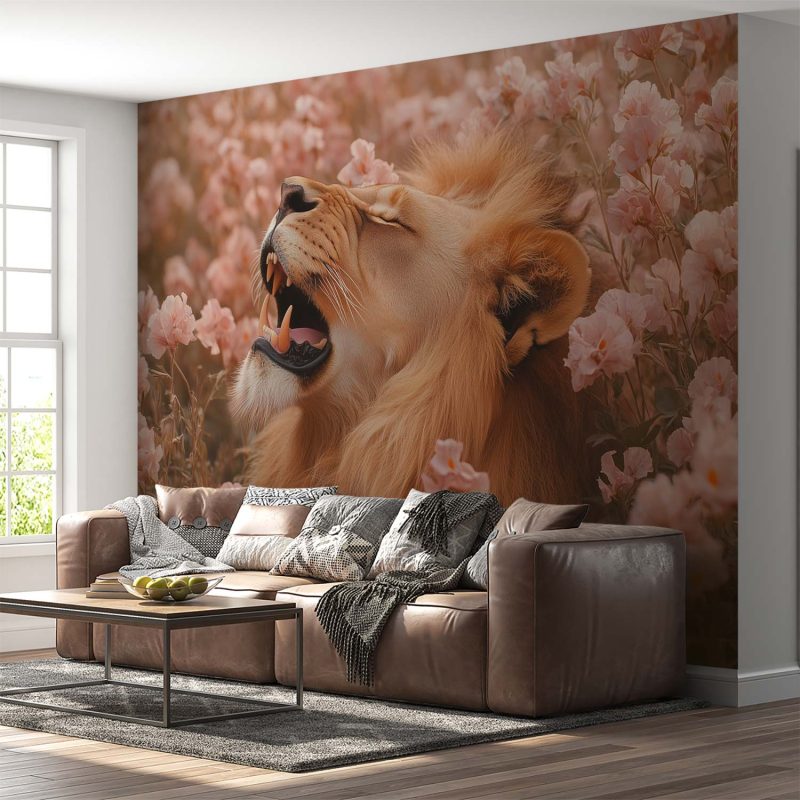 Roze bloemen golven rond een rustgevende leeuw met gesloten ogen. Zijn gouden vacht straalt sereniteit uit terwijl de bloemenzee hem omarmt. Deze harmonieuze scène brengt majestueuze rust en natuurlijke schoonheid in je ruimte. De levendige kleuren en gebalanceerde compositie creëren een focal point vol bewondering. Perfect voor een statement muur die zowel kalmte als karakter toevoegt aan je interieur.