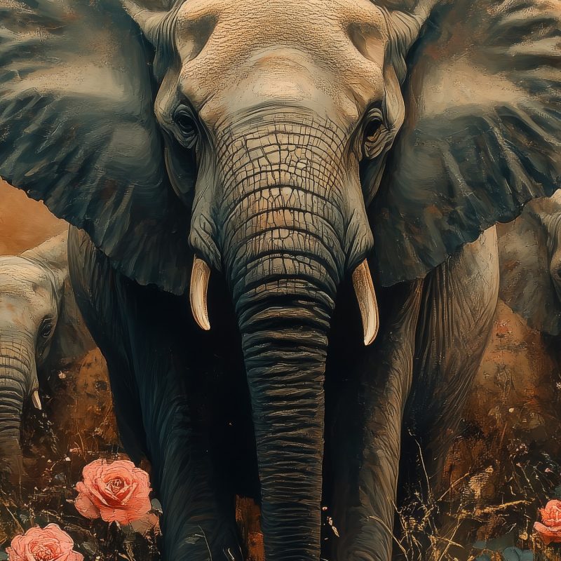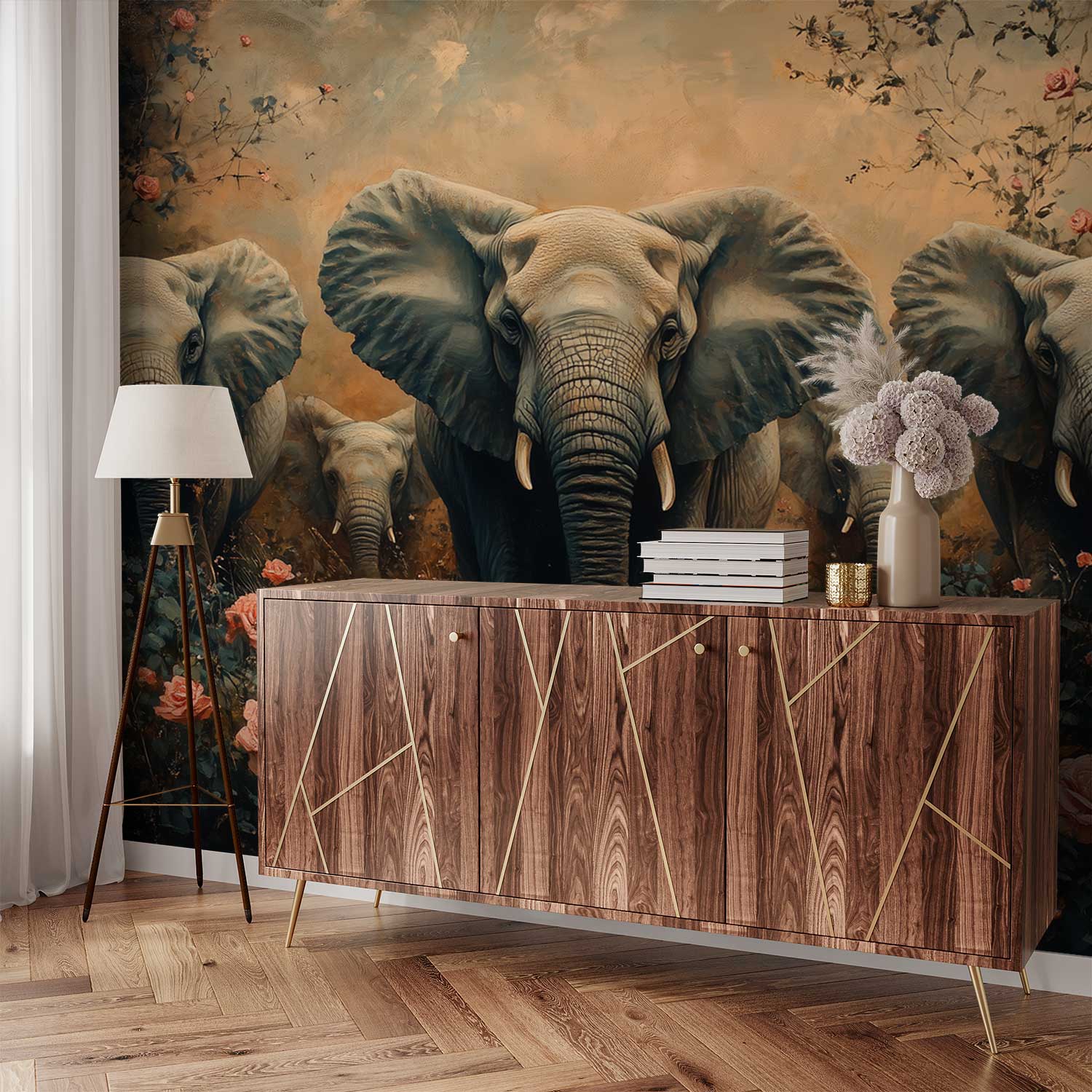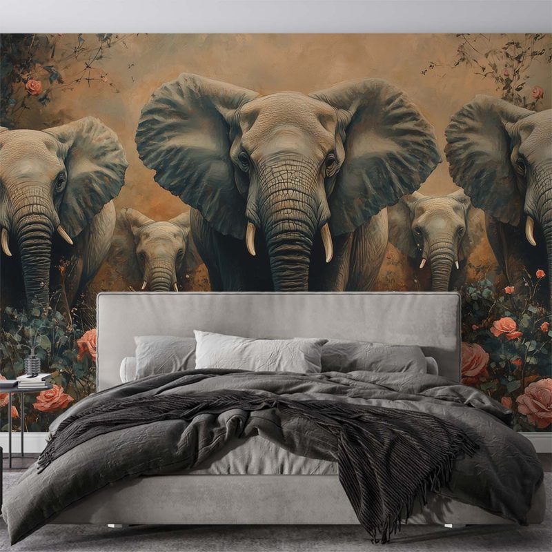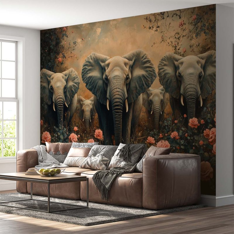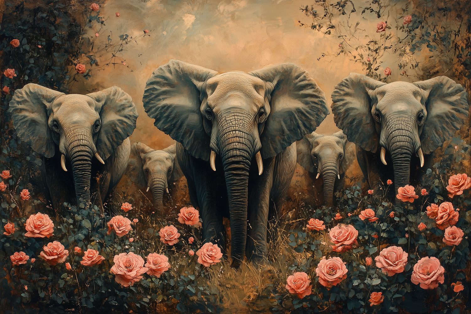 Roze bloemen golven zacht in de groene weide terwijl vijf olifanten in harmonieuze beweging door het landschap schrijden. Hun grijze huid contrasteert elegant met het levendige bloementapijt, omringd door aardse tinten die diepte creëren. Dit serene tafereel brengt rust en natuurlijke schoonheid in je ruimte, perfect voor een kalme en gebalanceerde sfeer in elke kamer.