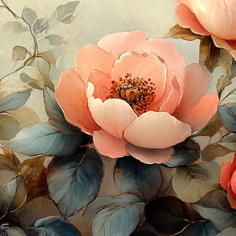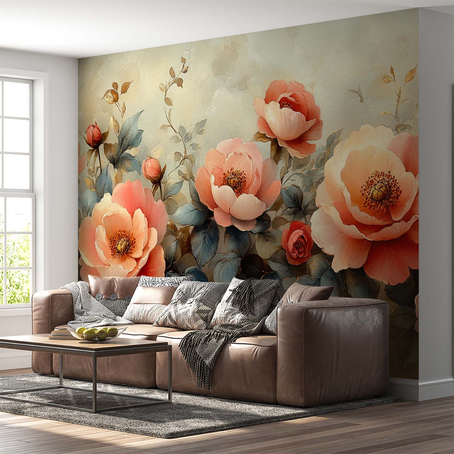 Zachte roze en oranje rozen dansen harmonieus over een warme lichtbruine achtergrond. Deze levendige bloemenpracht straalt rust en vreugde uit, alsof een zomertuin je muur siert. De uitgebalanceerde compositie brengt elegantie en natuurlijke schoonheid in elke ruimte, perfect voor een serene sfeer in woonkamer of slaapkamer.