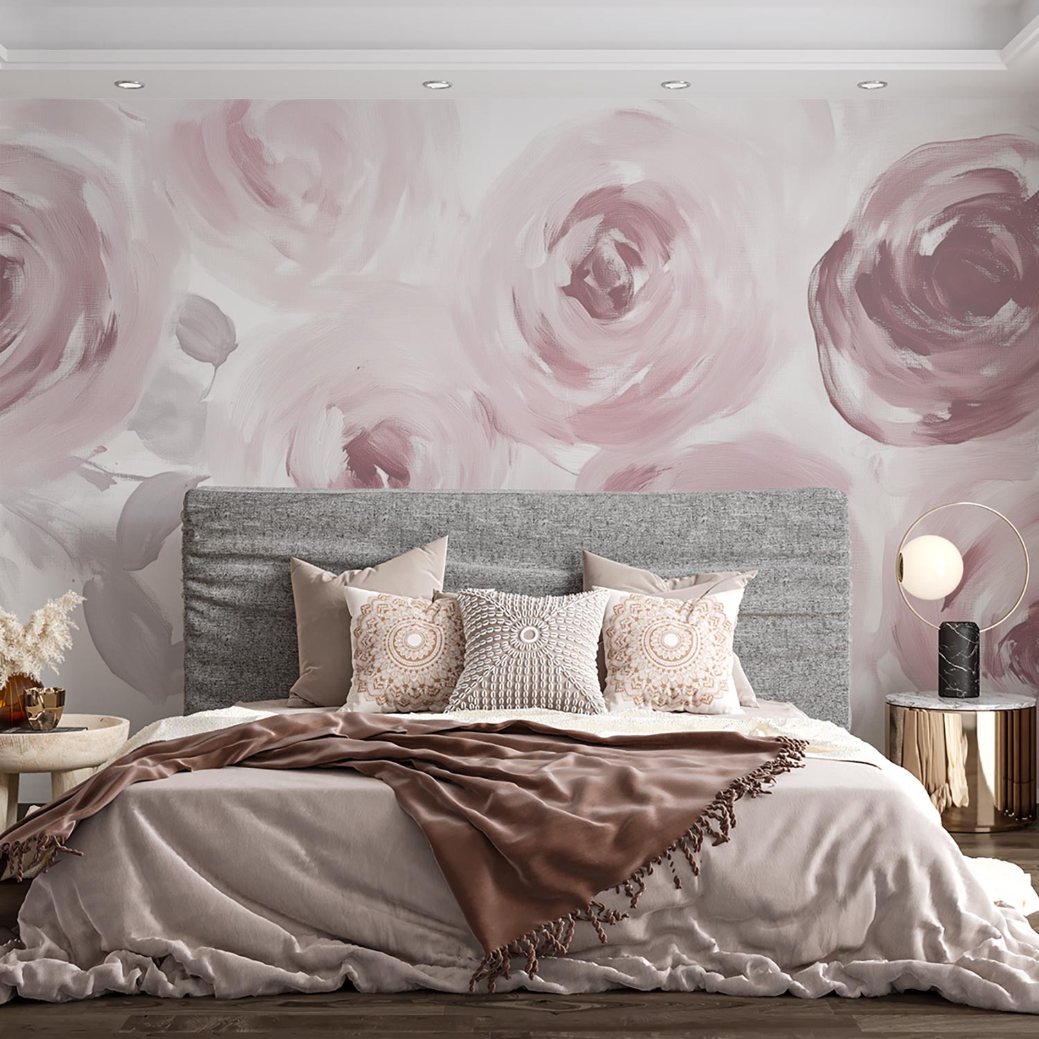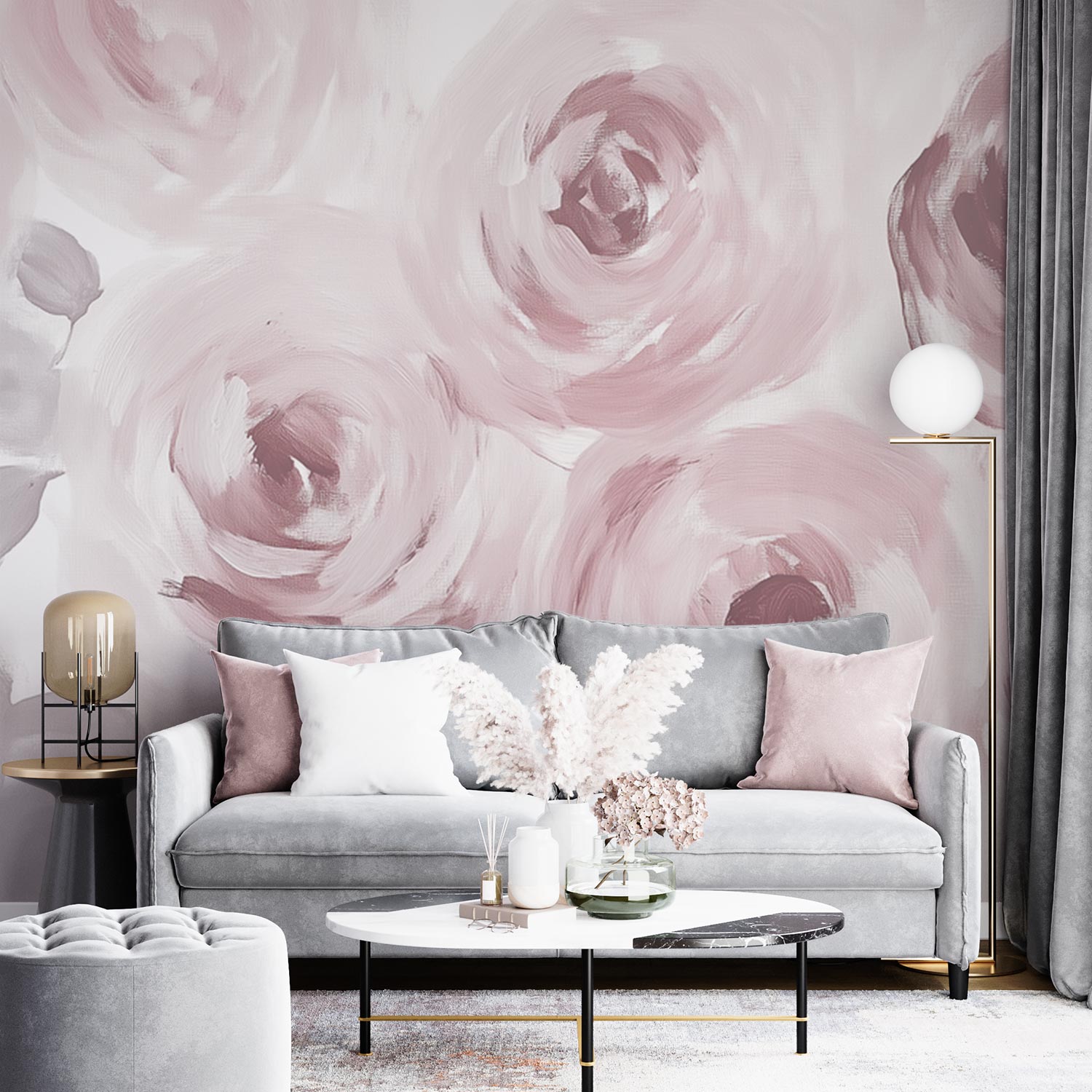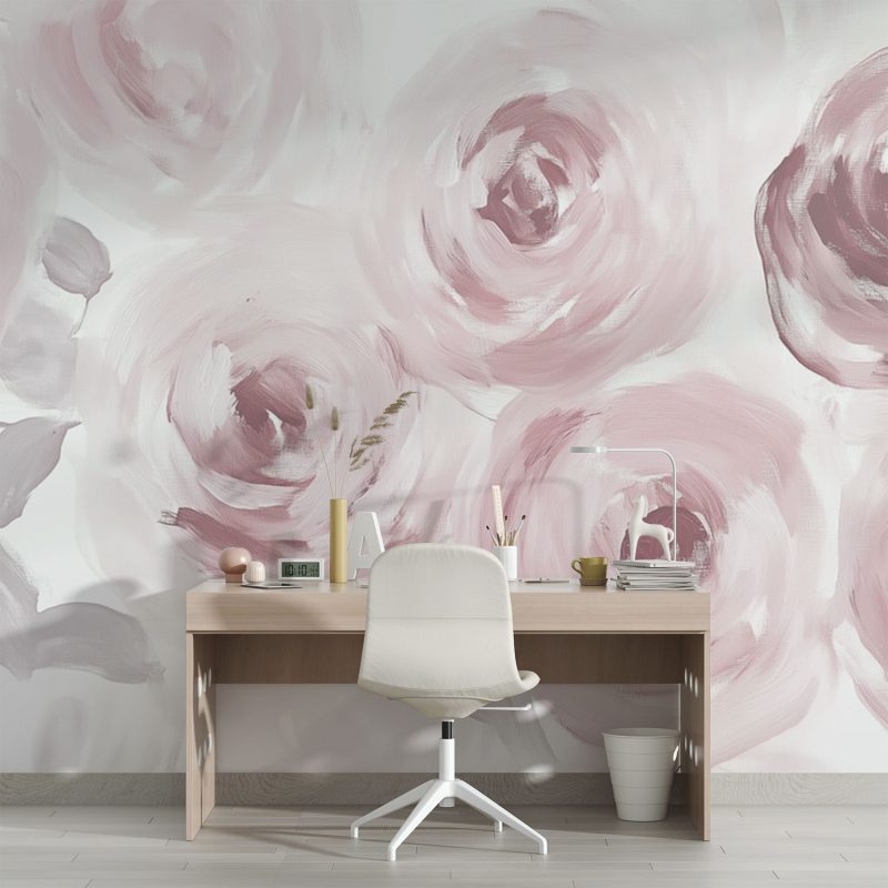 Zachte roze en witte rozen dansen in een vloeiende beweging over het behang, waarbij overlappende bloemen een speelse diepte creëren. De losse penseelstreken geven elk bloemblad levendigheid en emotie, perfect voor een romantische en serene sfeer in je huis. Dit behang brengt de tijdloze elegantie van een bloeiende tuin binnen, ideaal om elke ruimte met natuurlijke gratie te verrijken.