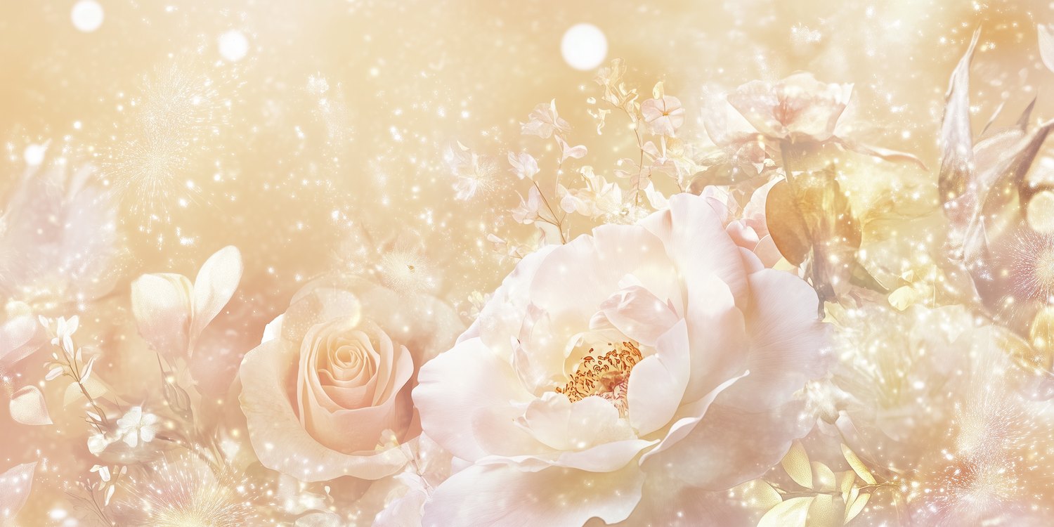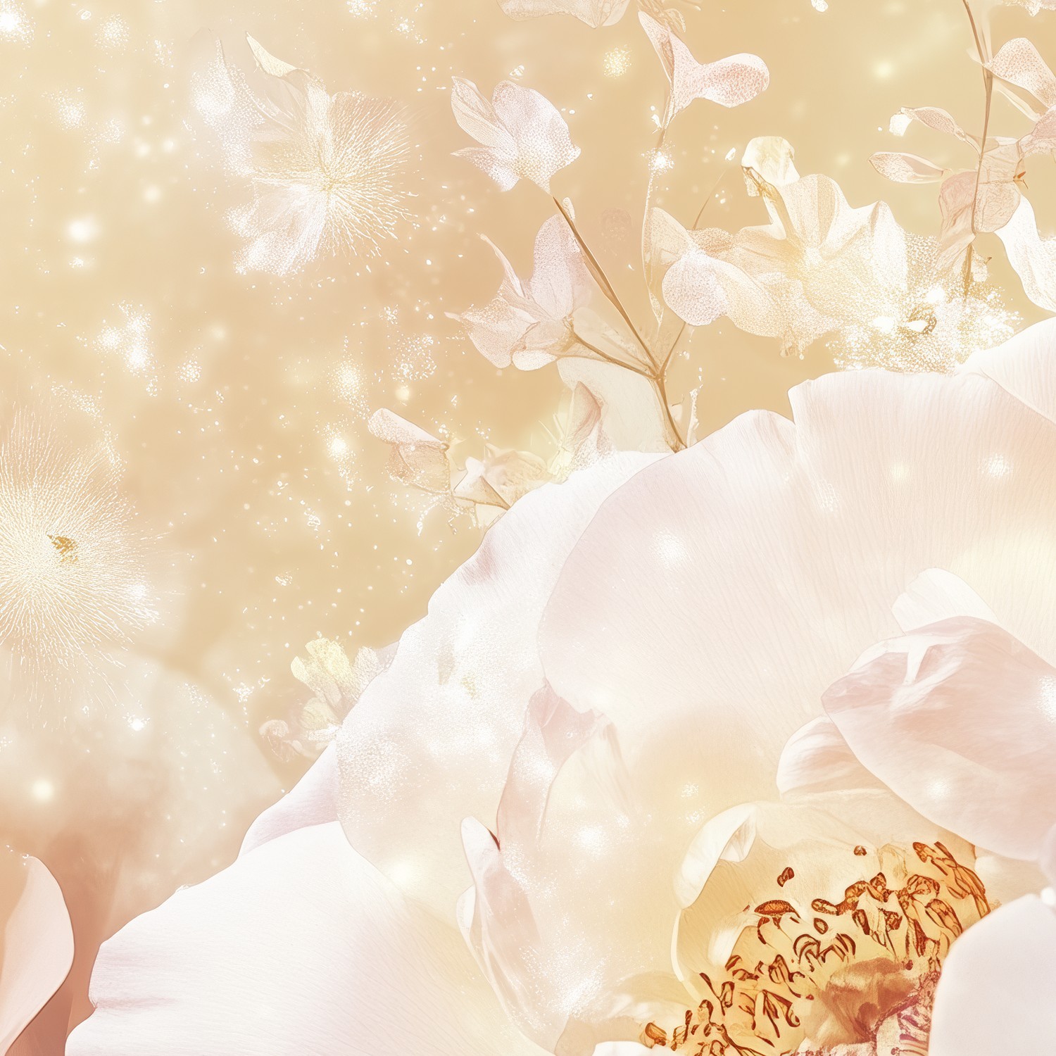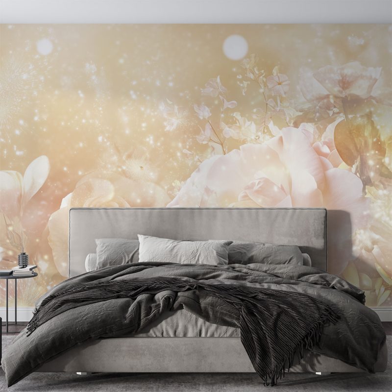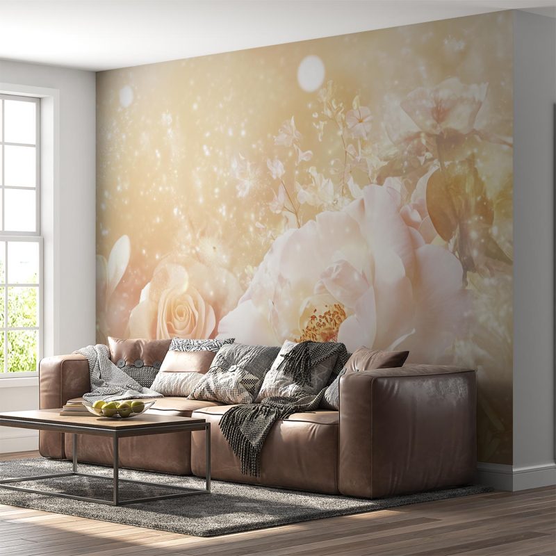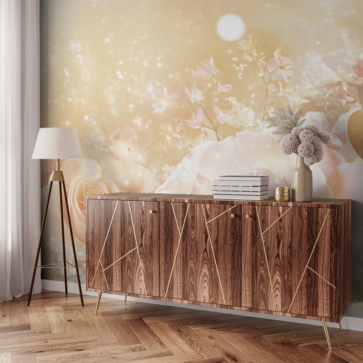 Zachte roze en witte rozen dansen over een warm gouden fond. Bloesems en takken weven een romantisch tapijt vol sereniteit. Deze levendige bloemenpracht brengt rust en elegantie in elke ruimte, perfect voor een serene sfeer in huis.