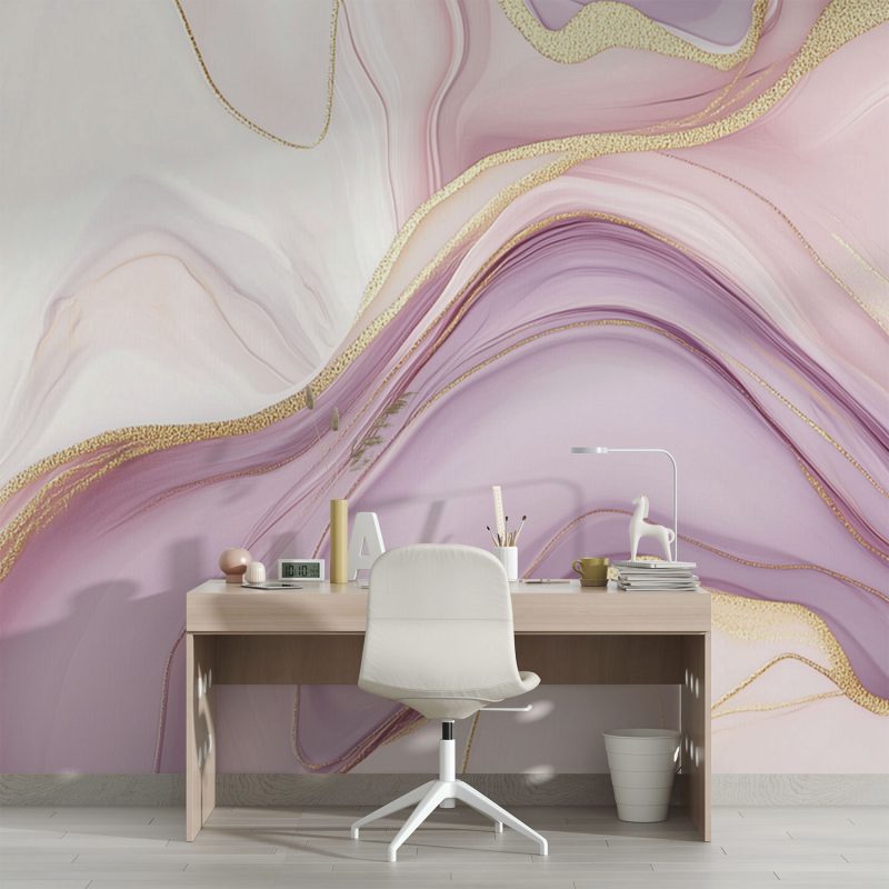 Roze en witte tinten dansen in elegante spiralen over de muur, verrijkt met subtiele gouden accenten. Deze levendige beweging creëert een gevoel van diepte en rust, alsof je naar een kalme wervelwind kijkt. Perfect voor een serene sfeer in moderne ruimtes, waar de vloeiende vormen harmonie brengen en de ruimte optisch vergroten met hun dynamische energie.