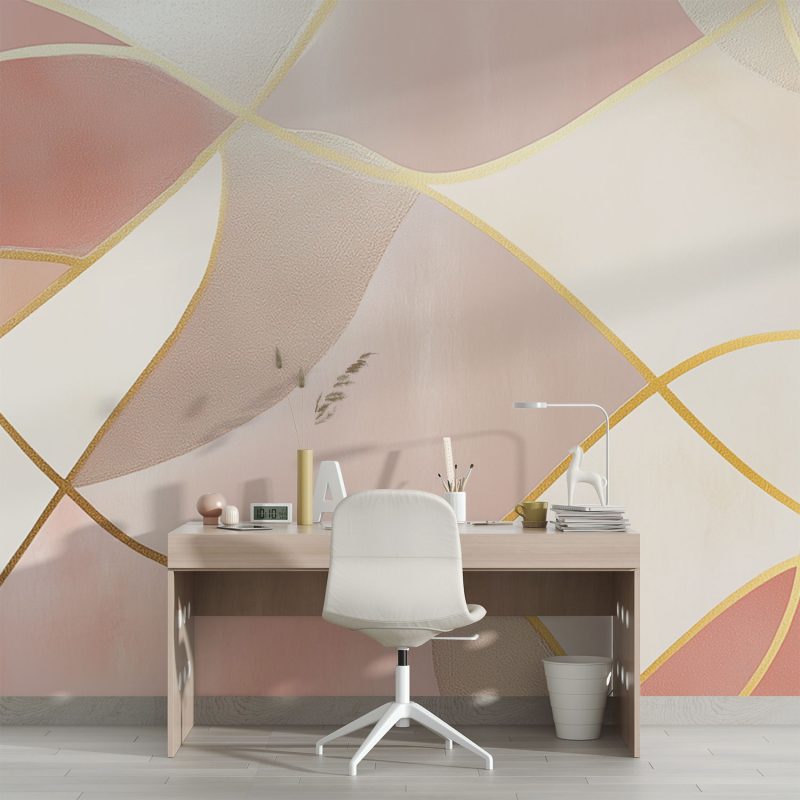 Vibrante roze en witte tinten dansen over het oppervlak, verrijkt met gouden accenten die elegantie uitstralen. Abstracte lijnen en vormen creëren een gevoel van dynamische beweging, vol energie en levendigheid. Deze warme, uitnodigende sfeer brengt luxe en moderniteit in elk interieur, perfect voor wie verfijning zoekt met een speelse twist.