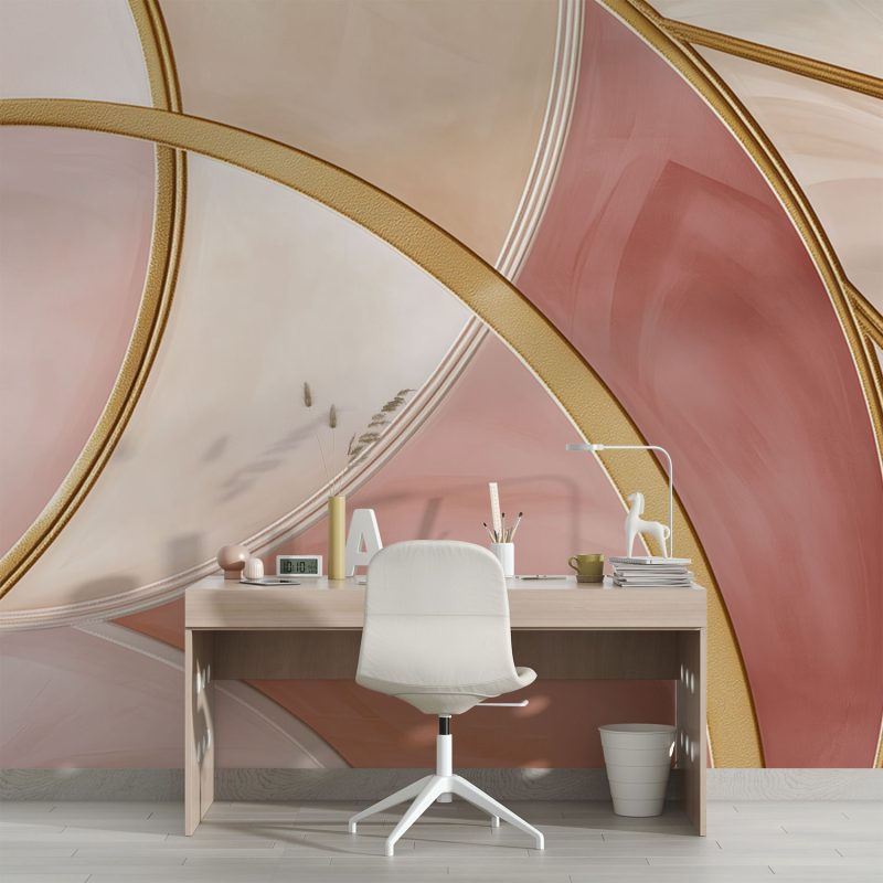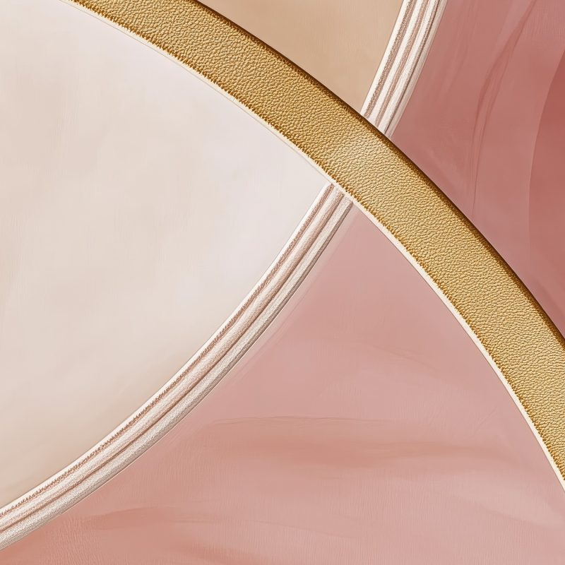 Zachte roze en gouden cirkels dansen in harmonieuze lagen, verbonden door vloeiende lijnen die diepte en beweging suggereren. Dit abstracte patroon straalt rust en verfijning uit, terwijl de warme metallic accenten een vleugje luxe toevoegen. Perfect voor een serene woonruimte waar elegantie en balans centraal staan.