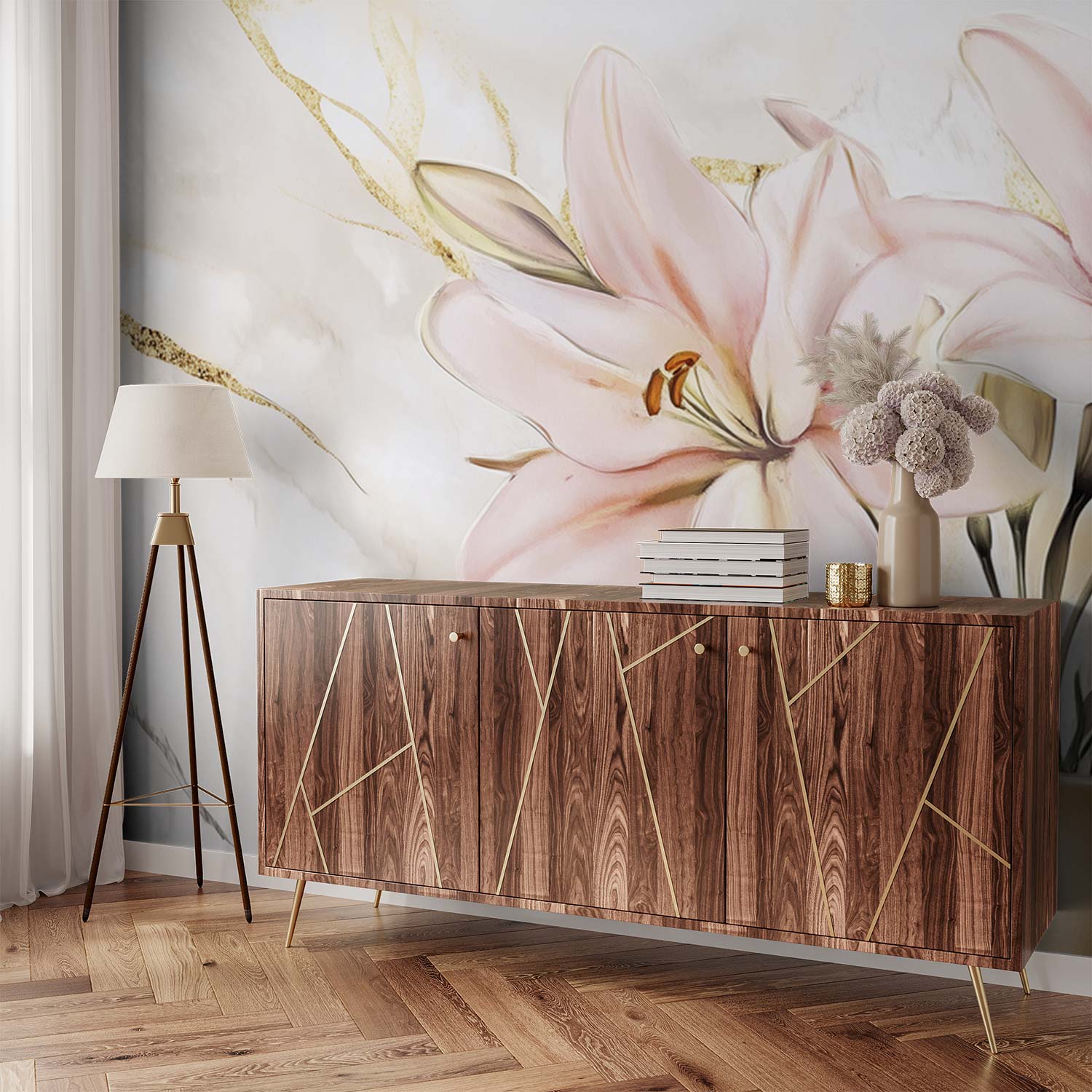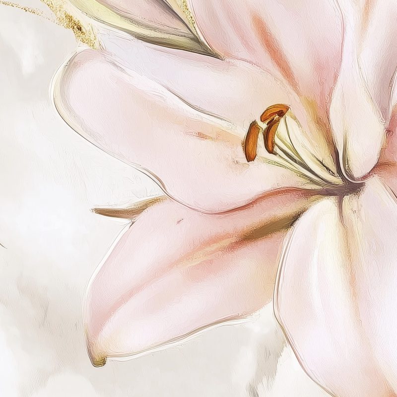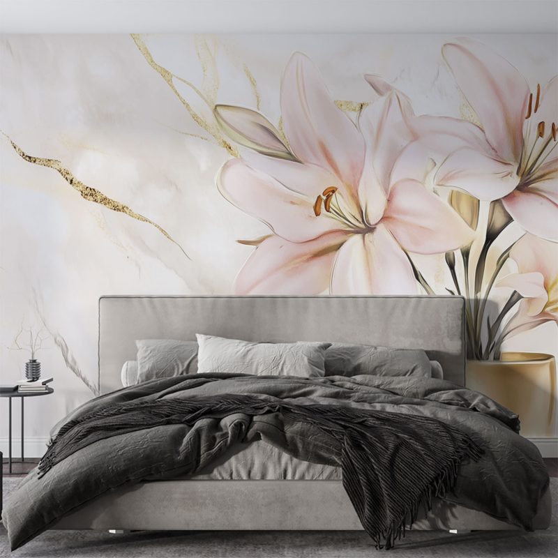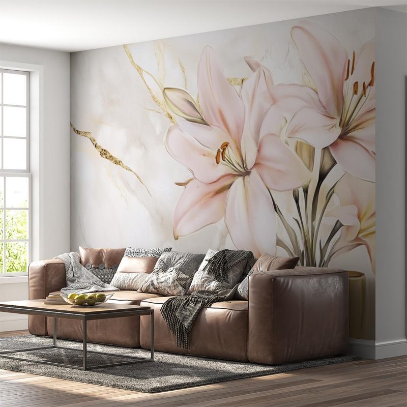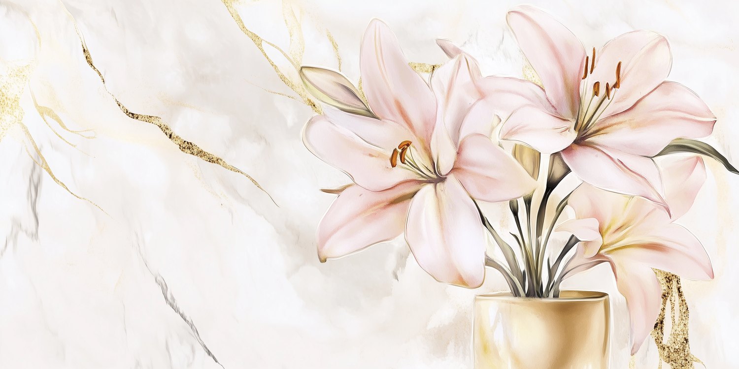 Zachte roze lelies dansen elegant in een vaas op een marmeren ondergrond. Hun levendige kleuren springen eruit tegen de lichte achtergrond, wat een gevoel van frisse sereniteit brengt. Dit behang brengt tijdloze elegantie en natuurlijke schoonheid in je interieur, perfect voor een rustige en stijlvolle sfeer in elke kamer.