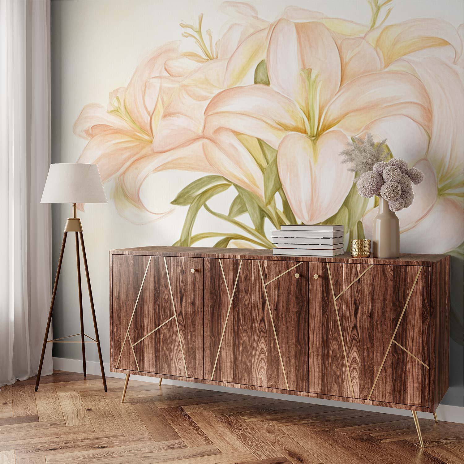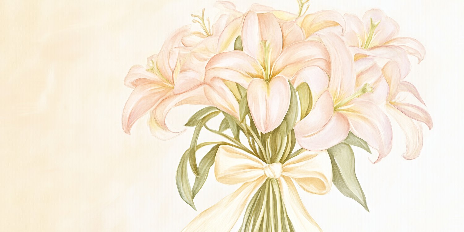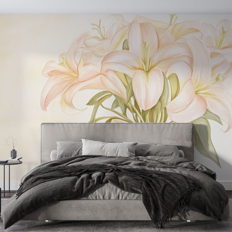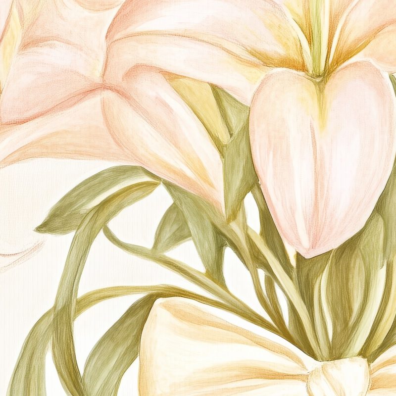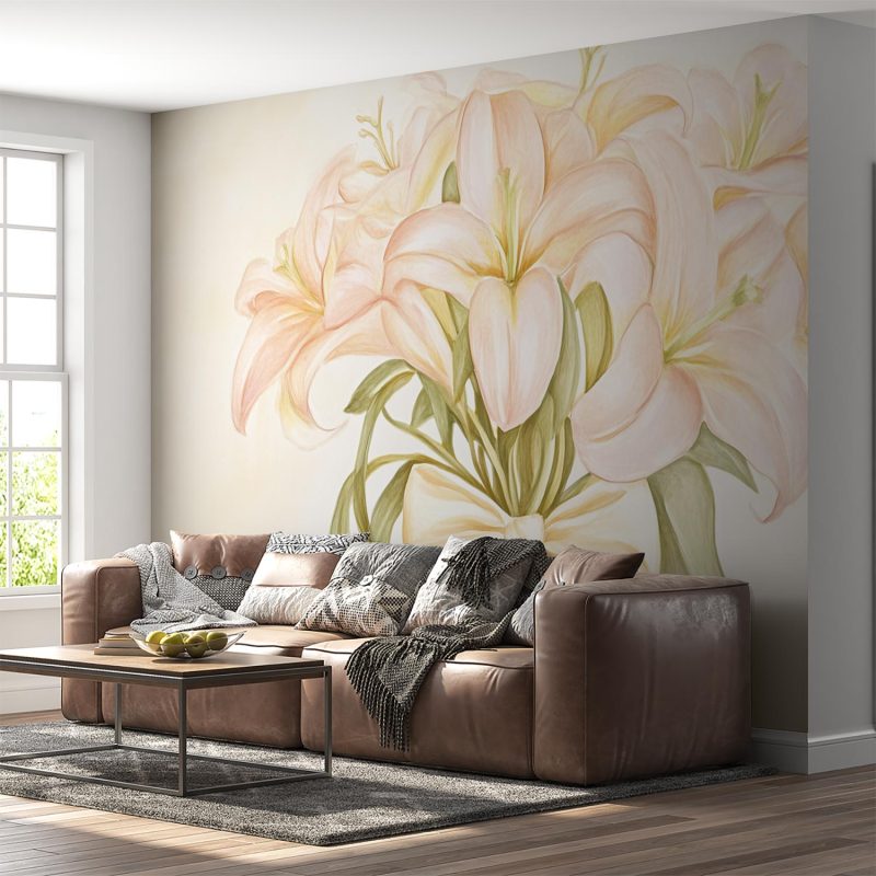 Zachte roze lelies dansen in een vaas, omgord door zonnige strikken. Hun levendige kleuren spatten van het lichte beige, een vrolijk feest voor het oog. Deze tijdloze elegantie brengt warmte en viering in elke ruimte. Perfect voor wie verfijning zoekt met een speelse twist. Het behang ademt rust en vreugde, en transformeert je muur in een kunstwerk dat altijd blij maakt.