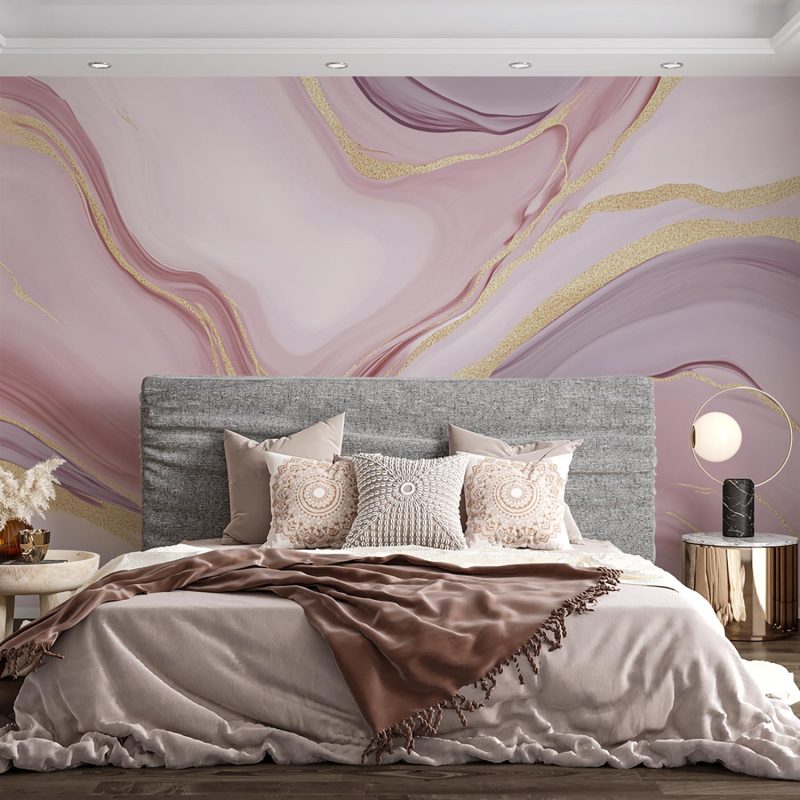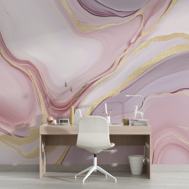 Betoverend roze en paars dansen in elegante marmeren aders, verrijkt met gouden accenten. Deze levendige, vloeiende beweging creëert een serene sfeer vol harmonie. Perfect voor interieurs waar rust en verfijning samenkomen, dit behang brengt tijdloze schoonheid en kalmerende energie in elke ruimte.