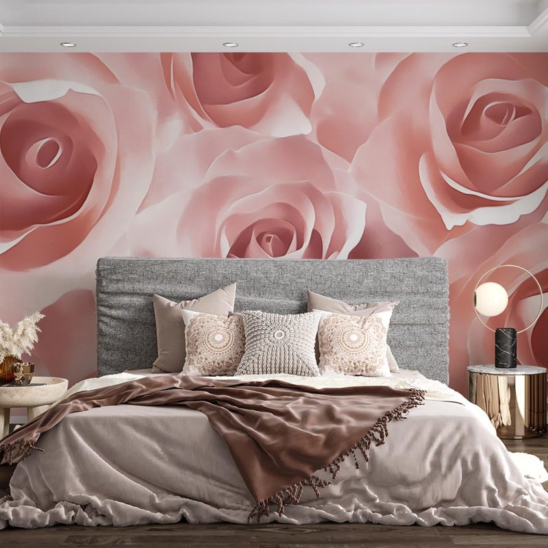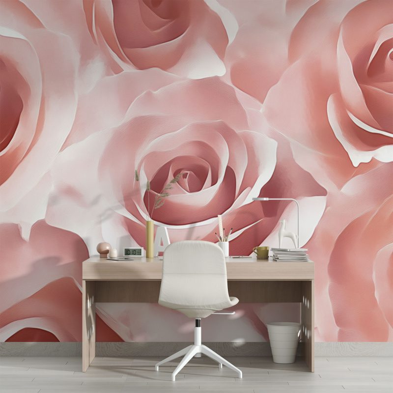 Zachte roze rozen dansen in een harmonieuze compositie, hun delicate blaadjes overlappend in een tijdloos patroon. Subtiele witte en gele accenten versterken de romantische sfeer, terwijl de volle bloemenpracht rust en sereniteit uitstraalt. Dit behang brengt de kalmerende schoonheid van de natuur in huis en creëert een liefdevolle, gebalanceerde sfeer in elke ruimte.