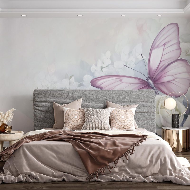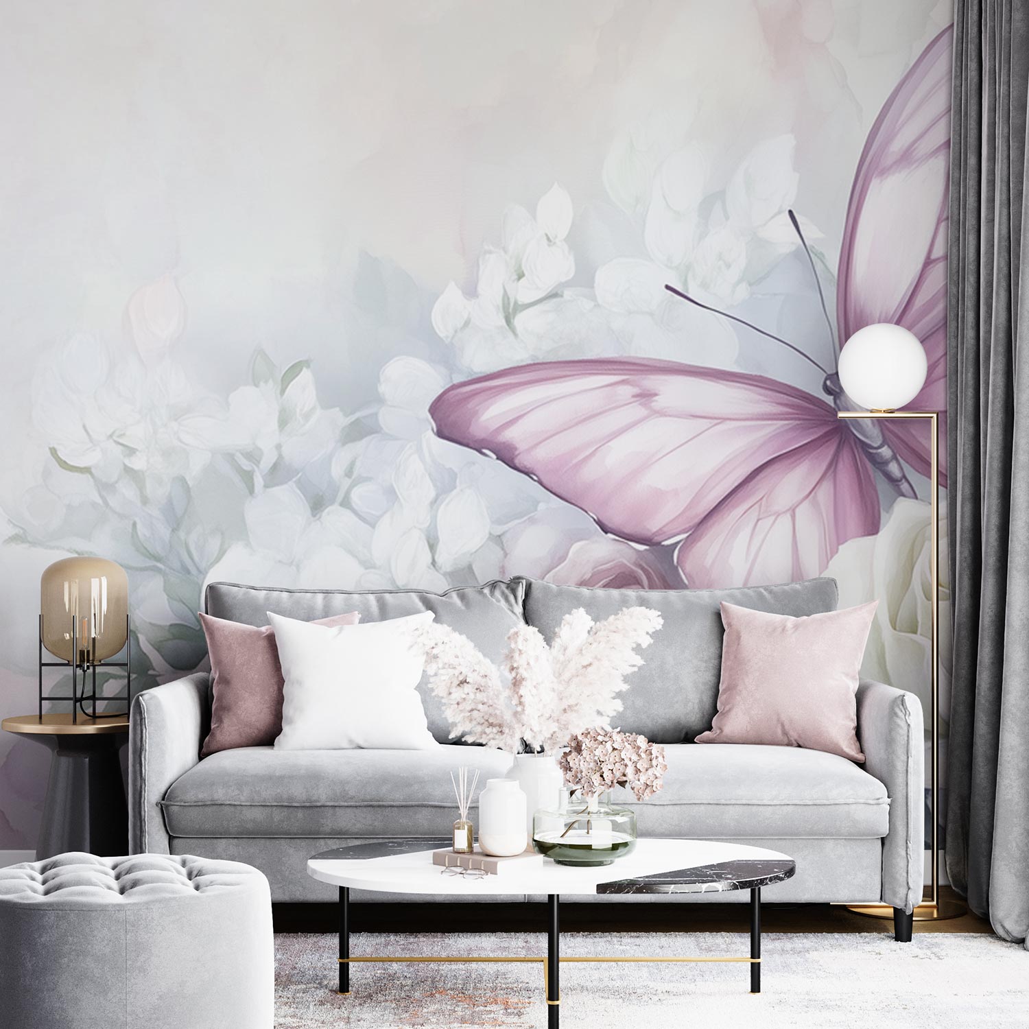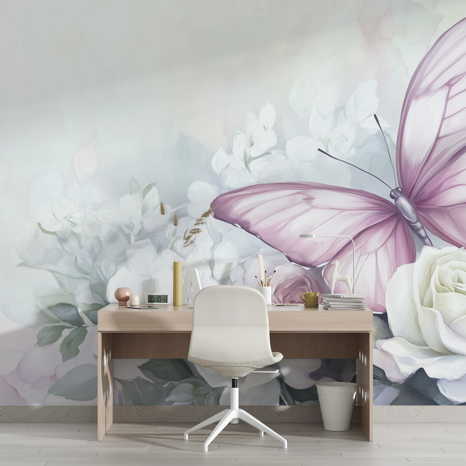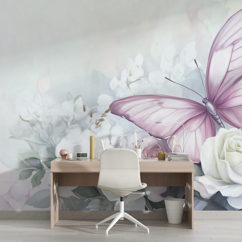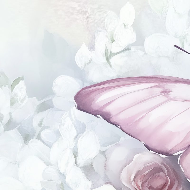 Verfijnde roze en witte bloemen dansen rond een levendige paarse vlinder die het tafereel tot leven wekt. Deze harmonieuze compositie brengt een gevoel van sereniteit en beweging in je ruimte, perfect voor een rustgevende sfeer in slaapkamers of woonkamers. De uitgebalanceerde kleuren creëren een tijdloze elegantie die zowel verfijnd als toegankelijk aanvoelt.