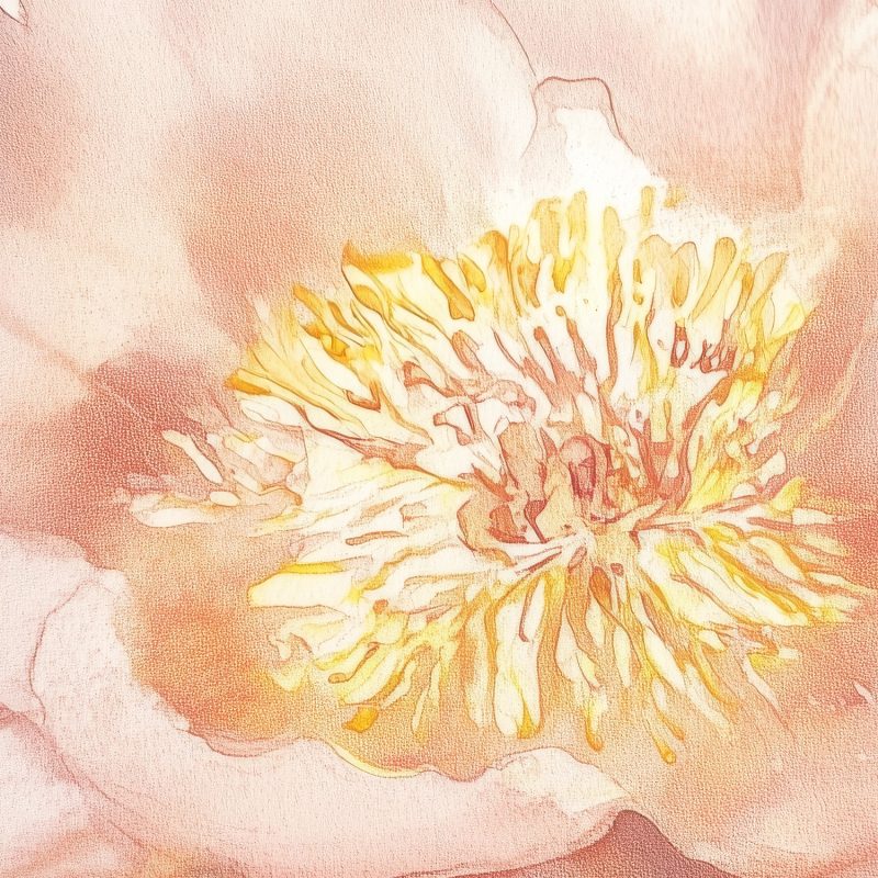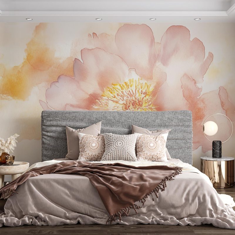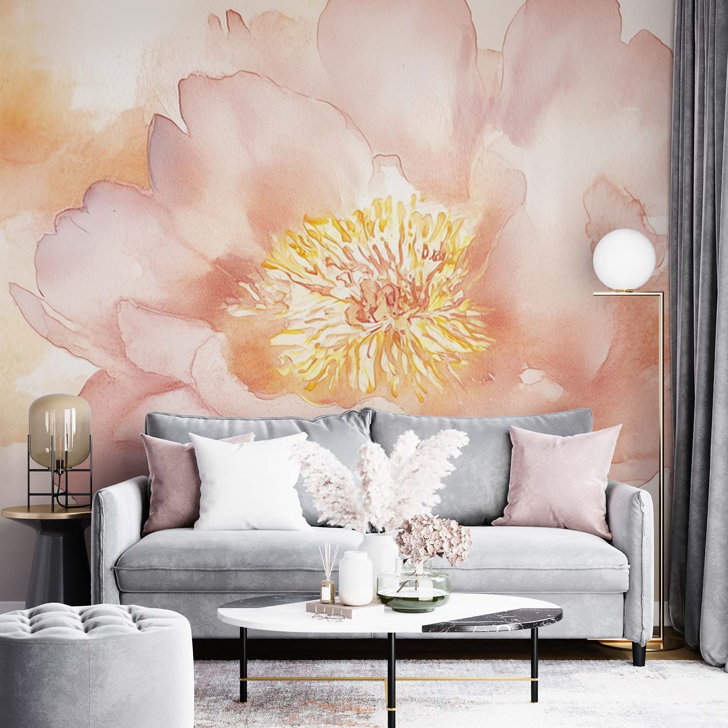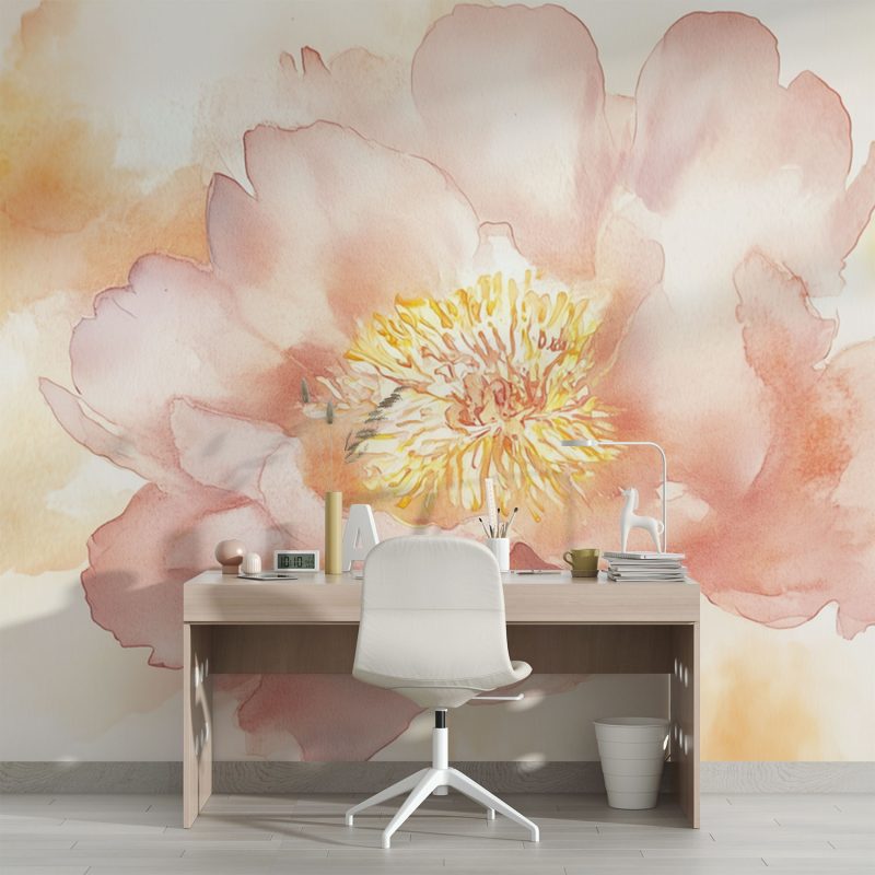 Zachte penseelstreken dansen over het behang en toveren een weelderige roze bloem met een zonnig hart tevoorschijn. De levendige waterverfkleuren zweven op een warm beige fond, alsof ze net zijn neergedaald. Dit dromerige kunstwerk brengt een serene sfeer in je ruimte, waar natuurlijke elegantie en moderne rust samensmelten voor een harmonieuze woonomgeving.