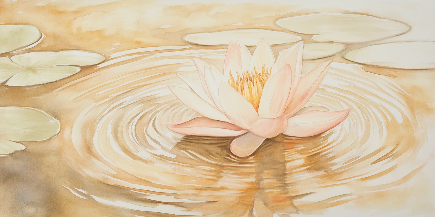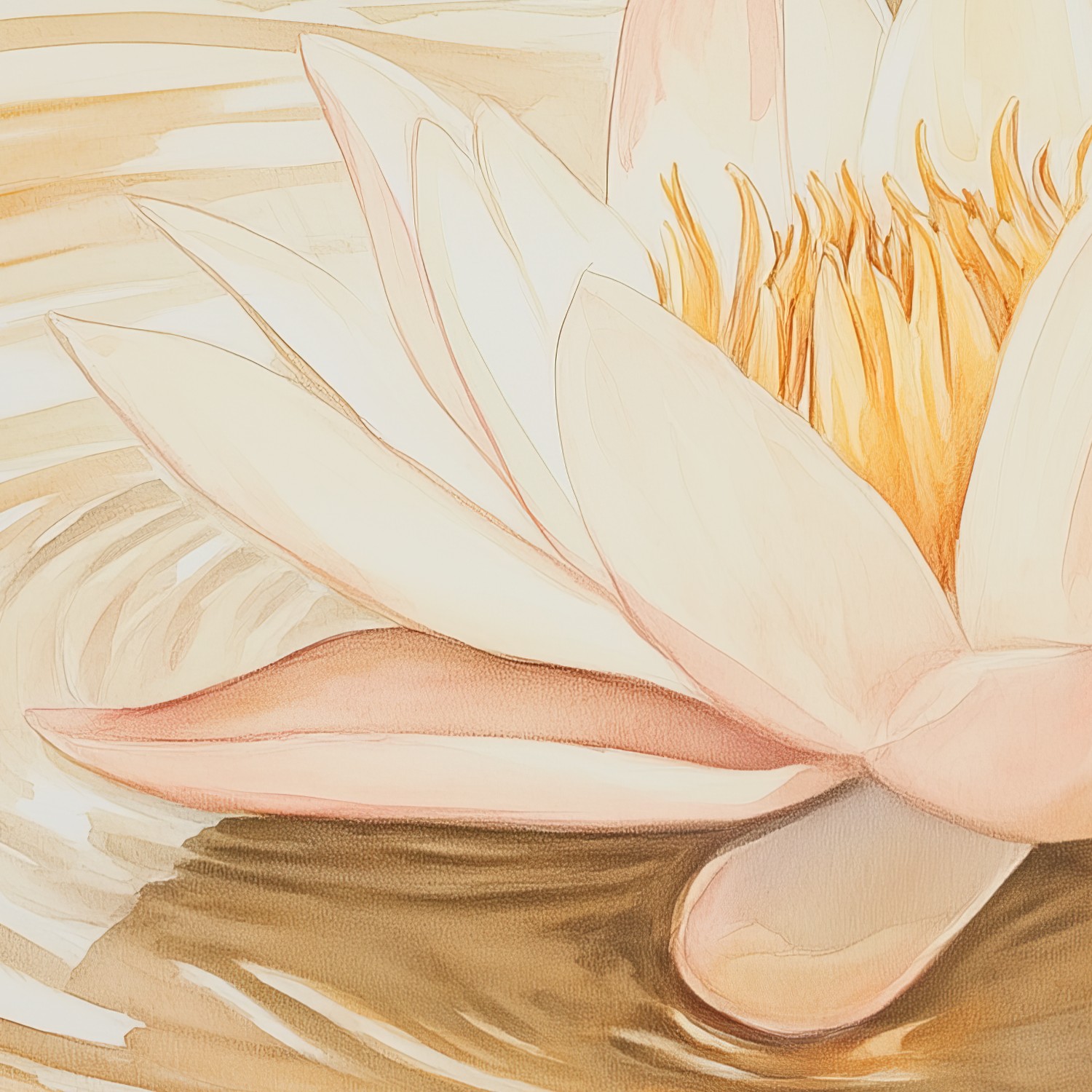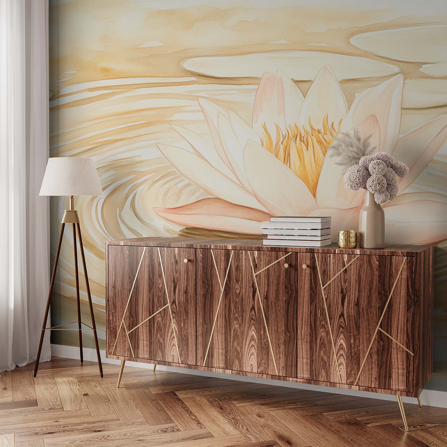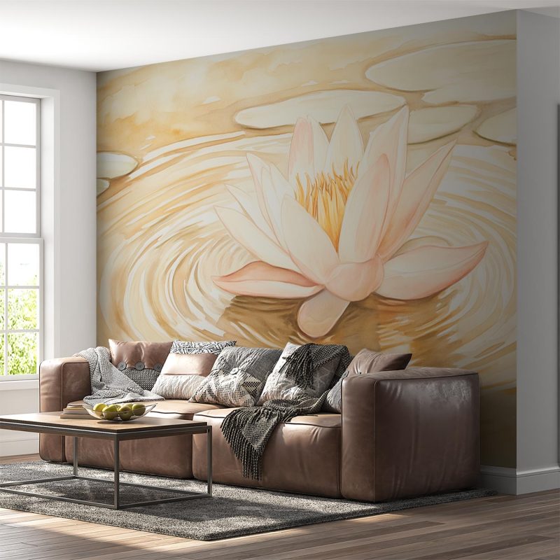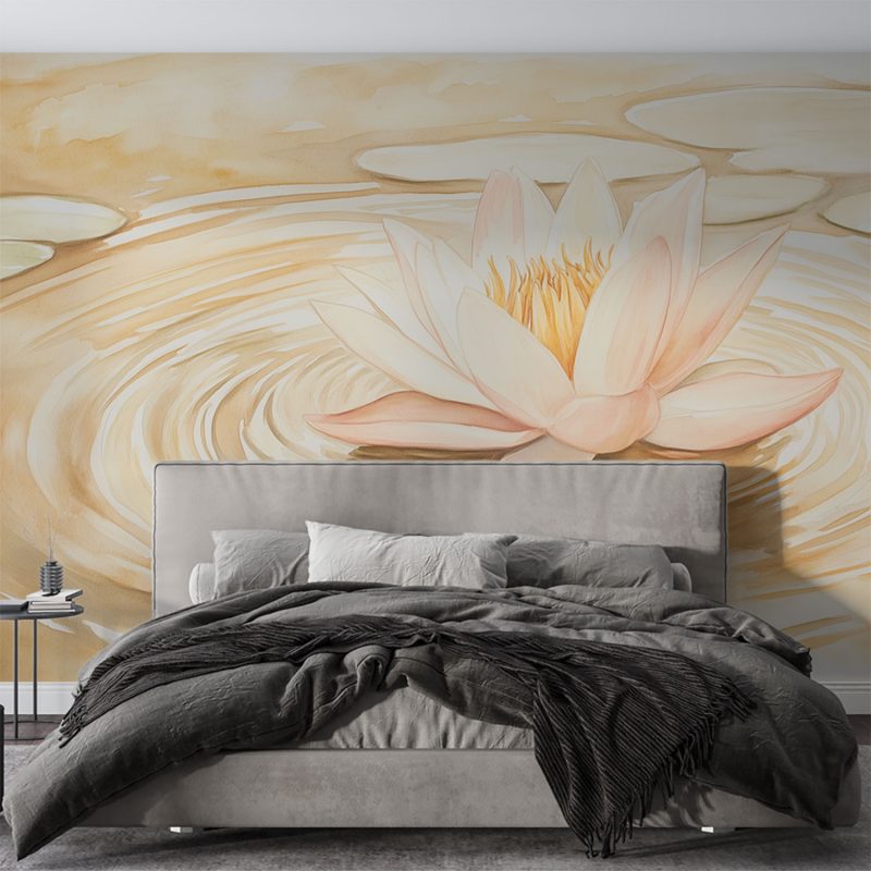 Zachte roze en gouden tinten dansen over het wateroppervlak, waar een waterlelie zich sierlijk ontvouwt. Rimpelingen stralen uit alsof de bloem net is neergedaald, en creëren een levendige maar kalme beweging. Dit behang brengt de rust van de natuur naar binnen, perfect voor een ruimte waar je even wilt ontsnappen aan de drukte.