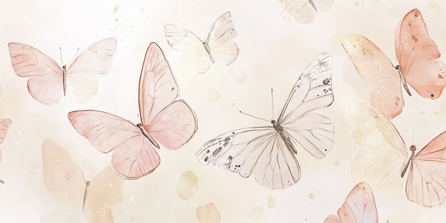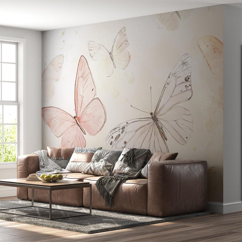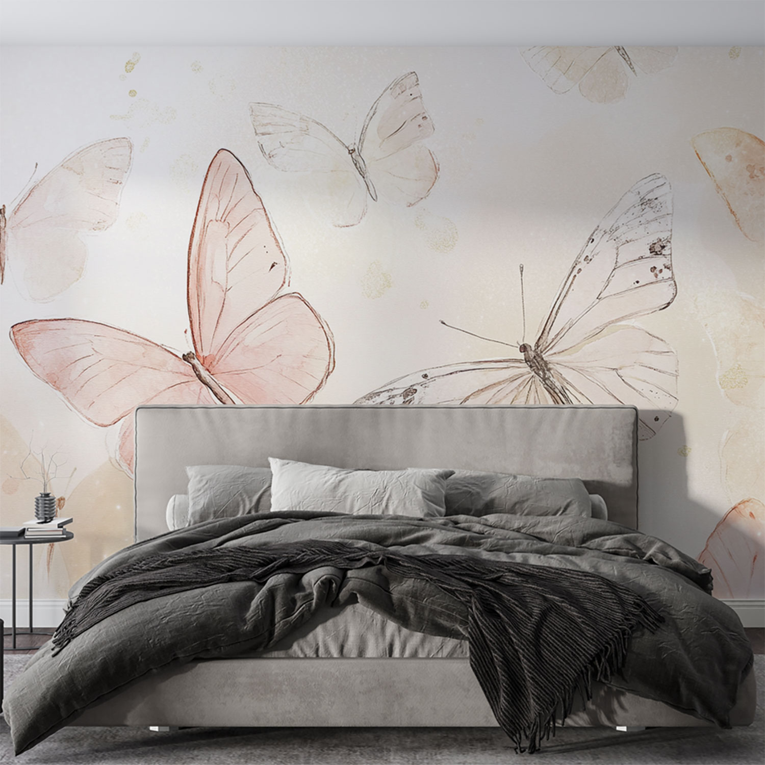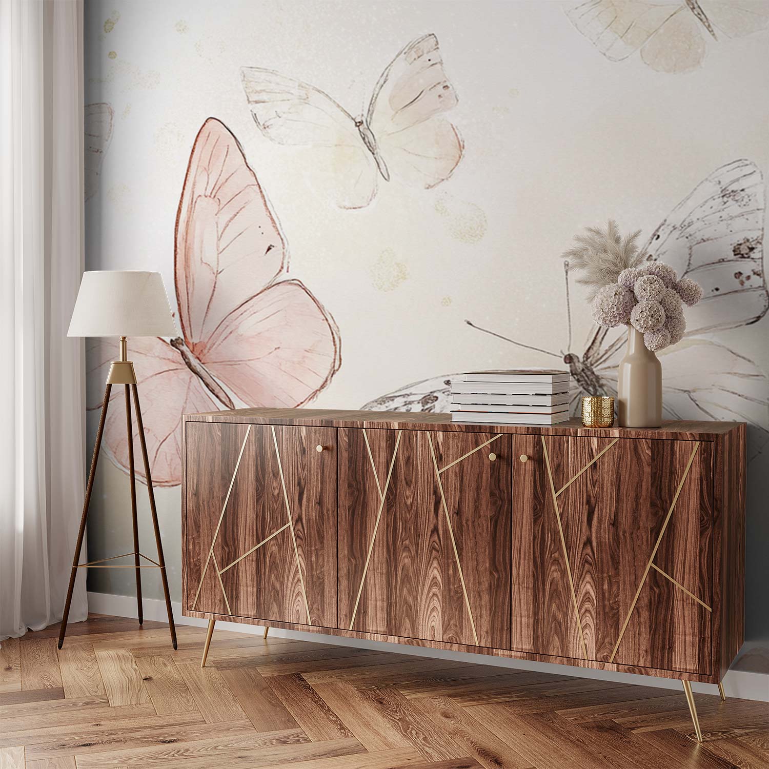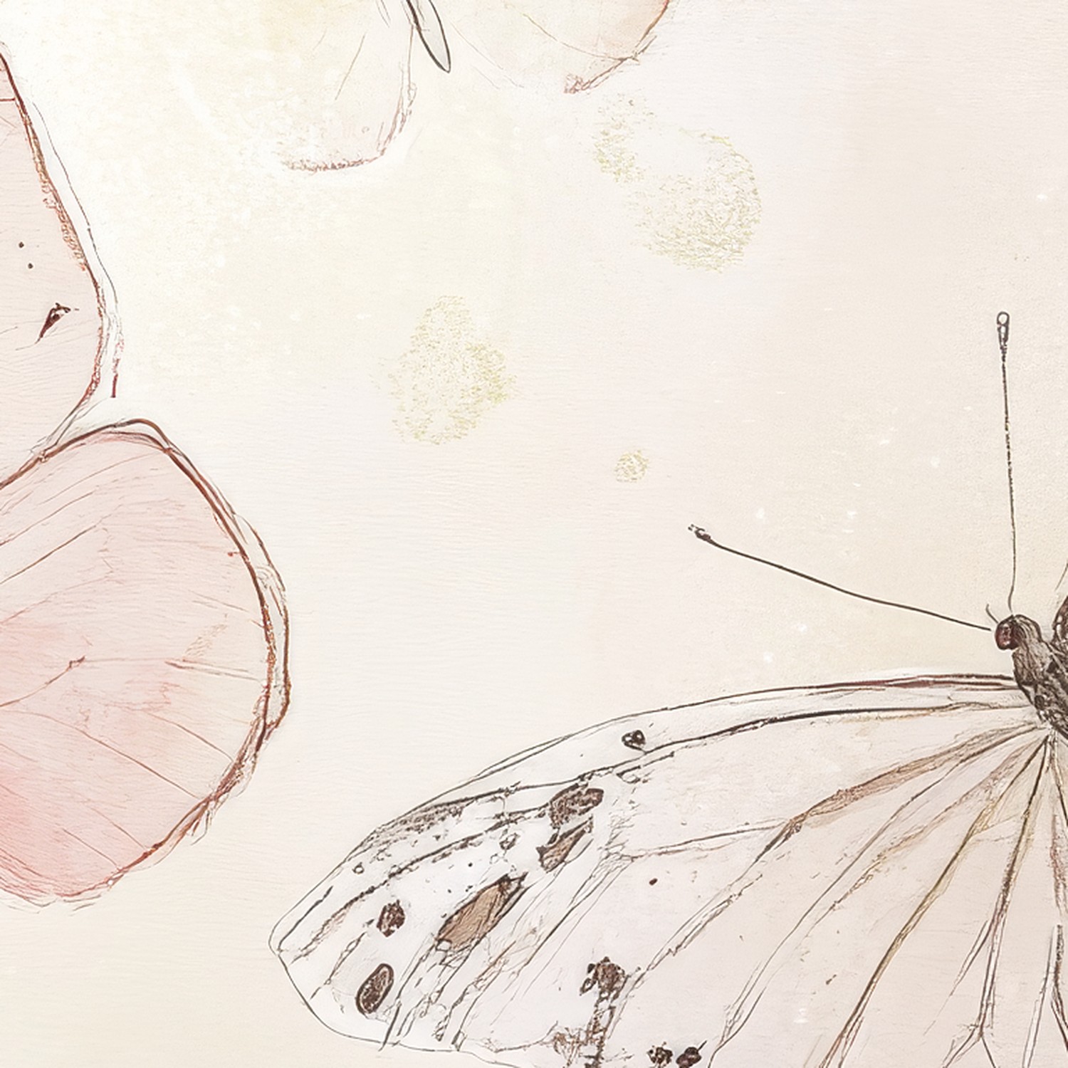Zachte vlinders dansen in roze en wit tinten over een beige achtergrond. Hun speelse beweging en variërende formaten creëren een levendige diepte. Dit serene patroon brengt elegantie en rust in elke ruimte, perfect voor een subtiel statement in moderne of klassieke interieurs. De delicate compositie voegt zachte dynamiek toe zonder overweldigend te zijn.