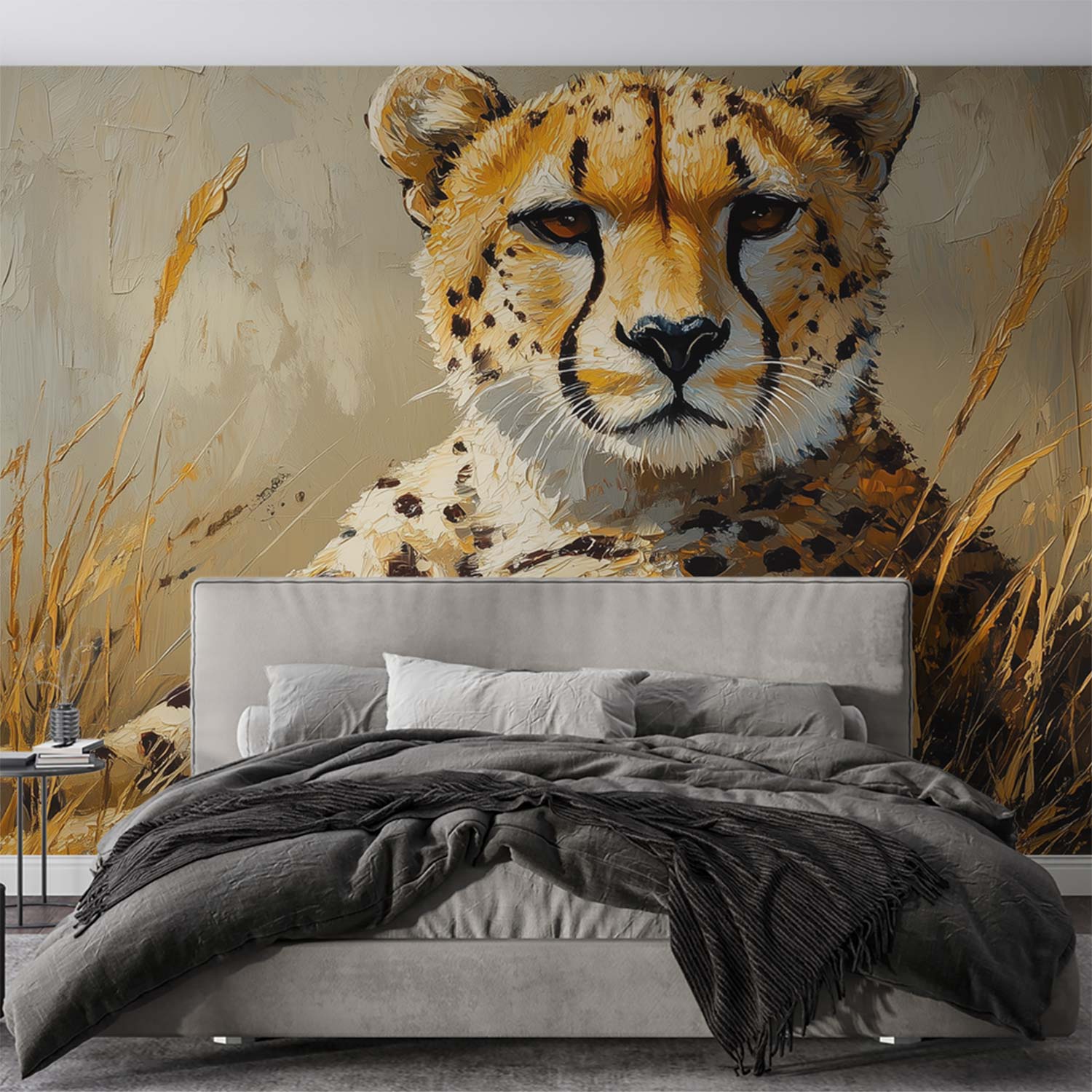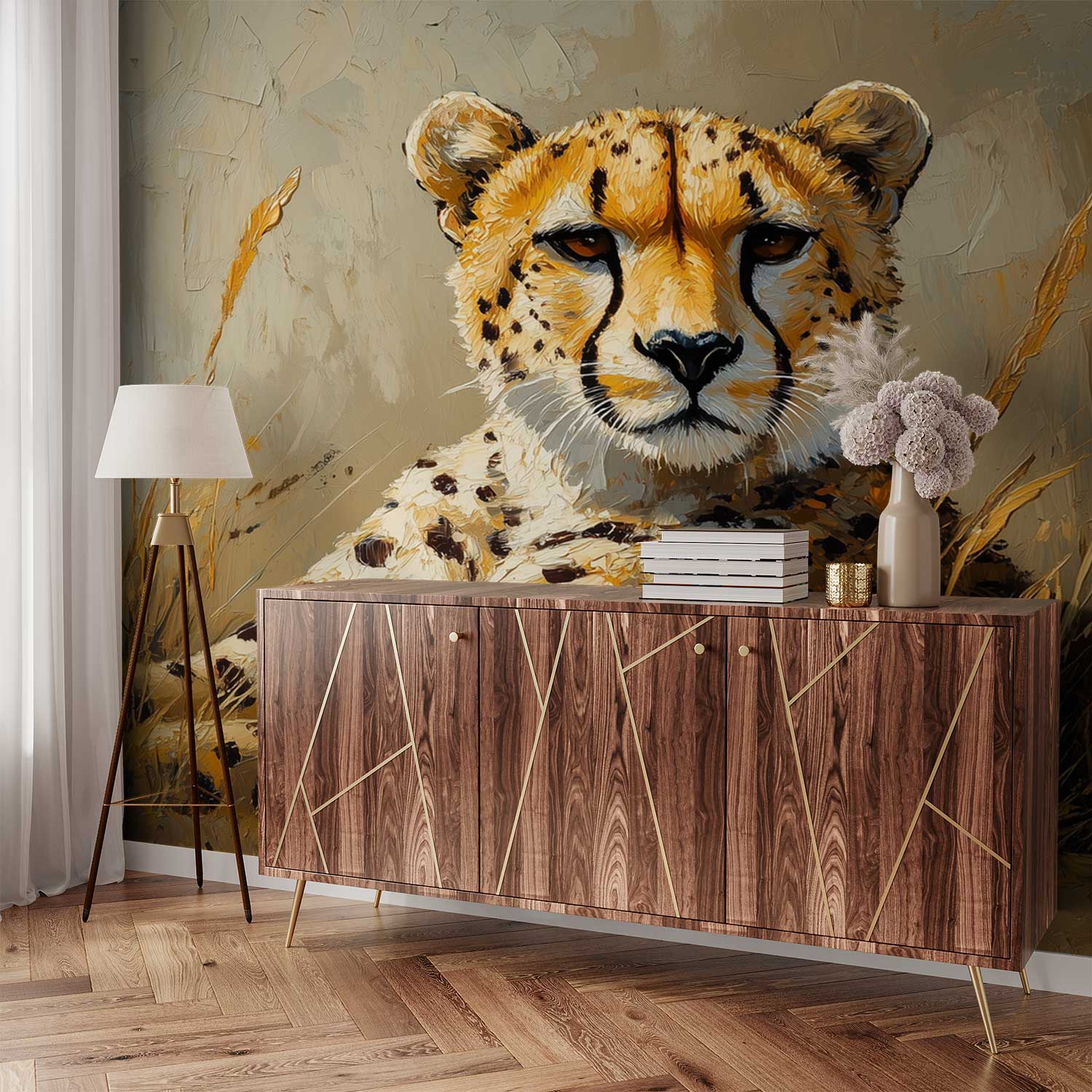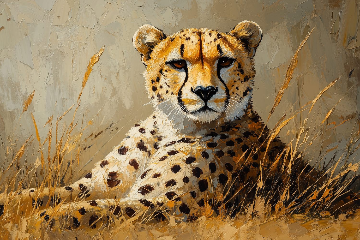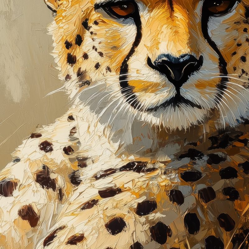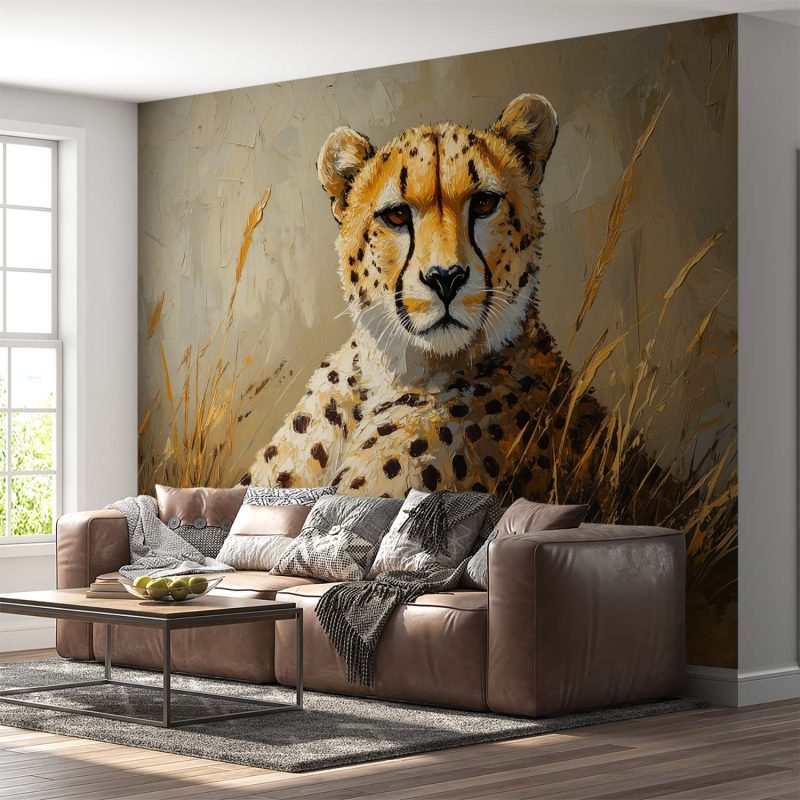 Zachte aardtinten omarmen een rustende cheetah in het gras. Zijn realistische vacht glanst subtiel terwijl hij vredig uitrust in zijn natuurlijke omgeving. Dit serene tafereel brengt een kalme, organische sfeer in je interieur en creëert een harmonieuze verbinding met de natuur. De centrale compositie trekt de blik naar dit majestueuze dier, waardoor elke ruimte transformeert tot een oase van rust.