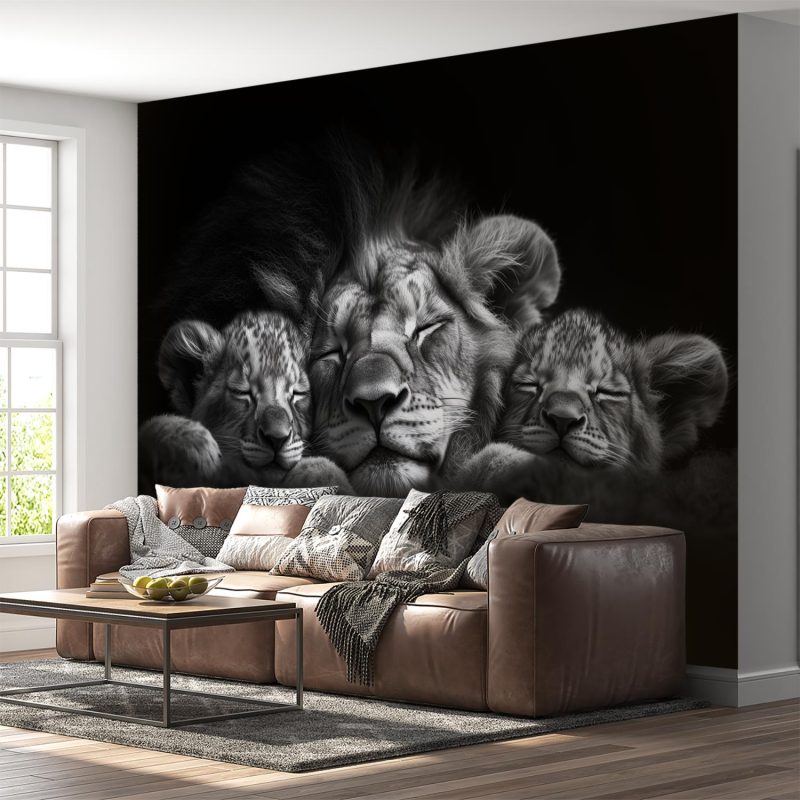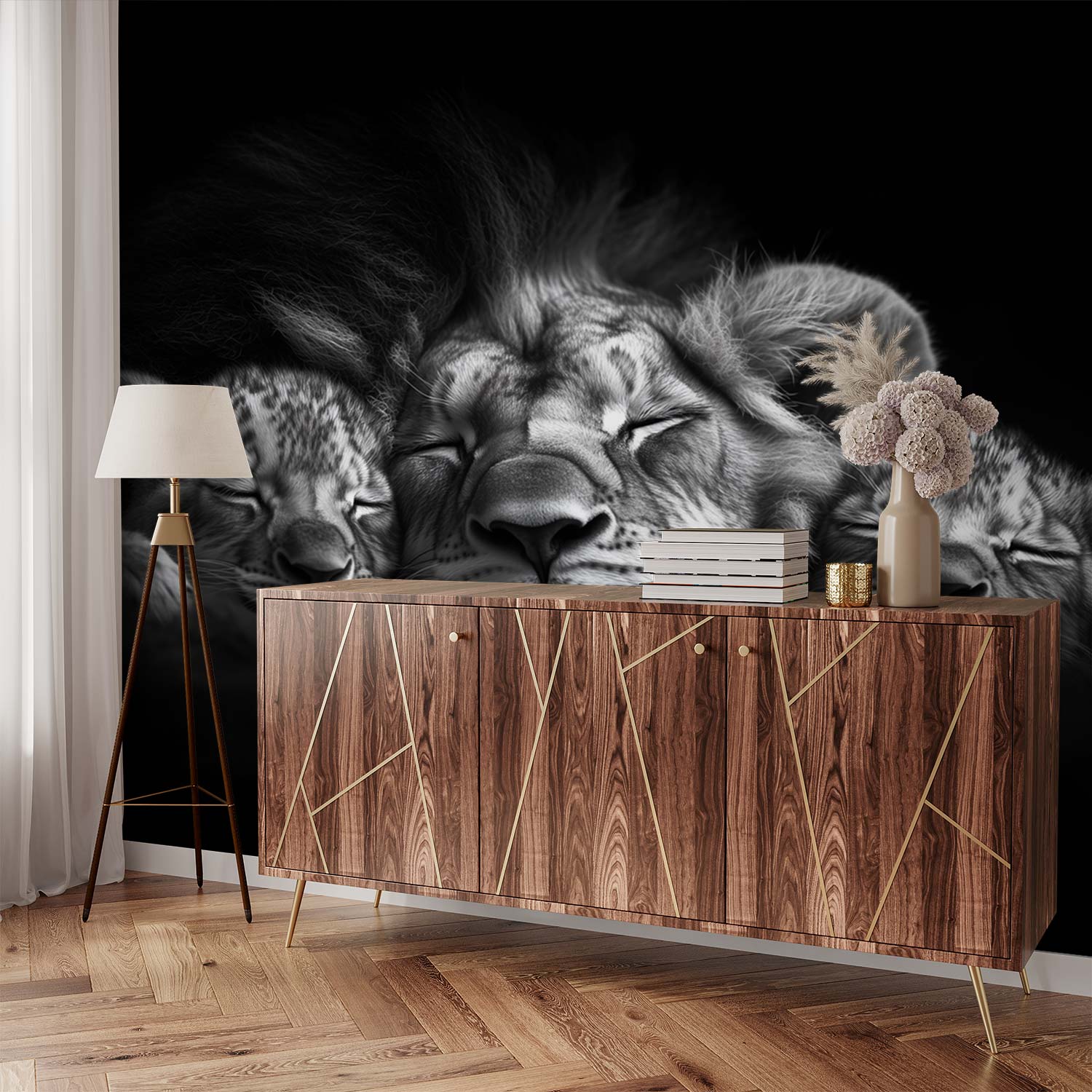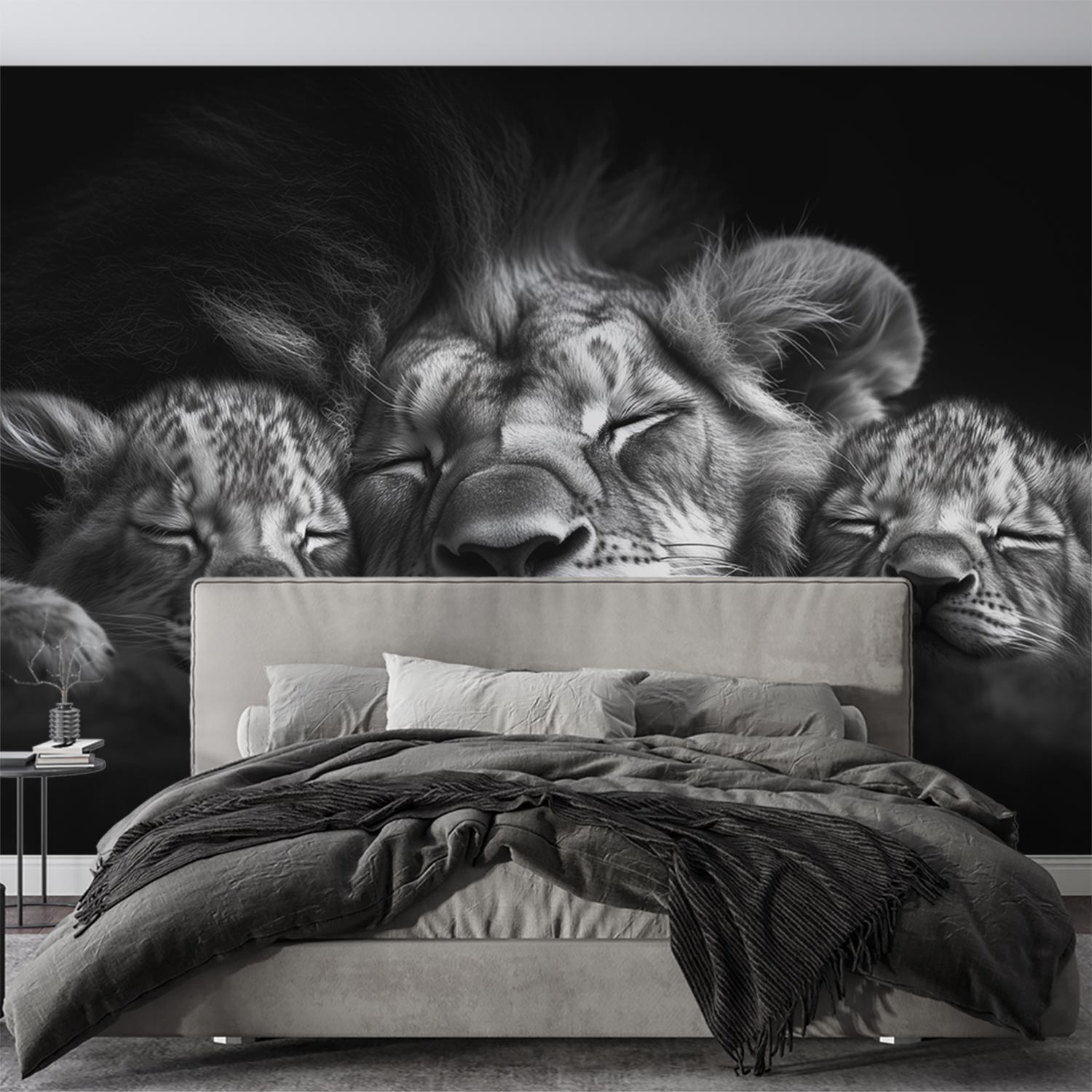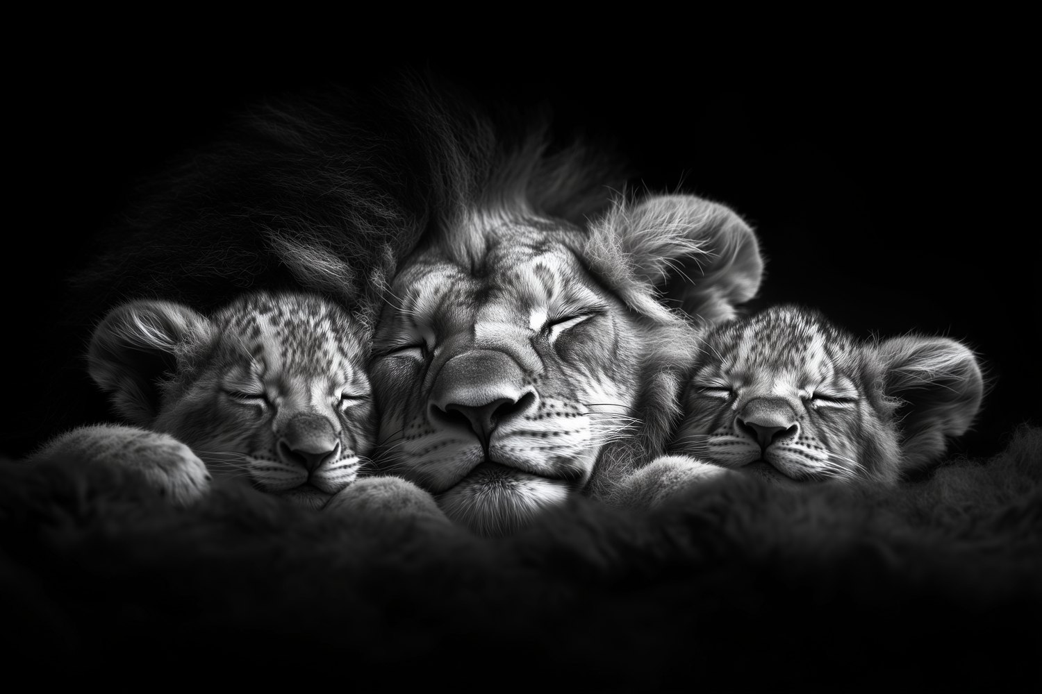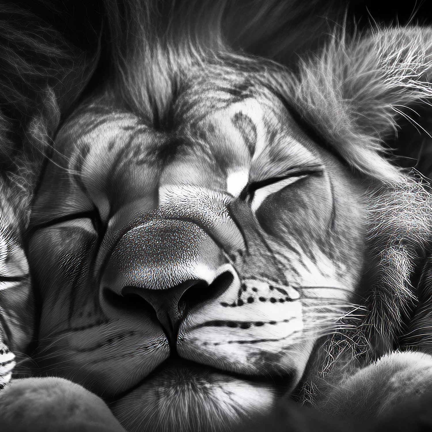 Stralend in zwart-wit rust een majestueuze leeuw, zijn gesloten ogen stralen pure rust uit. Zijn krachtige kop ligt op een zee van zachte vacht, omgeven door diepe schaduwen die drama en diepte creëren. Dit tijdloze tafereel brengt serene wildheid en awe into je interieur, een statement van rustige kracht dat elke ruimte transformeert met zijn intense, kalme aanwezigheid.