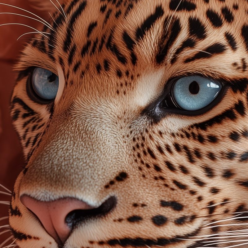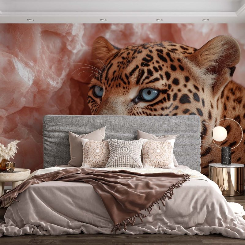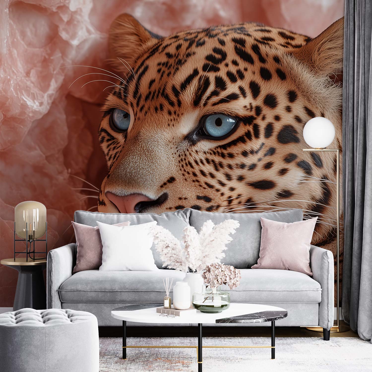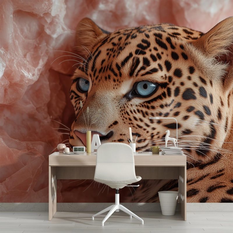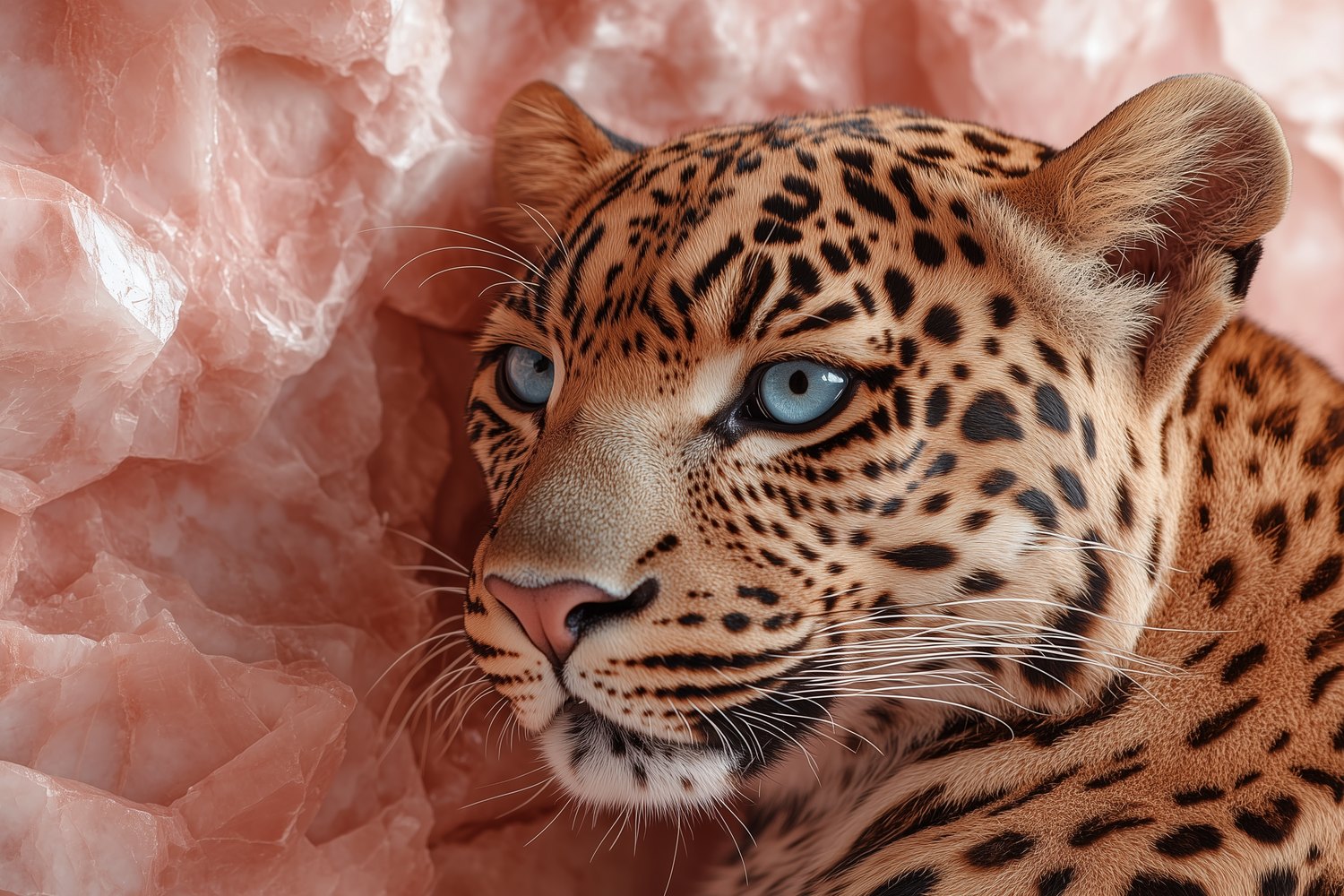 Verrast door diepblauwe ogen die je aanstaren vanuit een zee van goud en zwart. Een luipaard rust op een roze rots, zijn gespikkelde vacht bijna tastbaar. Deze serene kracht brengt wilde elegantie en kalme energie in je ruimte, perfect voor een statementmuur die zowel avontuur als harmonie uitstraalt.