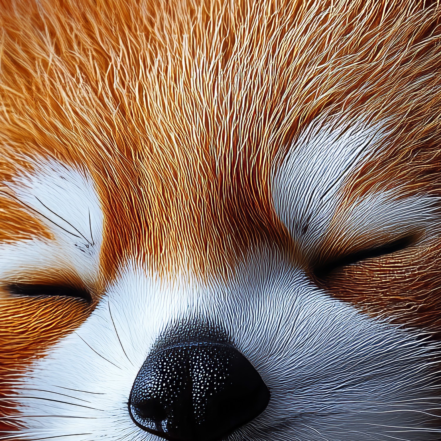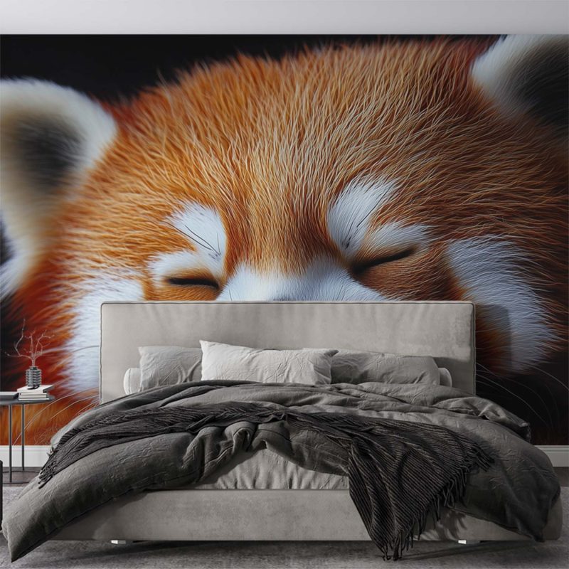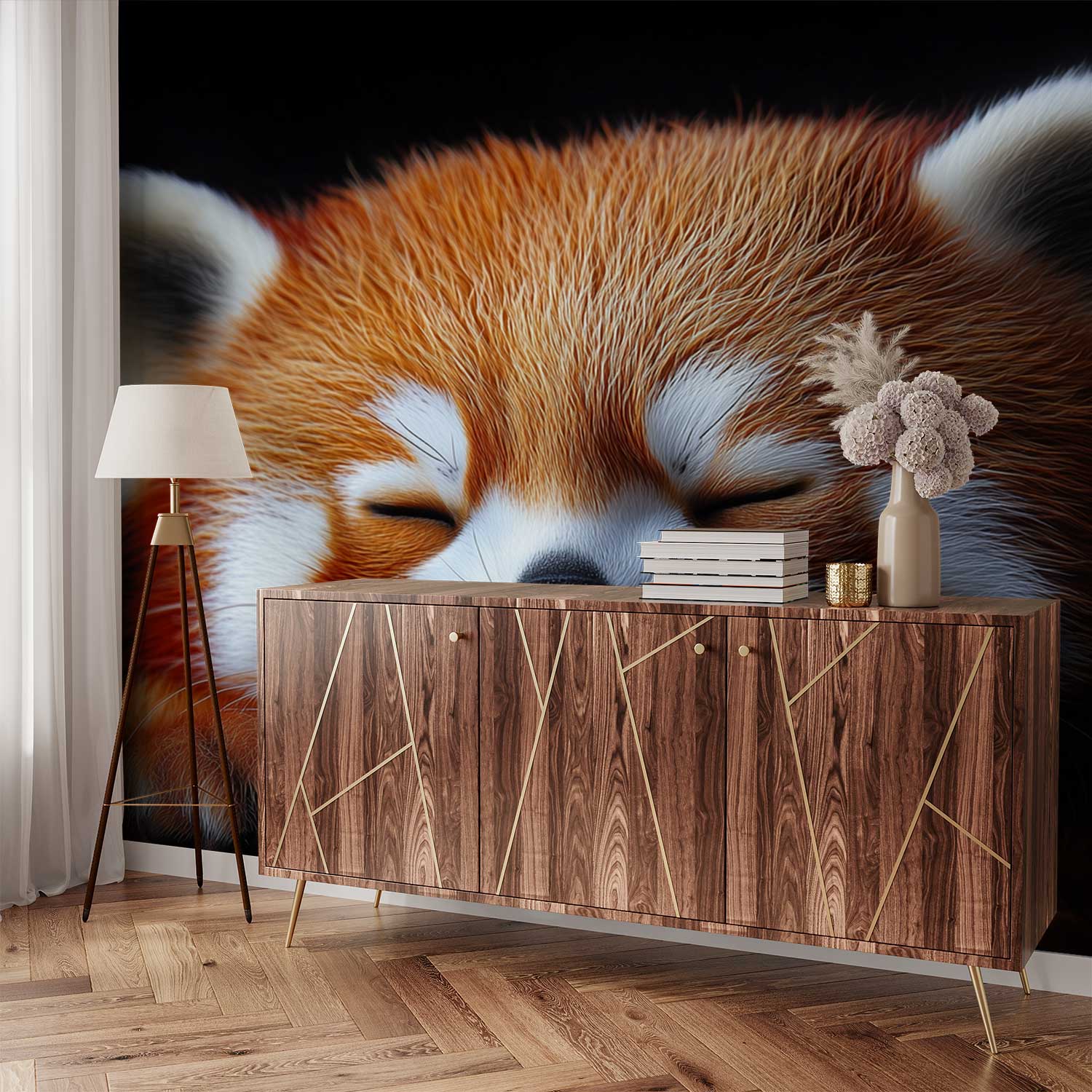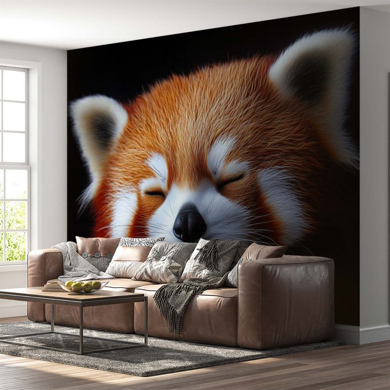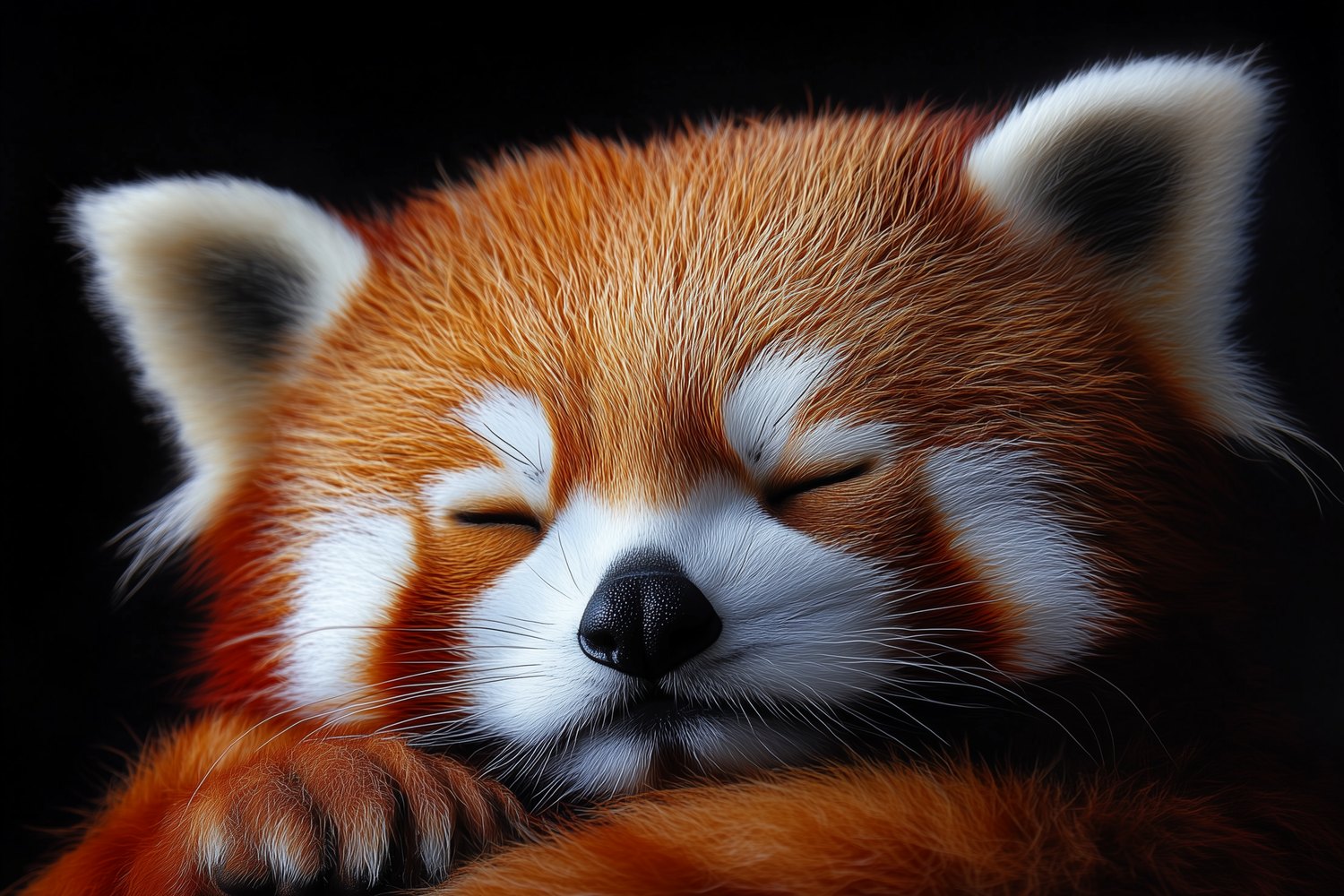 Zacht rood en wit vangen de serene schoonheid van een slapende rode panda, zijn kop rustend op zijn pootje. Zijn gesloten ogen en pluizige vacht stralen pure rust uit. Dit tafereel brengt een gevoel van warmte en verwondering in elke ruimte, perfect voor een rustgevende sfeer in je interieur.