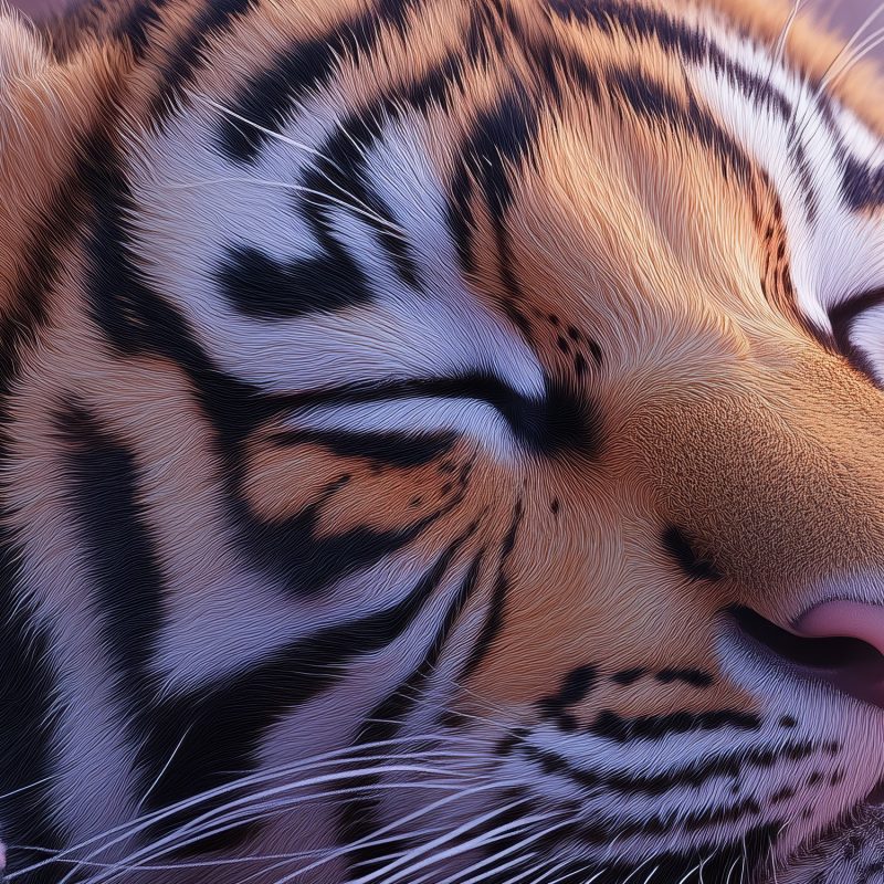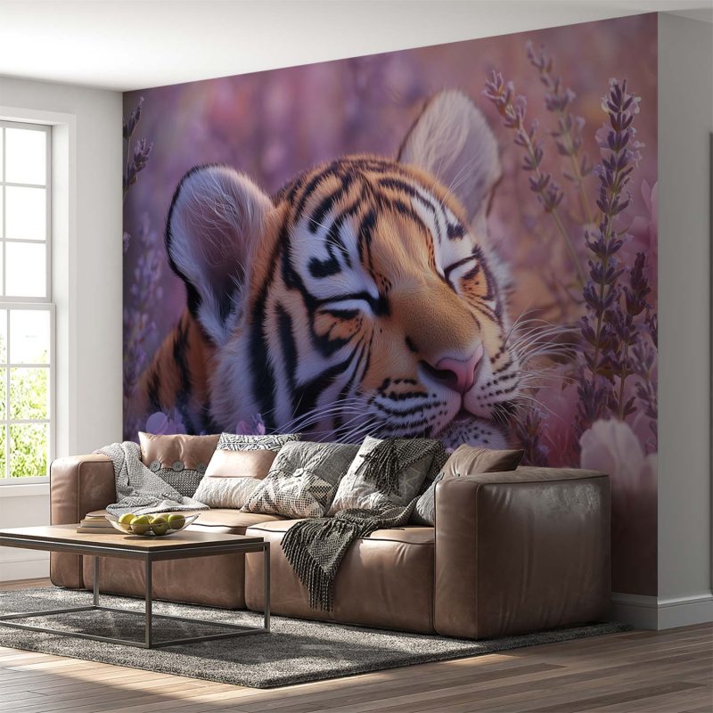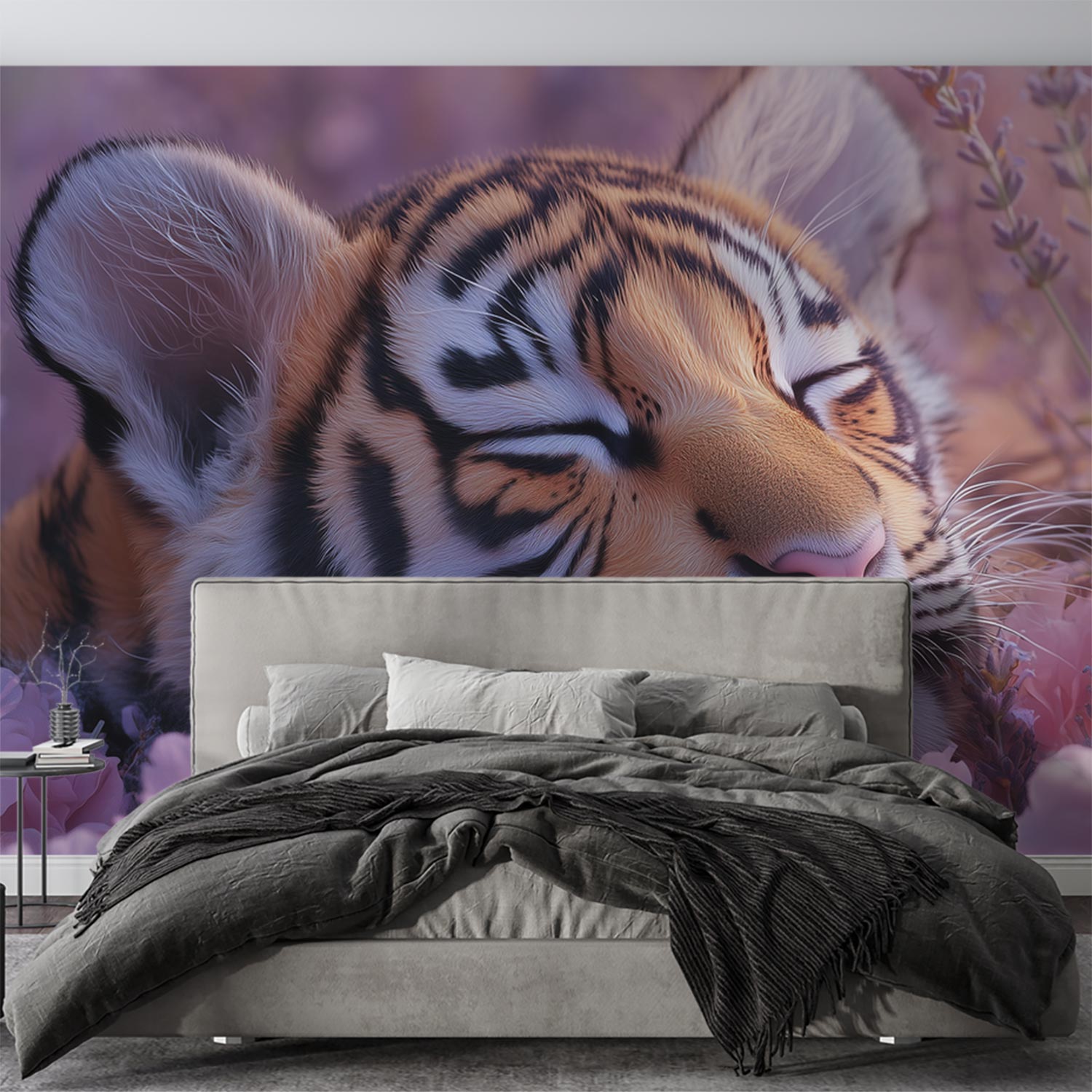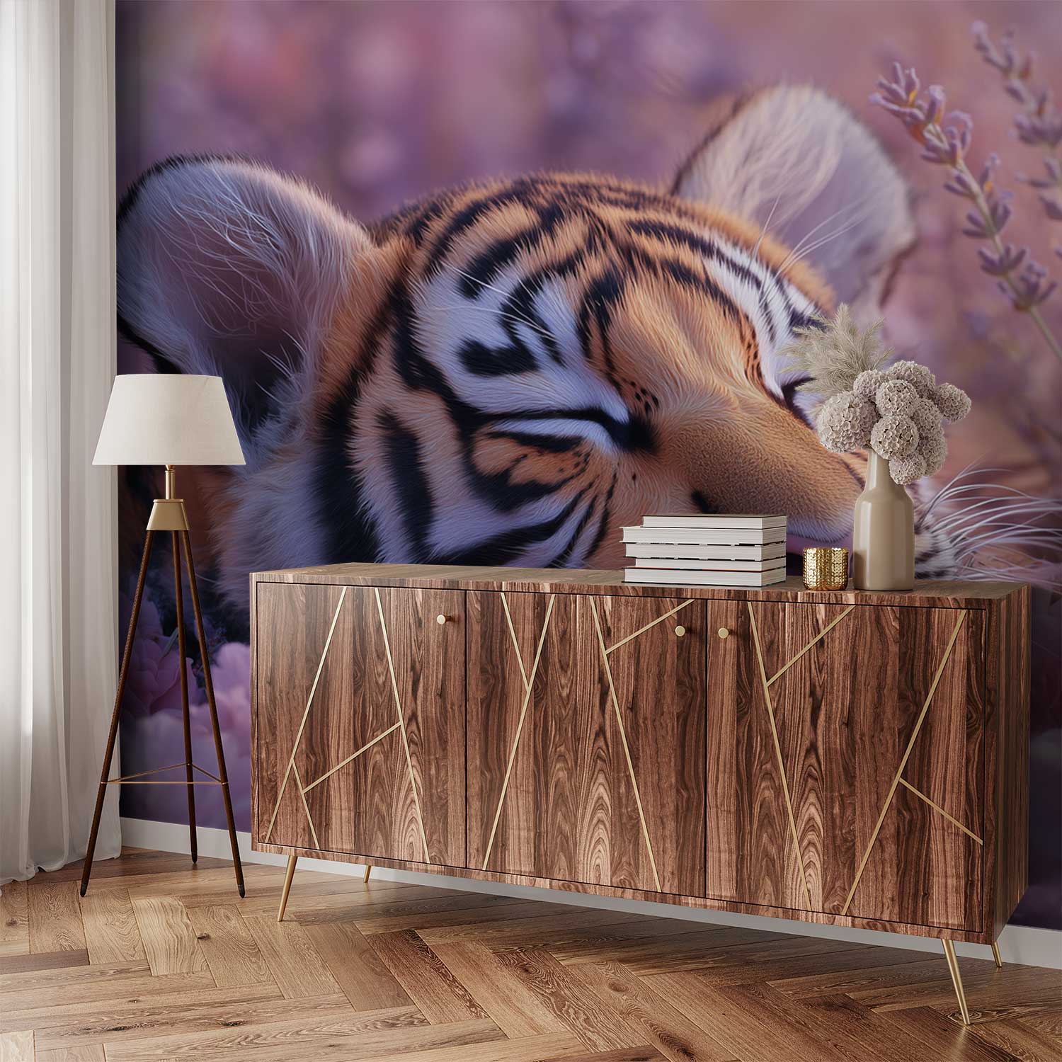Purperen bloemen golven zacht rond een rustende tijger. Zijn gesloten ogen stralen pure sereniteit uit in dit harmonieuze tafereel. Roze en paarse tinten wekken een kalmerende sfeer die elke ruimte transformeert tot een oase van rust. Dit levendige motief brengt de natuur binnen en creëert een geborgen sfeer. Perfect voor wie verlangt naar een vredige ontsnapping in huis.
