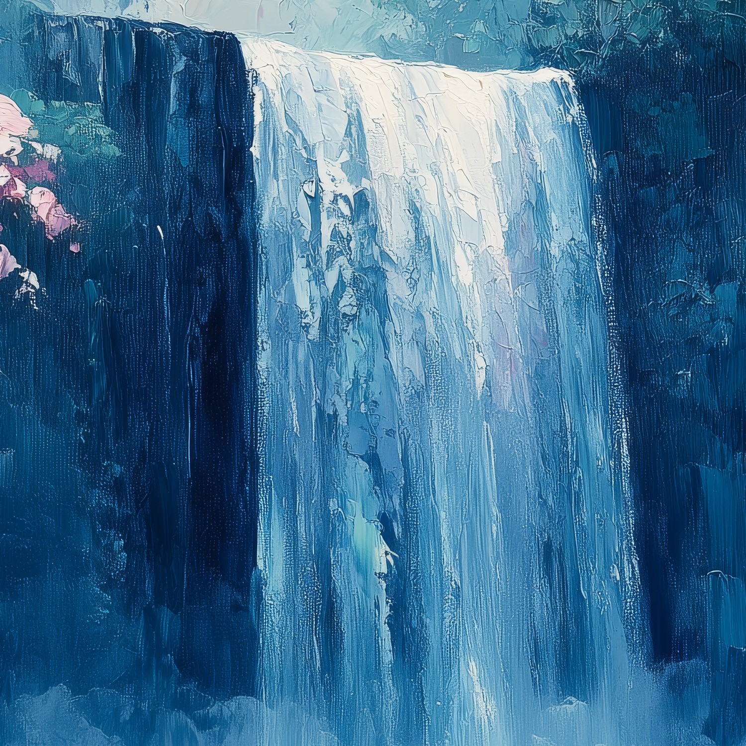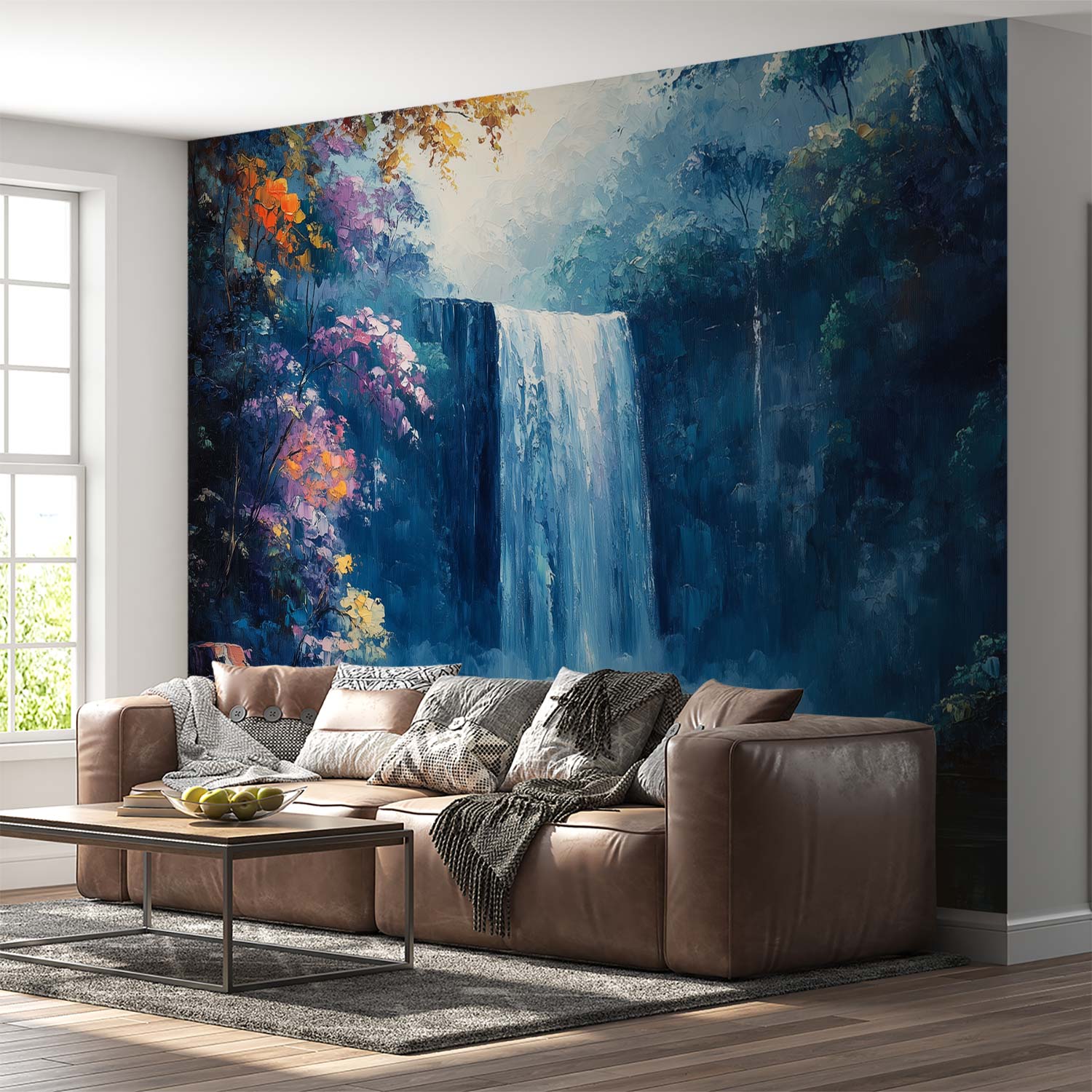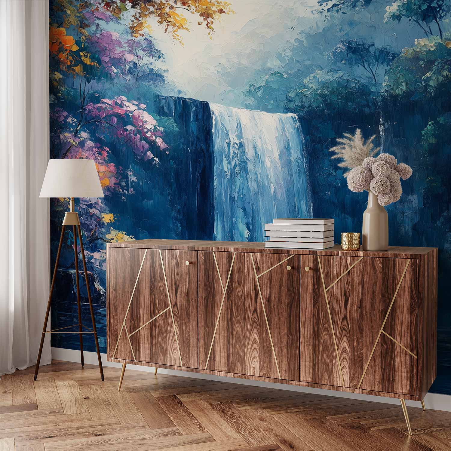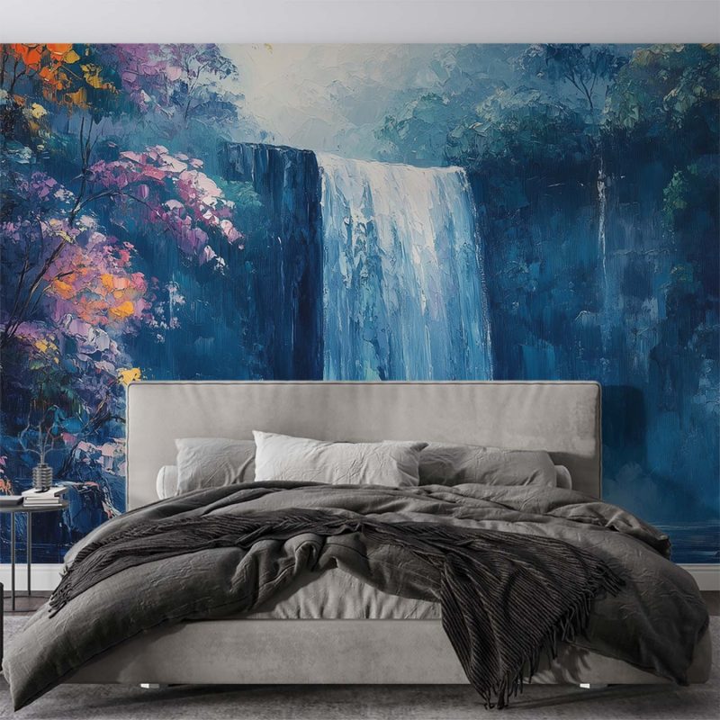 Watervallen stromen levendig door een weelderig bos, omringd door tinten blauw, groen en oranje. Dit kunstwerk ademt rust en harmonie, alsof je zelf in de serene natuur staat. De kleuren dansen en geven je interieur direct een gevoel van diepe ontspanning en verwondering. Perfect voor wie natuurlijke schoonheid en vrede in huis wil halen.