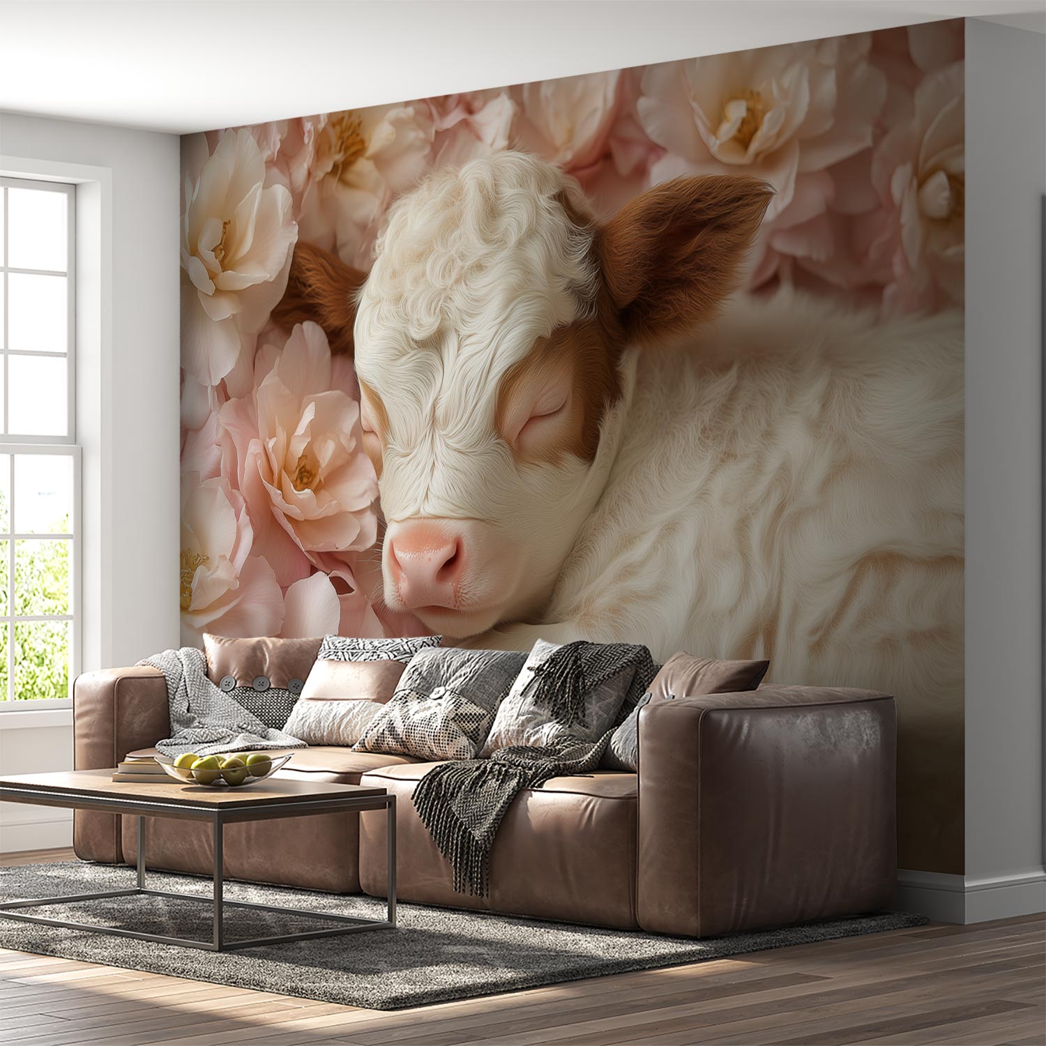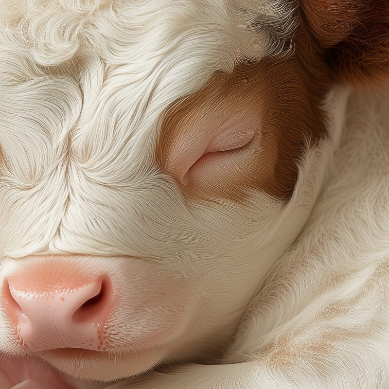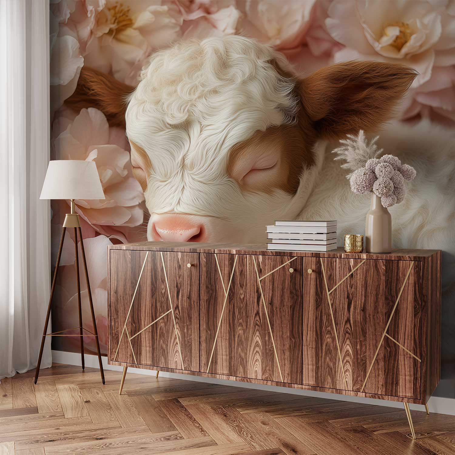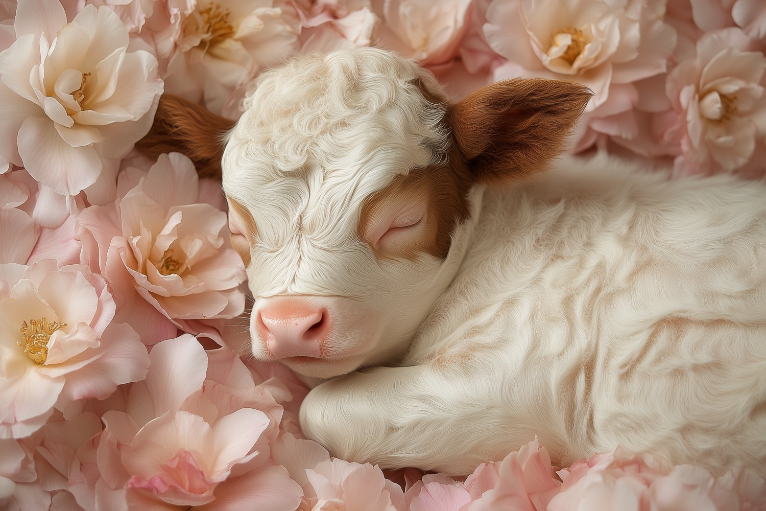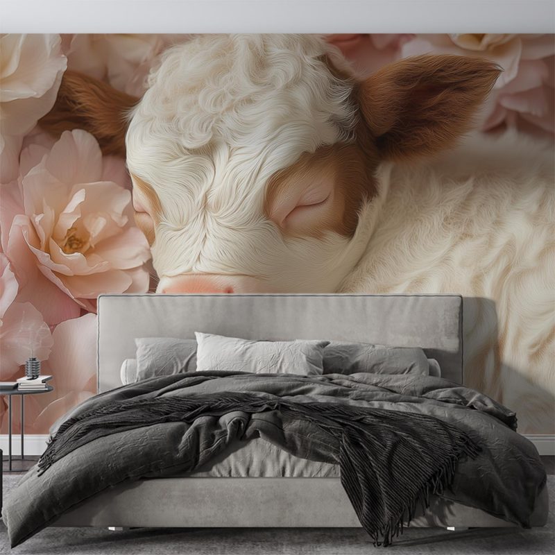 Zachte roze bloemen wiegen rond een slapend kalfje in warm bruin en wit. Dit tafereel ademt pure rust en harmonie, waardoor elke ruimte direct een gevoel van vrede uitstraalt. De subtiele contrasten brengen leven en diepte, perfect voor een kalme sfeer in je interieur. Ideaal om sereniteit te creëren in slaapkamers of leeshoeken.