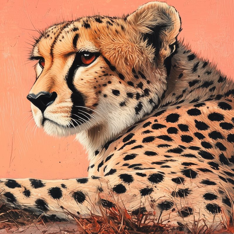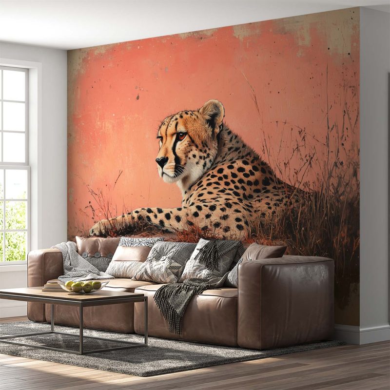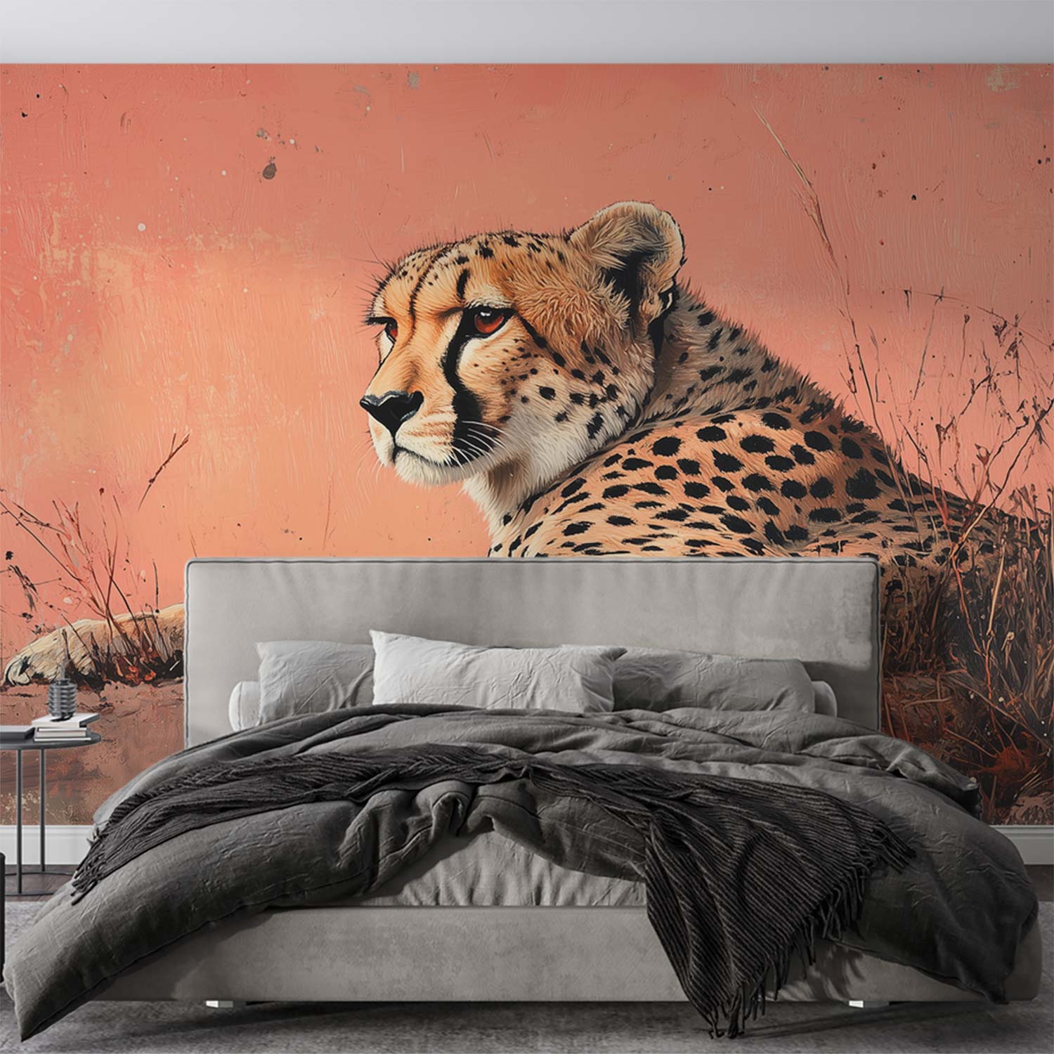Warme oranje en roze tinten omhullen dit majestueuze jachtluipaard, rustend in het hoge gras. Zijn gespikkelde vacht springt levendig naar voren tegen de zachte achtergrond. Deze serene scène brengt de rustgevende essentie van de savanne in huis, creërend een harmonieus en natuurlijk accent voor elke ruimte. De gebalanceerde compositie straalt zowel rust als wild elegance uit.