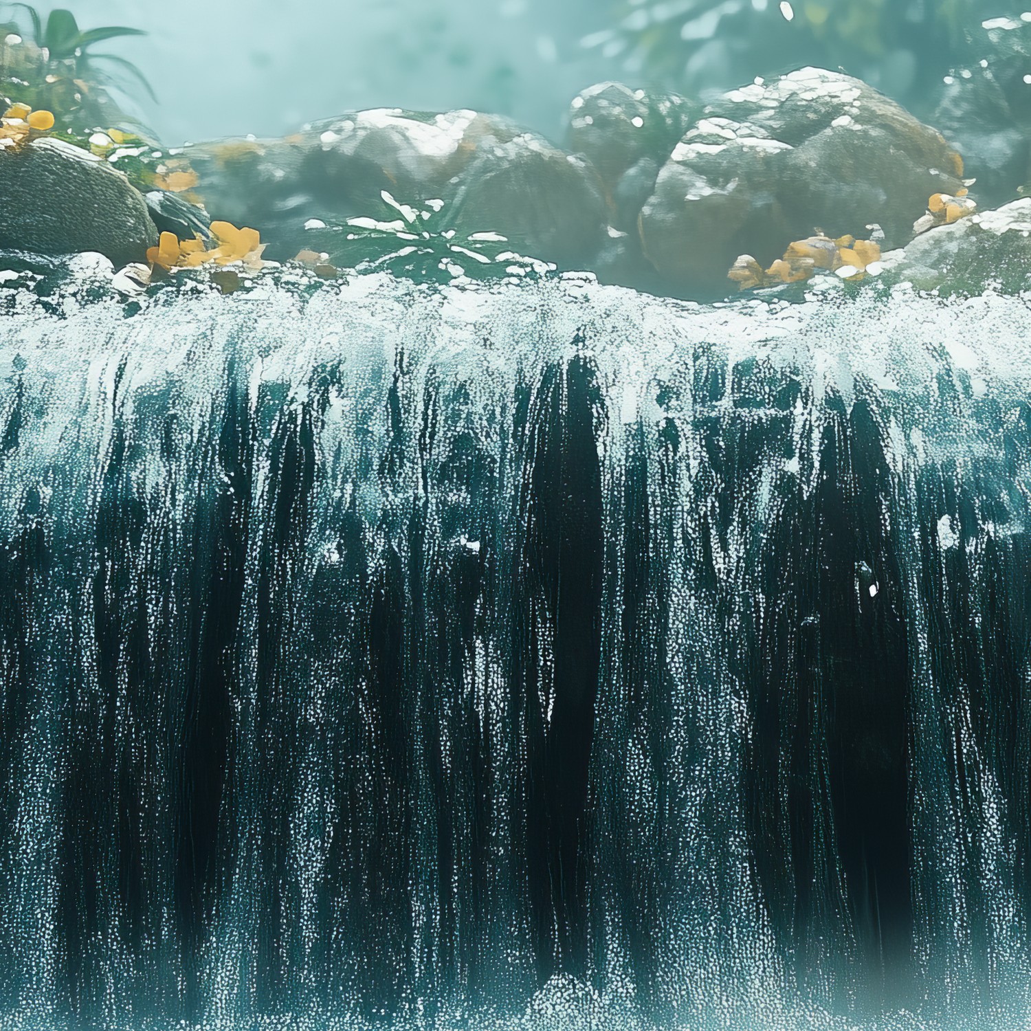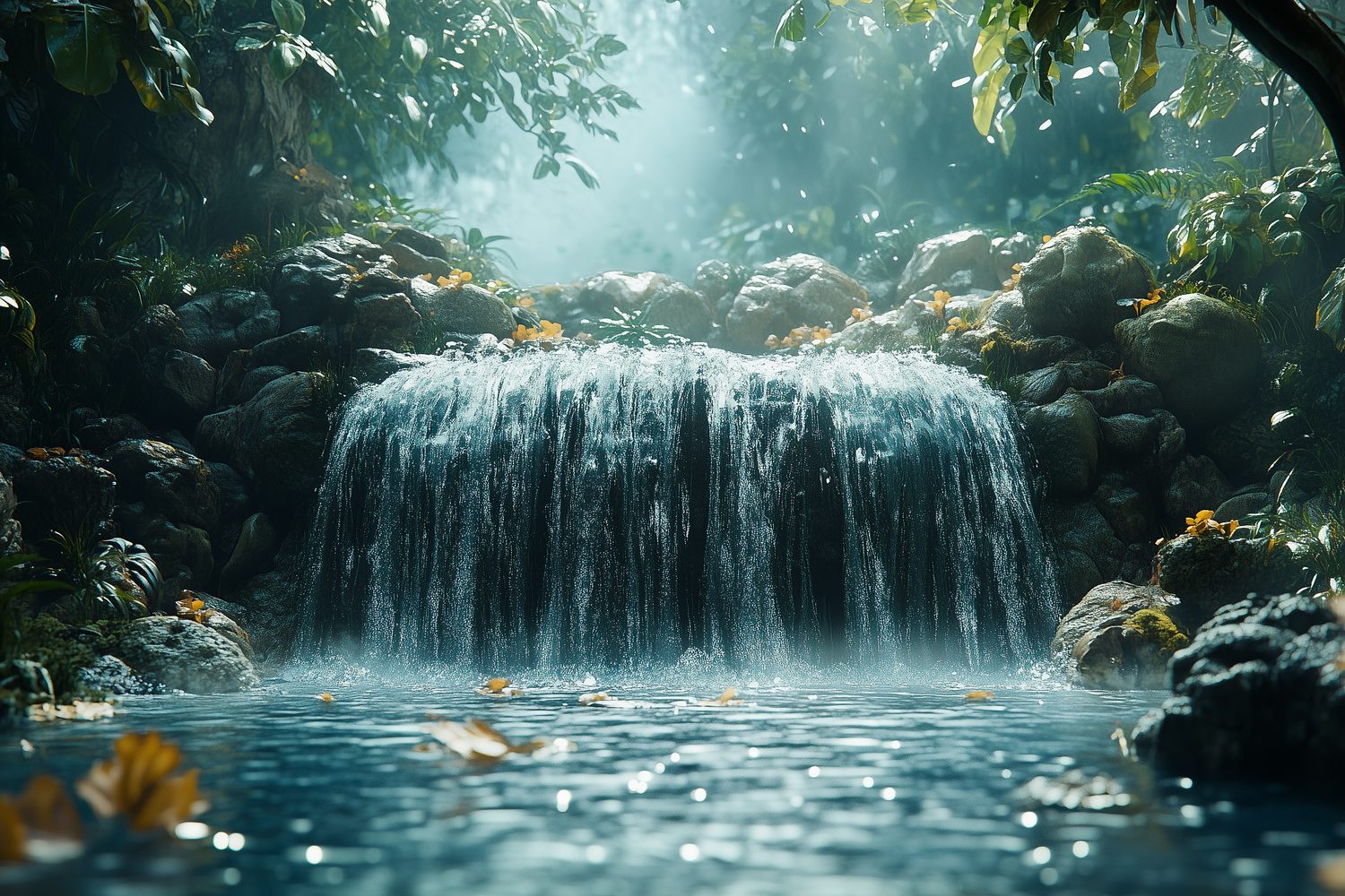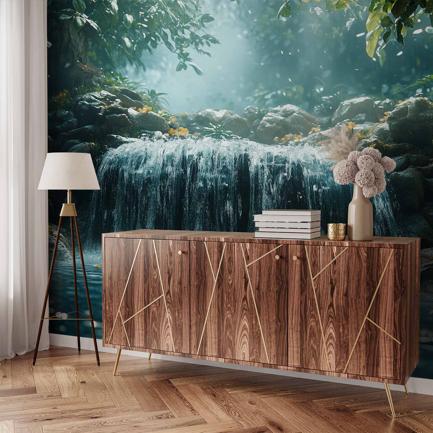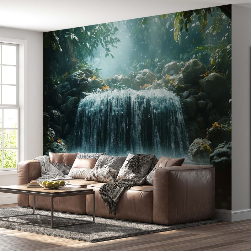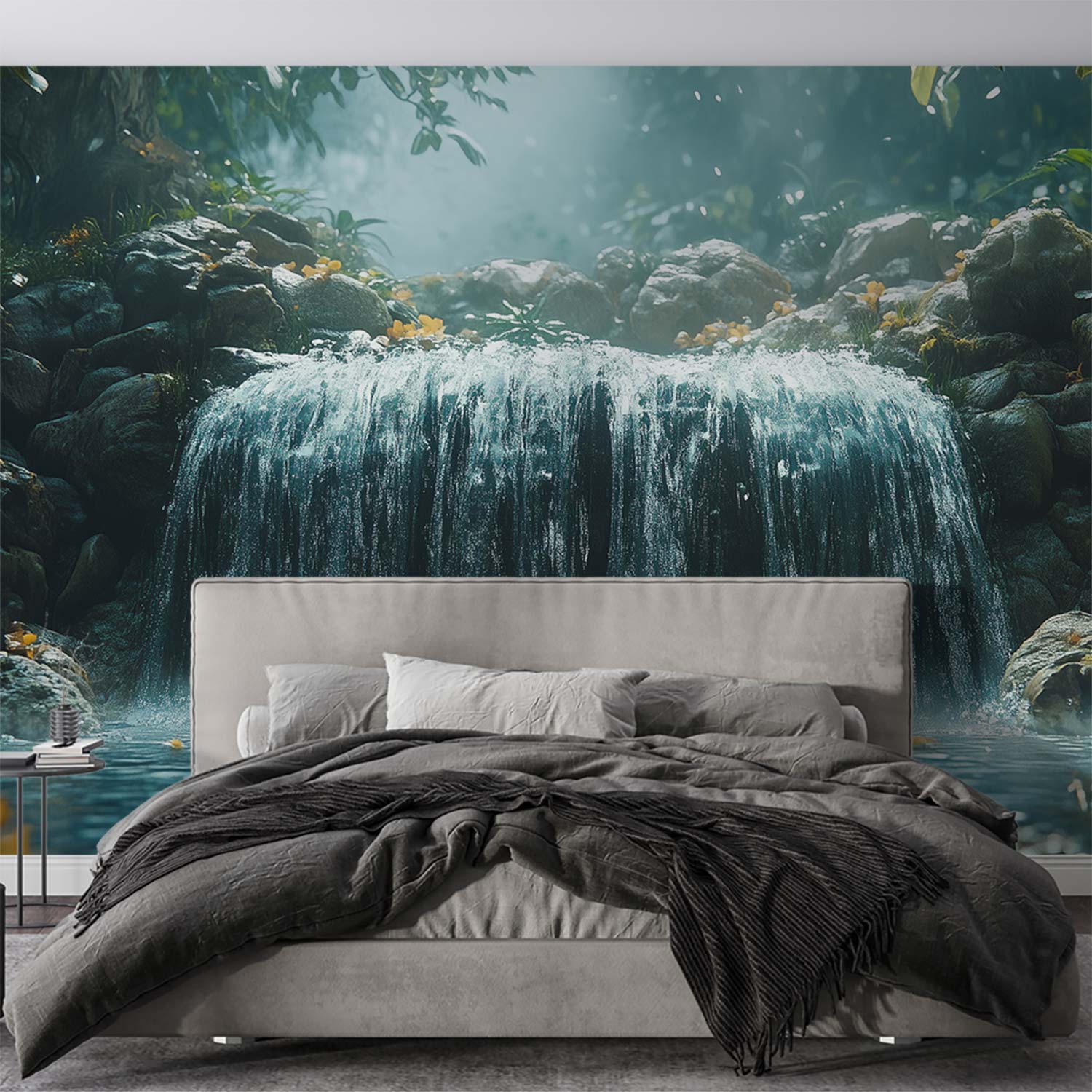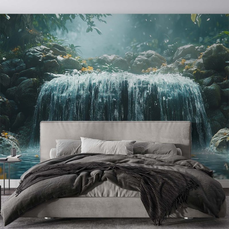 Verfrissende watervalstromen dansen over rotsen, gehuld in een levendige nevel. Omringend groen fluistert zachtjes terwijl azuurblauw water zich een weg baant door weelderig gebladerte. Dit levend tafereel brengt de rustgevende energie van de natuur rechtstreeks je huis binnen, creëert een oase van kalmte en transformeert elke ruimte in een serene retreat.