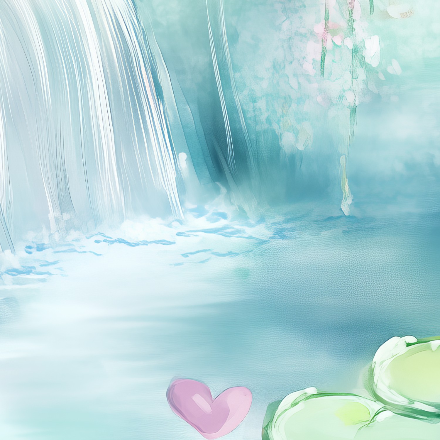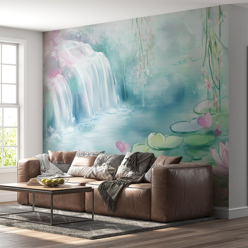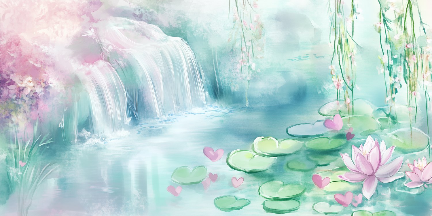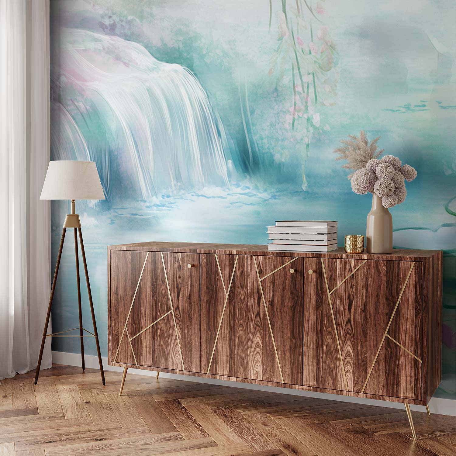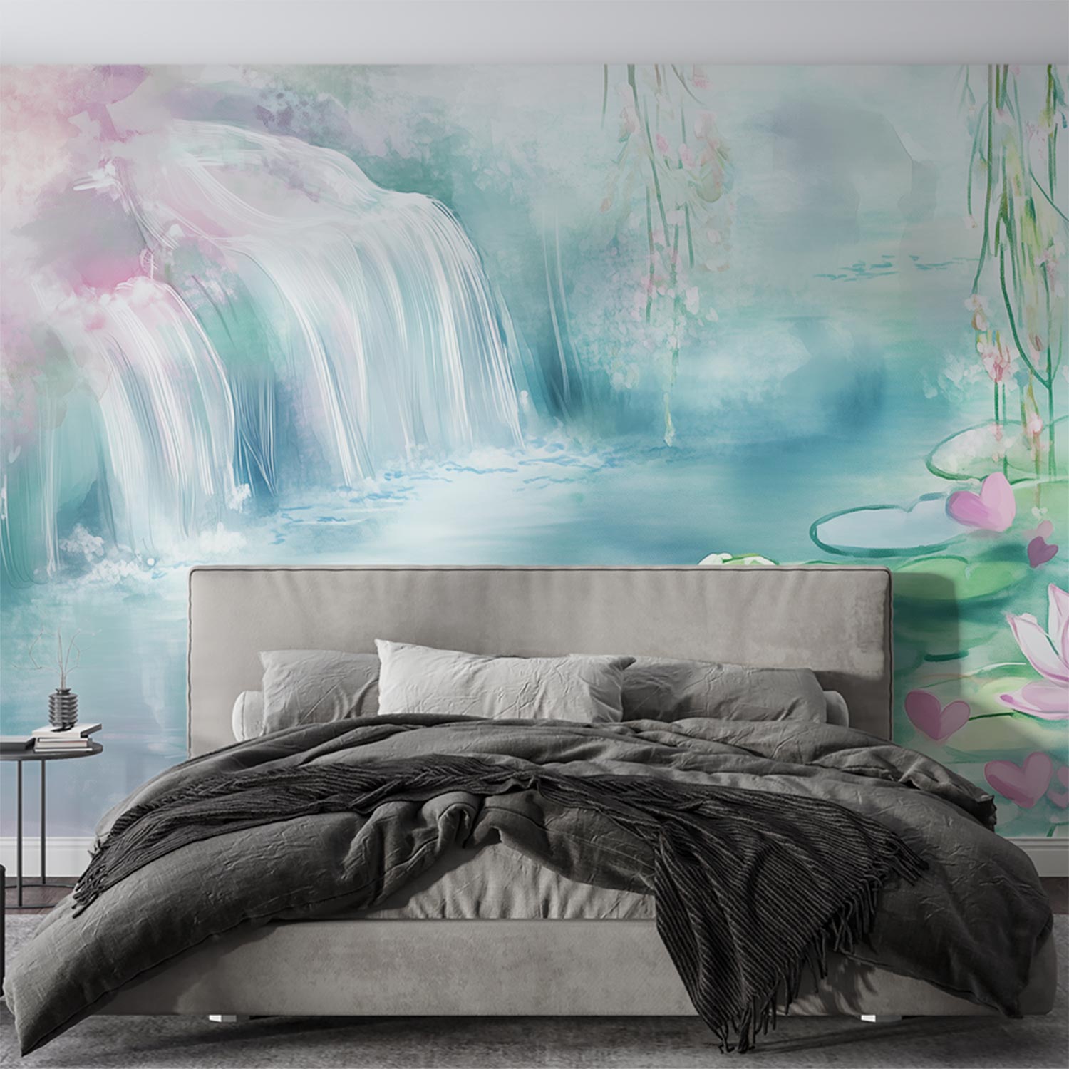 Zachte waterverfstreken brengen een kabbelende waterval tot leven, omringd door drijvende leliebladen en zachtroze bloemen. Het kalme groenblauwe water weerspiegelt de serene omgeving en creëert een dromerige, vredige sfeer. Dit behang brengt de rustgevende harmonie van de natuur naar binnen, perfect voor een ruimte waar ontspanning en natuurlijke schoonheid samenkomen.