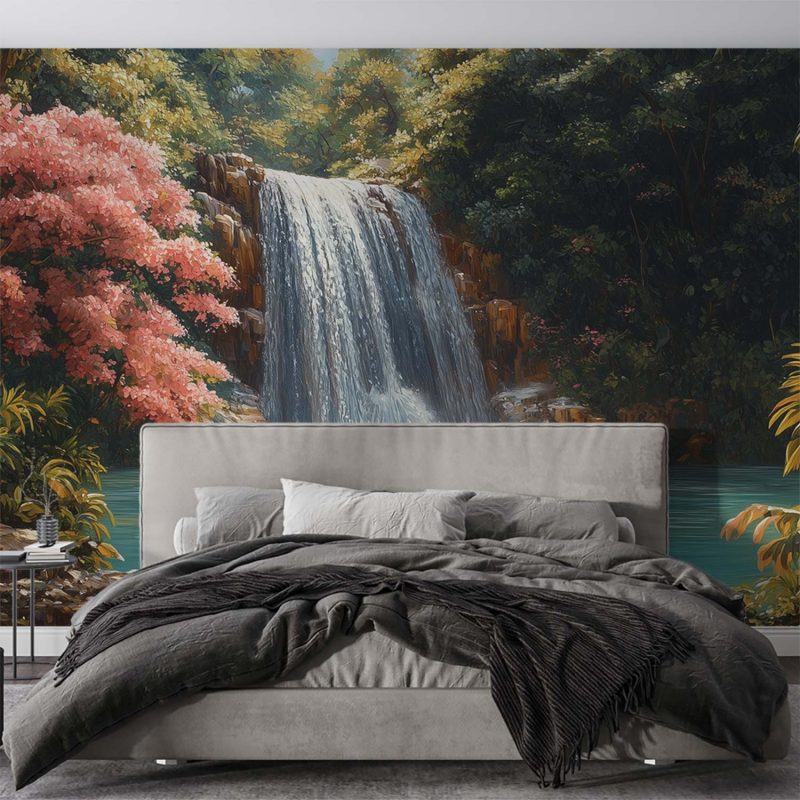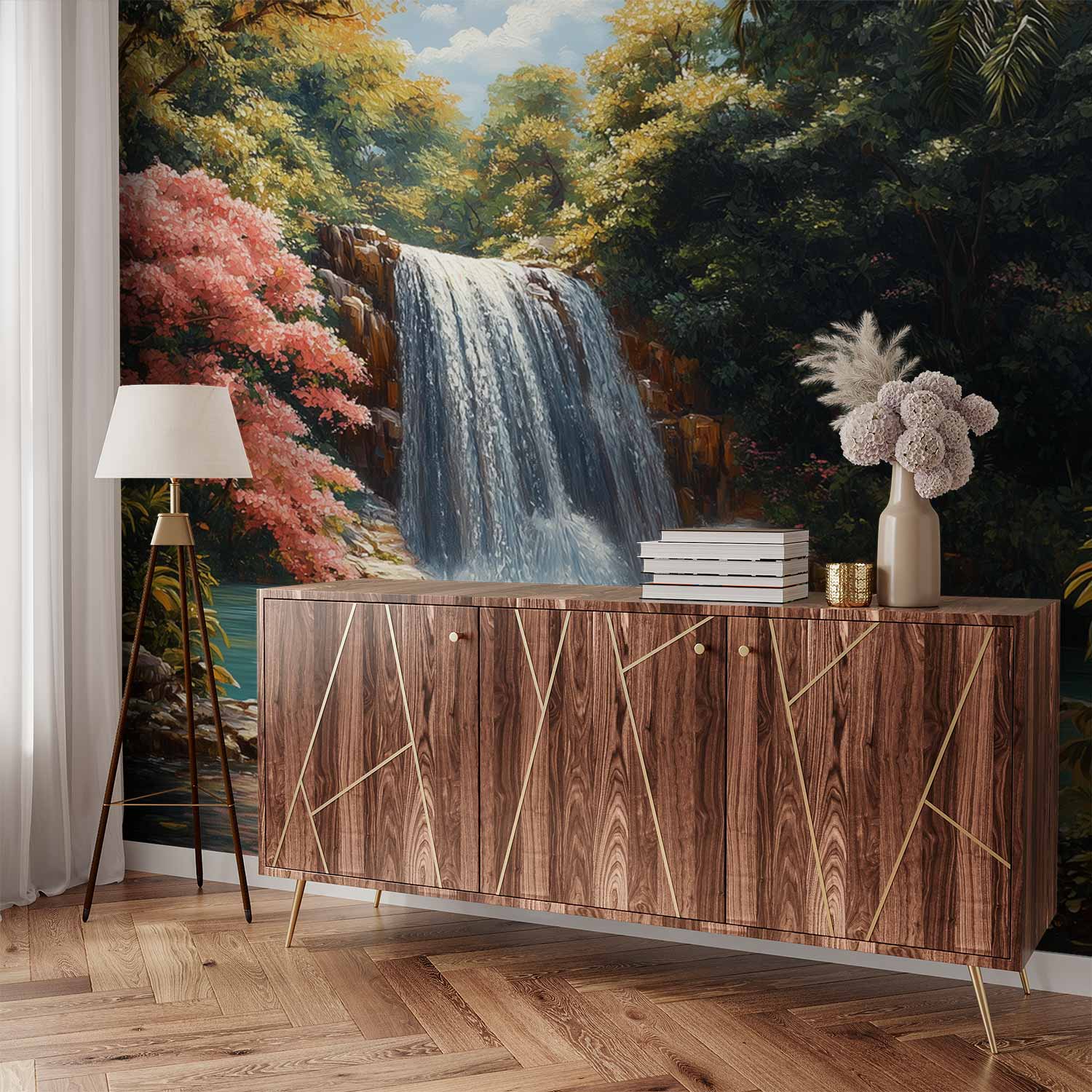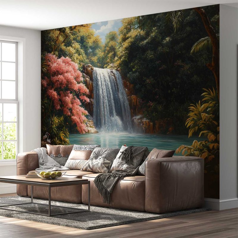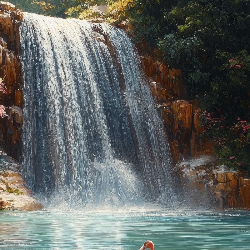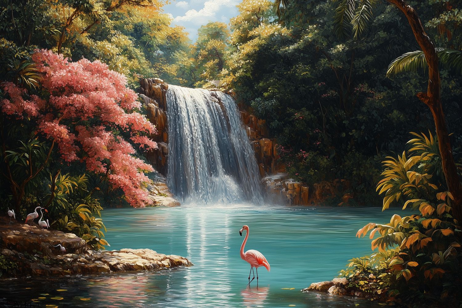 Ontdek een betoverende waterval die door weelderig groen stroomt. Een sierlijke flamingo in het water voegt een vleugje elegantie toe. Frisse tinten groen, blauw en roze creëren een harmonieuze sfeer. Dit levendige tafereel brengt de rust van de natuur in huis. Perfect voor een serene ontsnapping in je interieur.