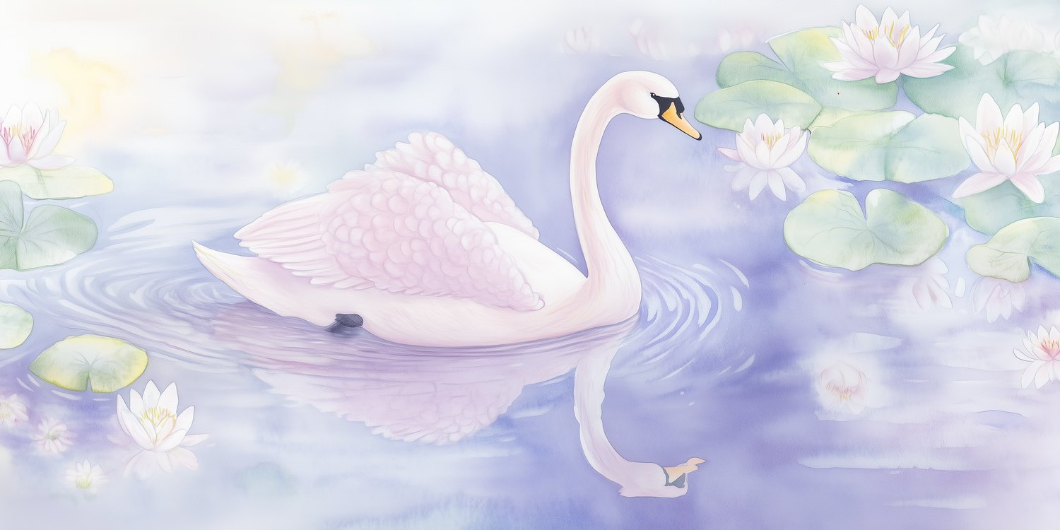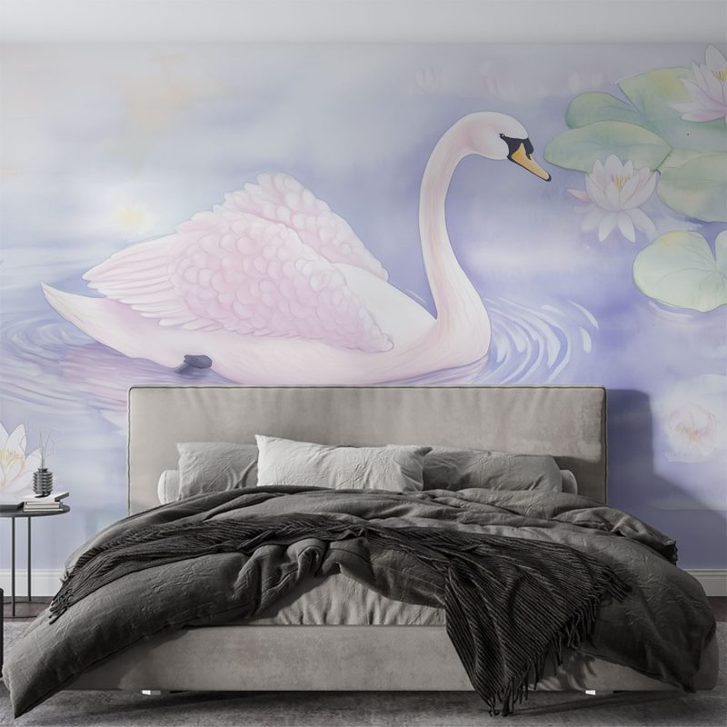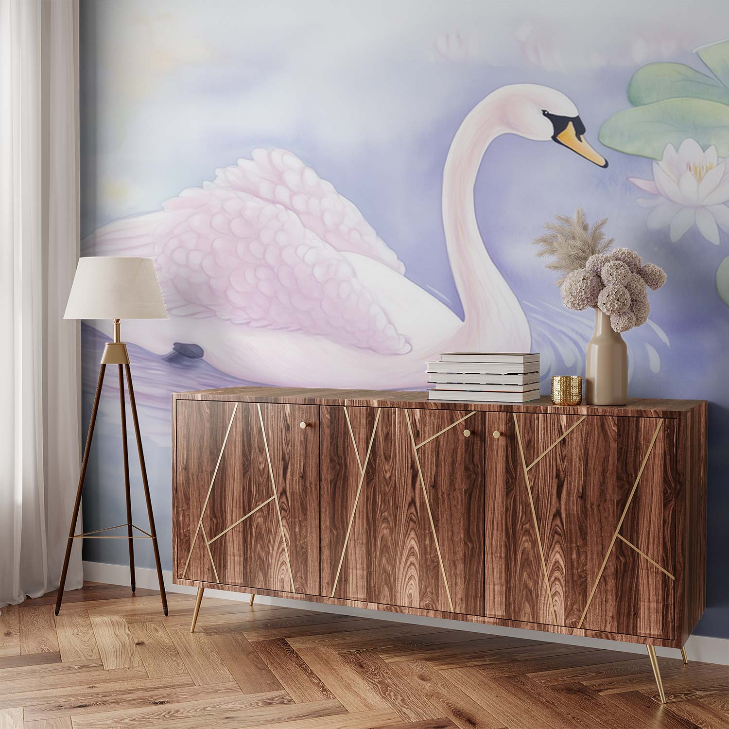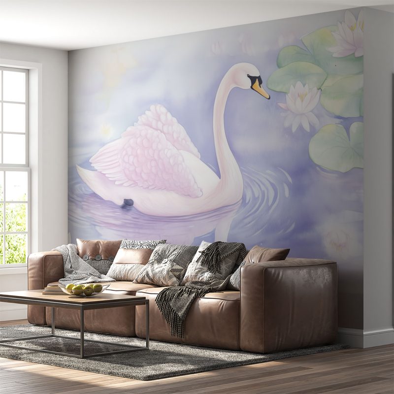 Zacht blauw water omarmt een sierlijke zwaan die tussen waterlelies zweeft. Frisse groentinten en witte veren dansen in harmonie. Dit behang brengt de rust van een natuurlijke oase in huis, perfect voor een serene sfeer in elke leefruimte. De vloeiende waterverftechniek voegt beweging en diepte toe, waardoor de muur tot leven komt met tedere elegantie.