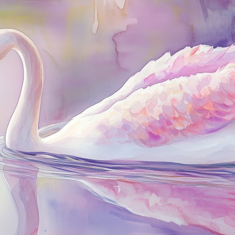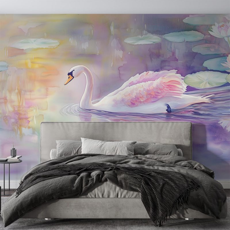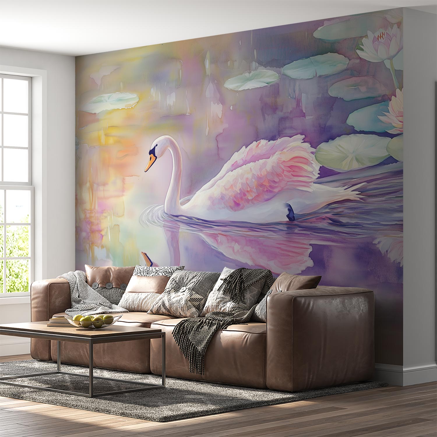 Zacht pastel water weerspiegelt een sierlijke witte zwaan die tussen waterlelies glijdt. Bloemen dansen aan de randen, terwijl een harmonieuze sfeer van rust over het tafereel daalt. Dit behang brengt de serene elegantie van de natuur naar binnen, perfect voor het creëren van een kalme, vloeiende sfeer in elke leefruimte.