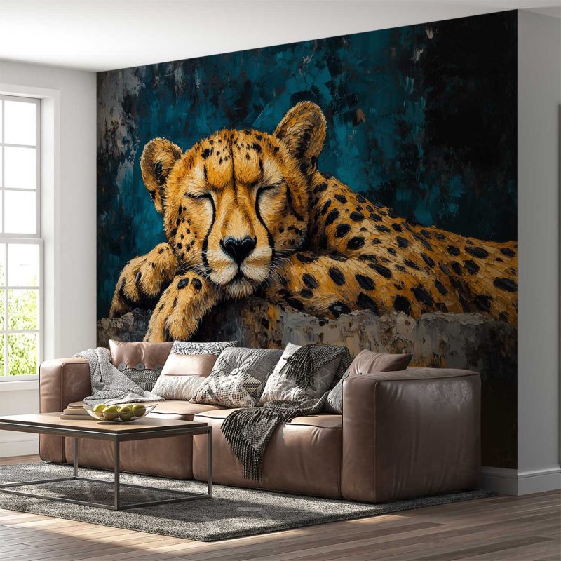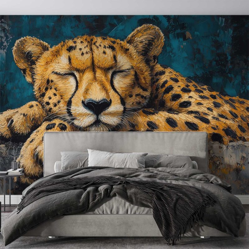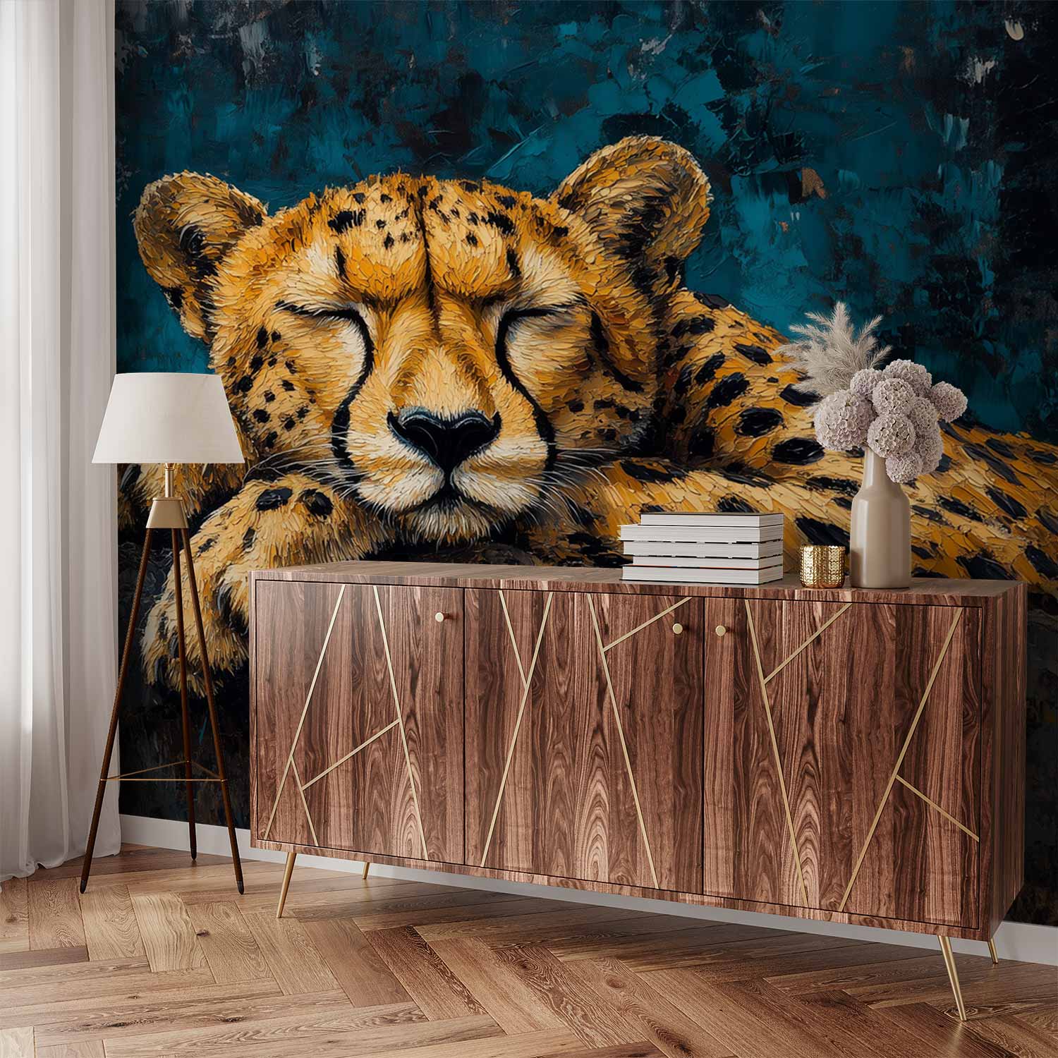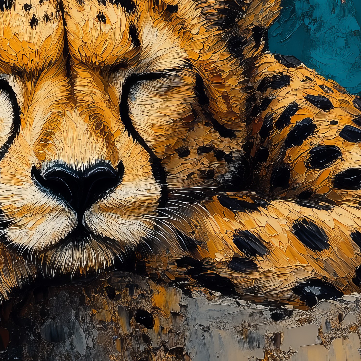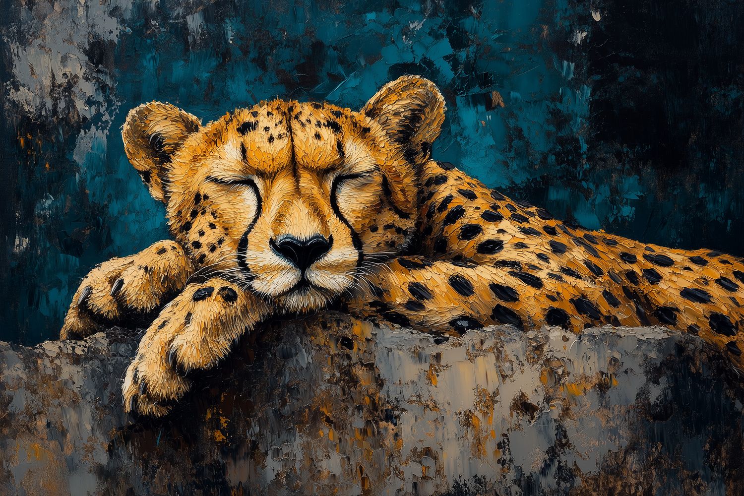 Oranje en zwarte tinten vloeien zacht in elkaar over terwijl deze rustende jager droomt. Zijn gesloten ogen en ontspannen houding stralen pure sereniteit uit. Elk detail van zijn vacht komt tot leven, alsof hij ieder moment kan ontwaken. Dit realistische tafereel brengt een kalmerende wildernis-essentie naar jouw ruimte, perfect voor een rustgevend accent in moderne of natuurlijke interieurs.