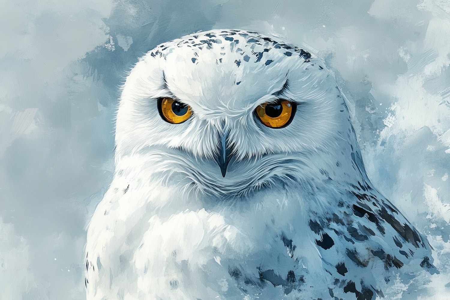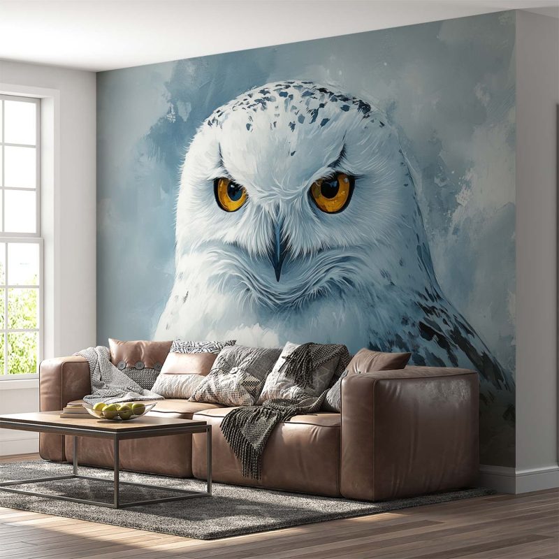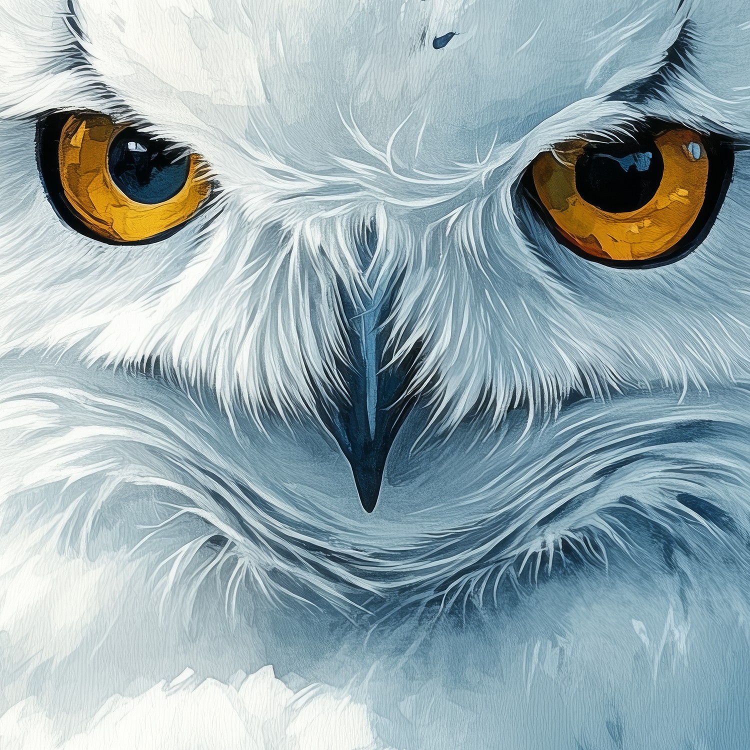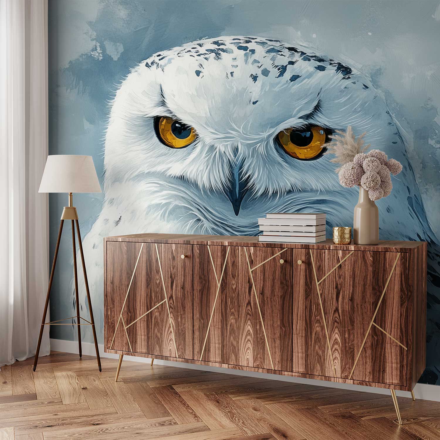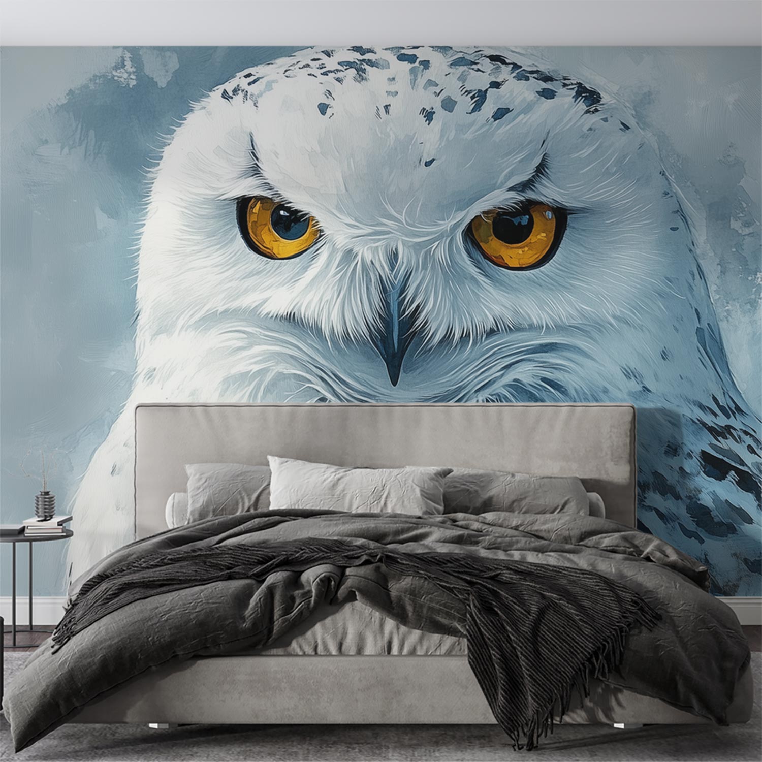 Gouden ogen doordringen de stilte vanuit een vorstelijk wit gezicht. Zwart gespikkelde veren contrasteren met het koele blauwwitte landschap. Deze majestueuze uil brengt een serene, winterse sfeer naar uw ruimte, waar zijn kalme aanwezigheid rust uitstraalt. Perfect voor een accentwand die zowel mysterie als rust toevoegt aan moderne of natuurlijke interieurs.