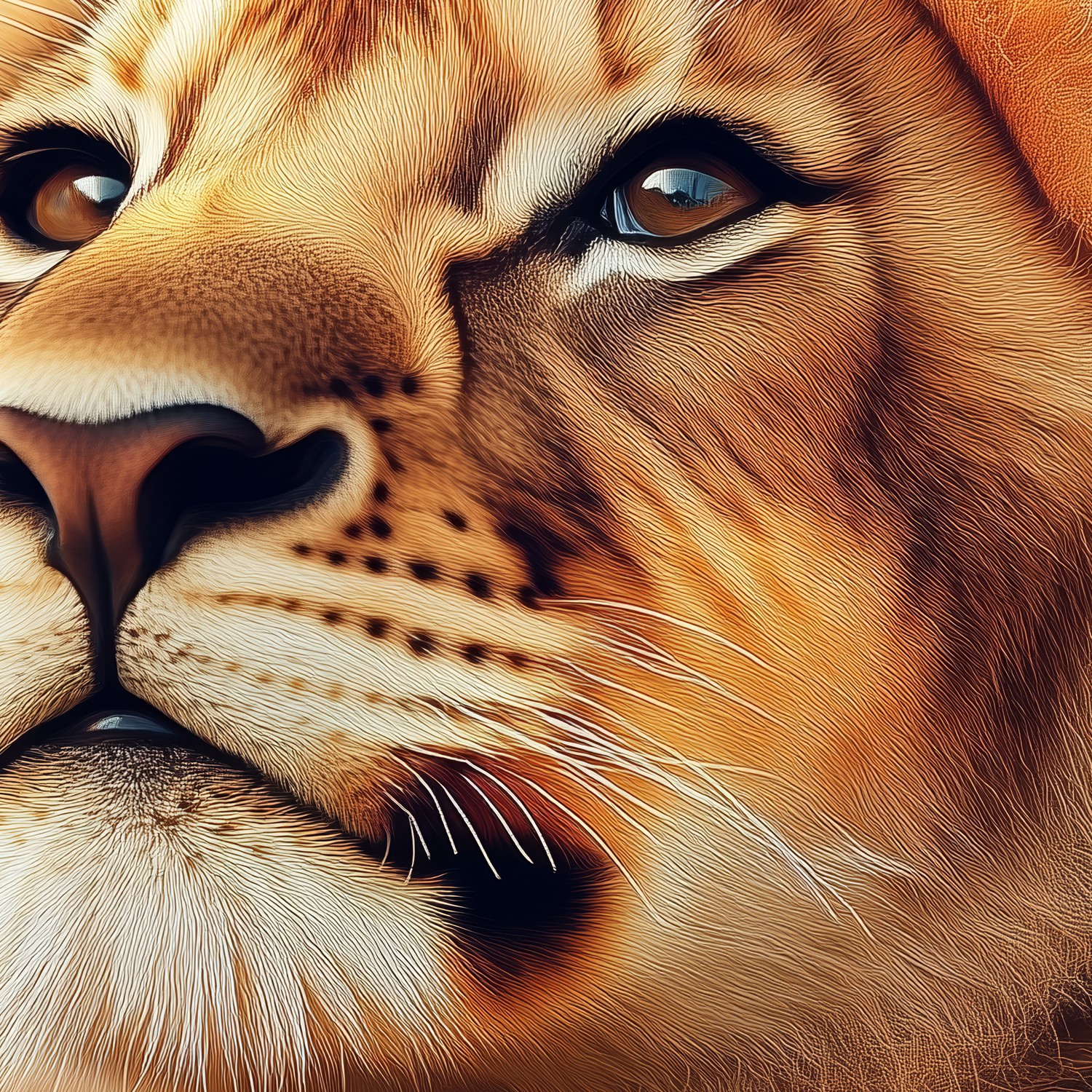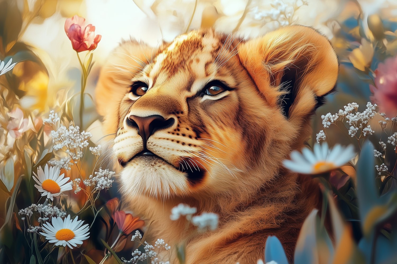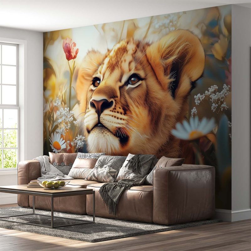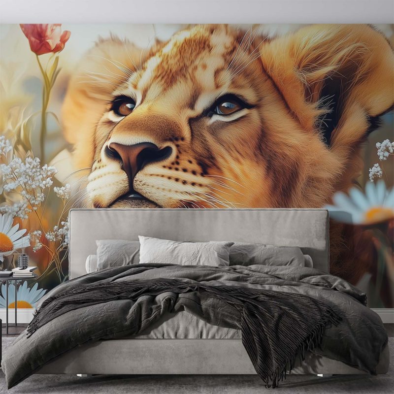 Zachte oranje en bruine tinten dansen rond de nieuwsgierige leeuwenwelp tussen een zee van bloemen. Zijn speelse blik straalt verwondering uit terwijl hij geniet van de rustige bloemenweide. Dit behang brengt harmonie en warmte in je interieur, en transformeert elke ruimte in een serene natuurlijke omgeving waar je even kunt ontsnappen aan de dagelijkse drukte.