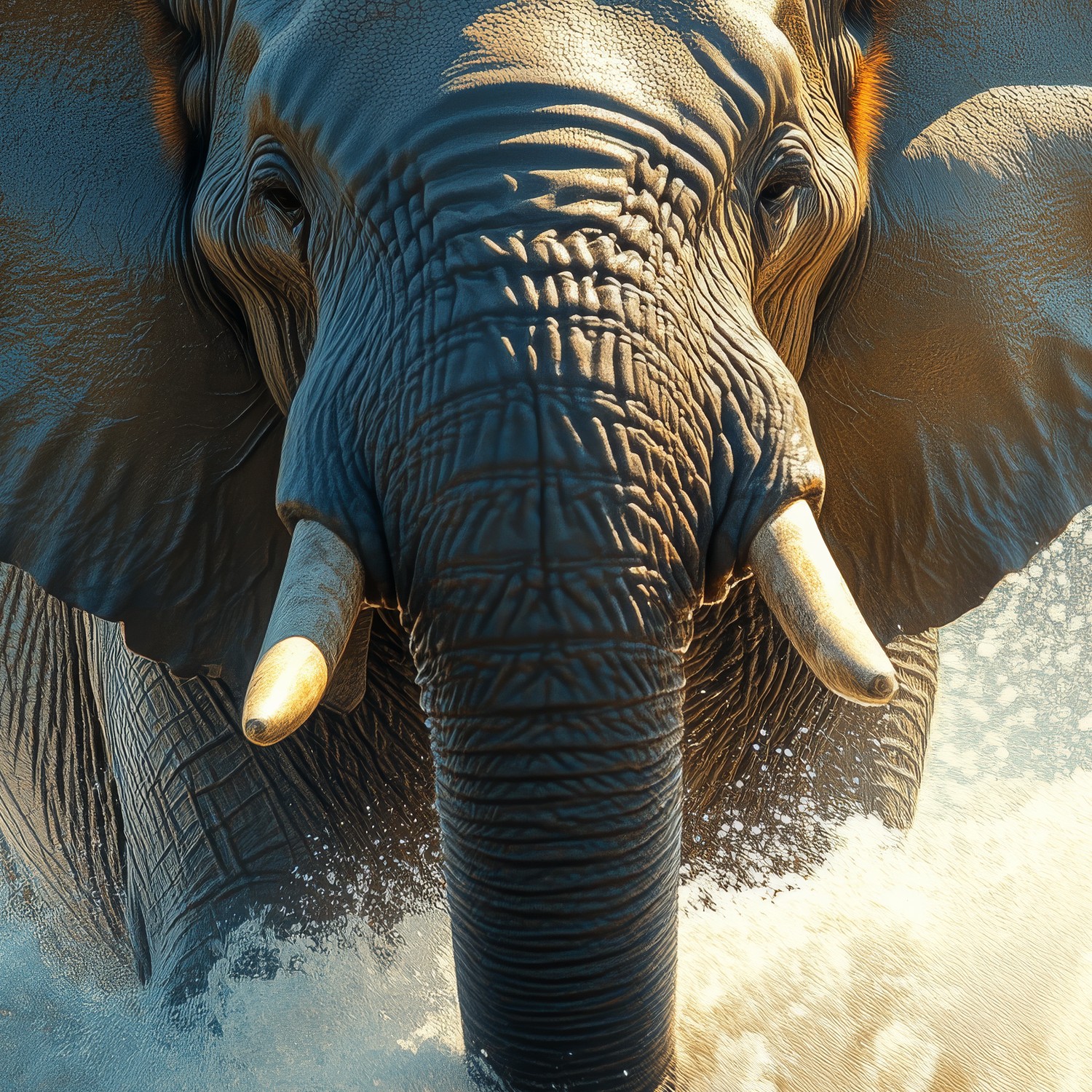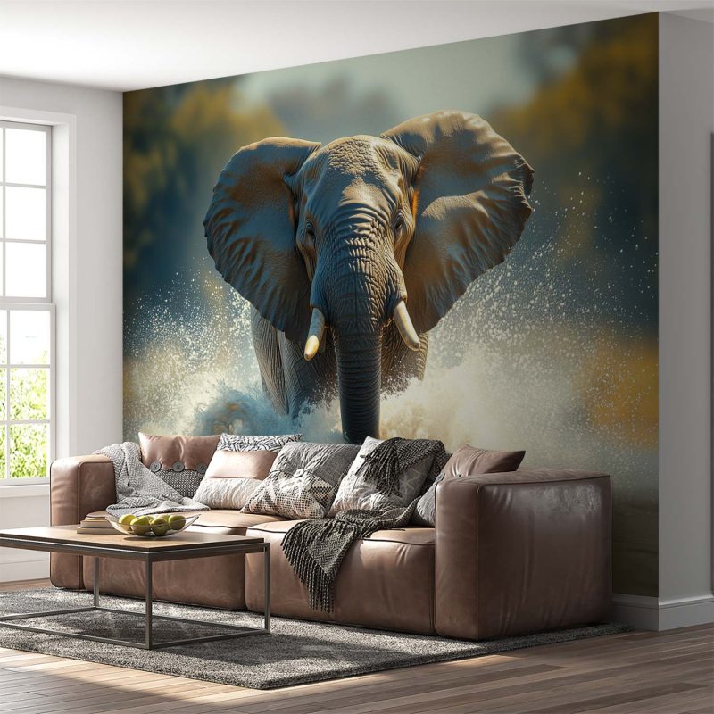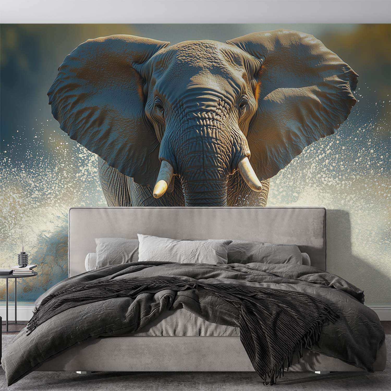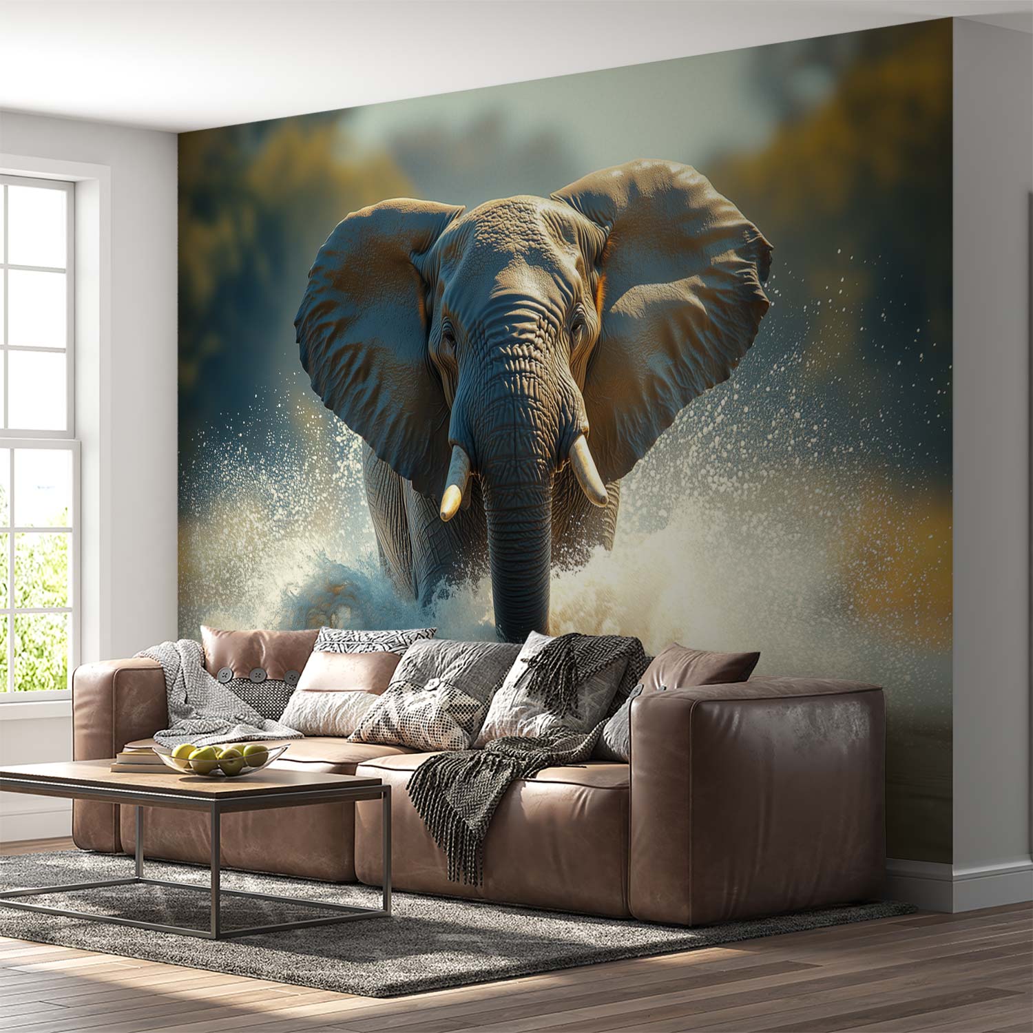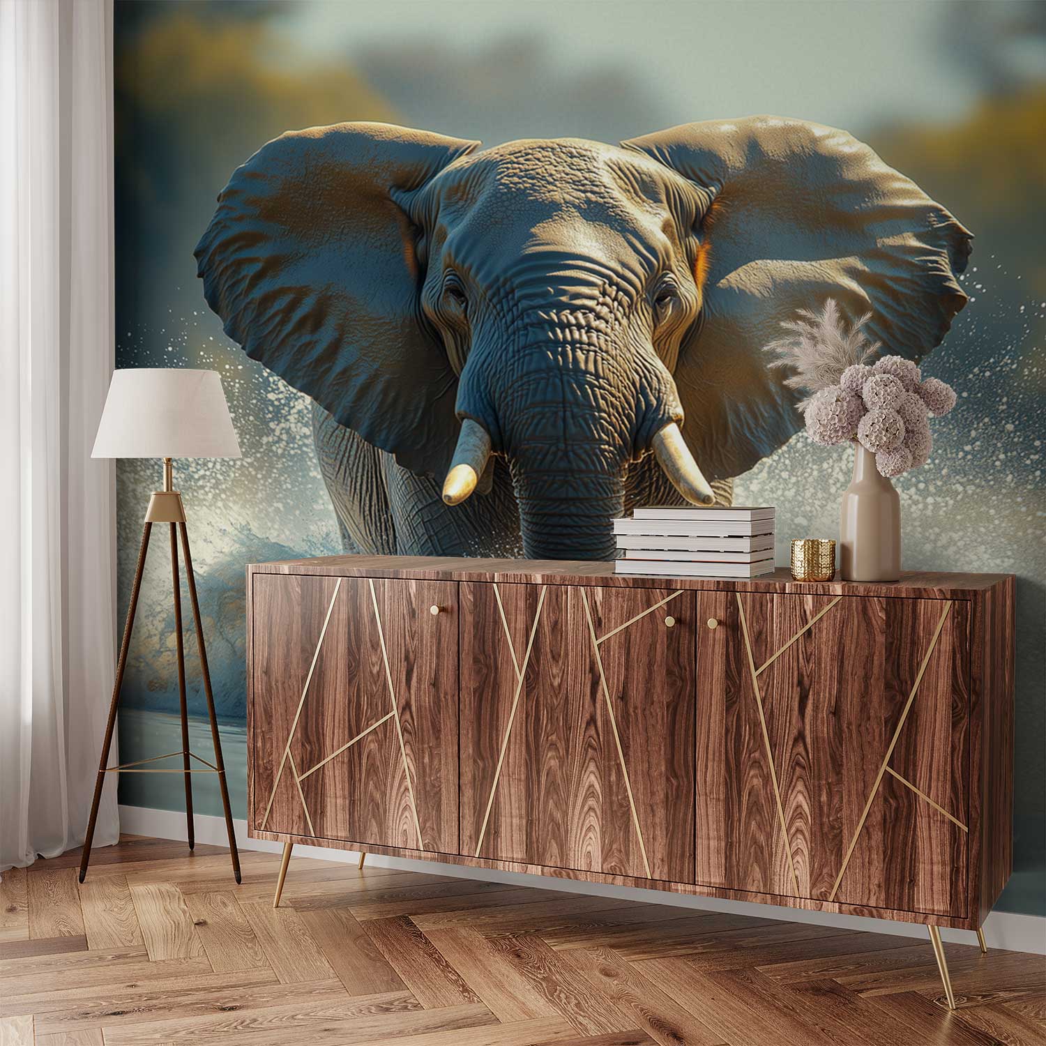 Sensatie van beweging en kracht spat van dit behang! Een majestueuze olifant stormt door het water, omgeven door een waas van dynamische spetters. Grijstinten en warme bruinen mengen zich met het wit van de opstuivend water. Perfect voor wie energie en natuurlijke elegantie in huis wil halen. Dit levendige tafereel brengt een gevoel van vrijheid en avontuur in elke ruimte.