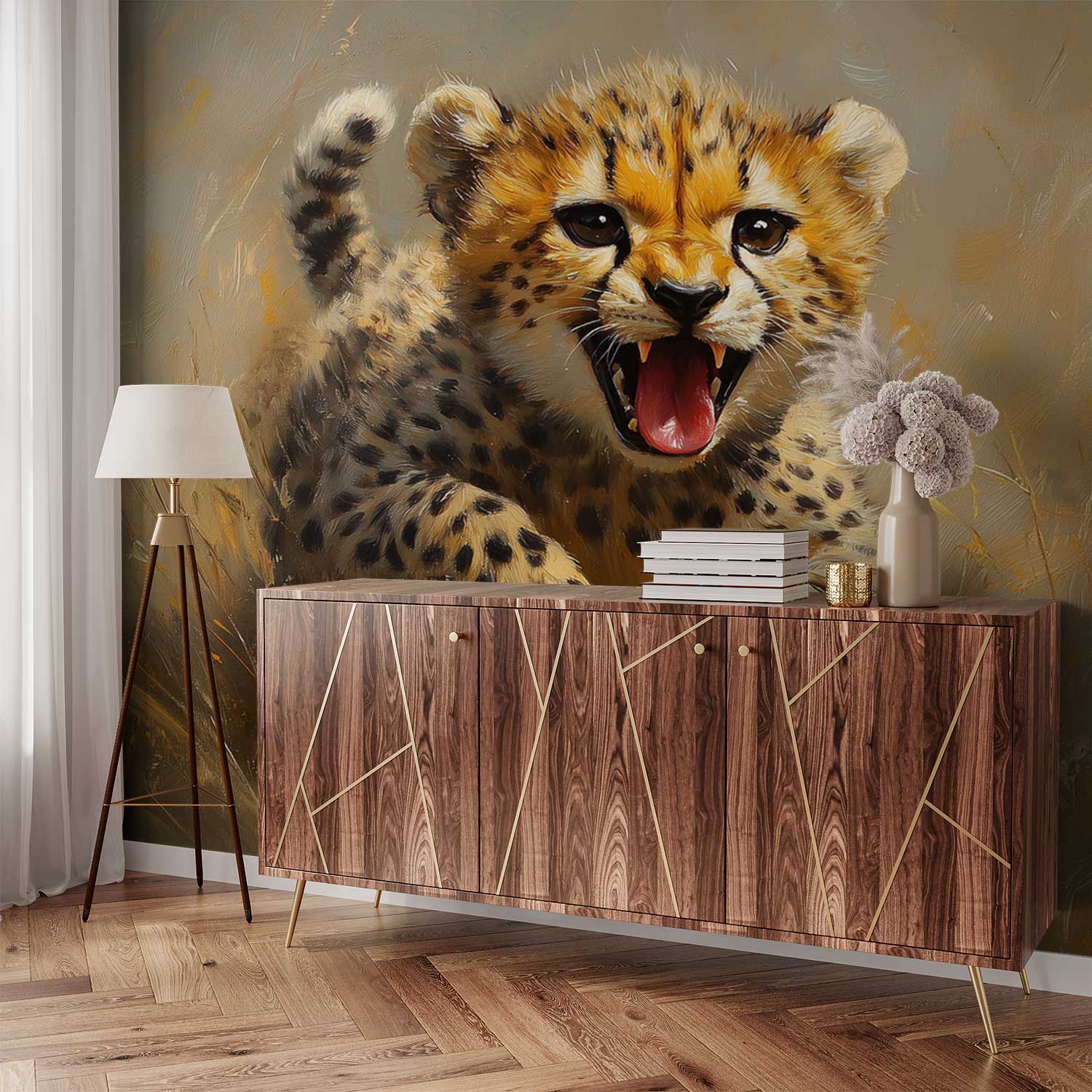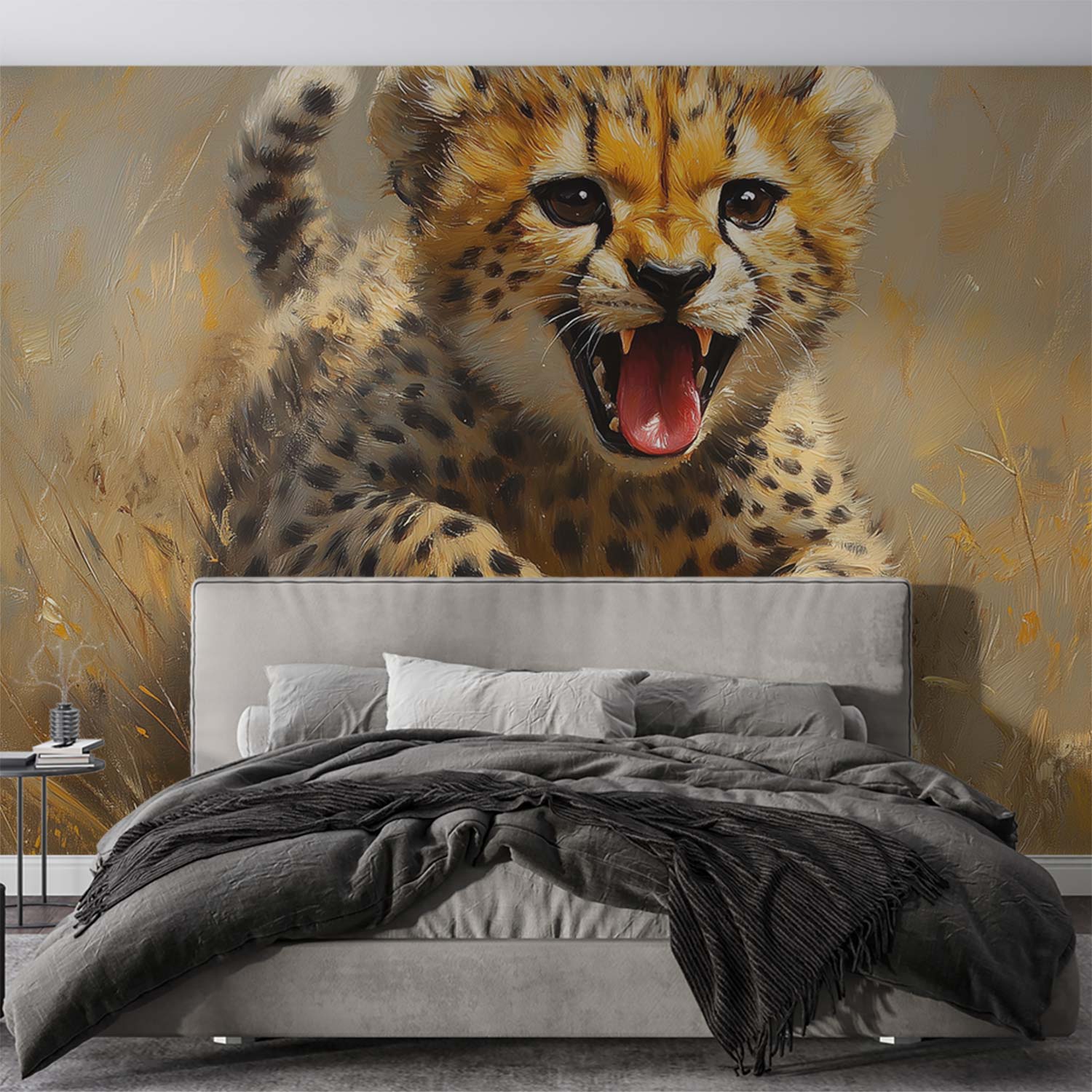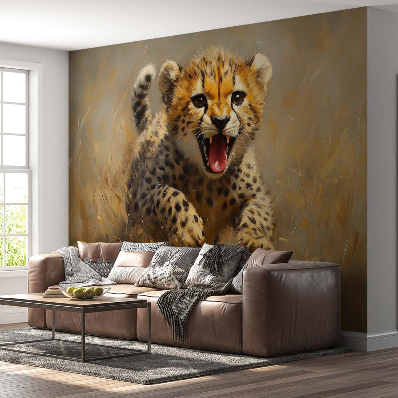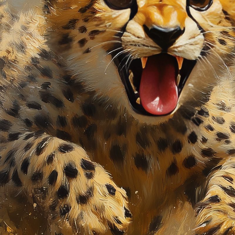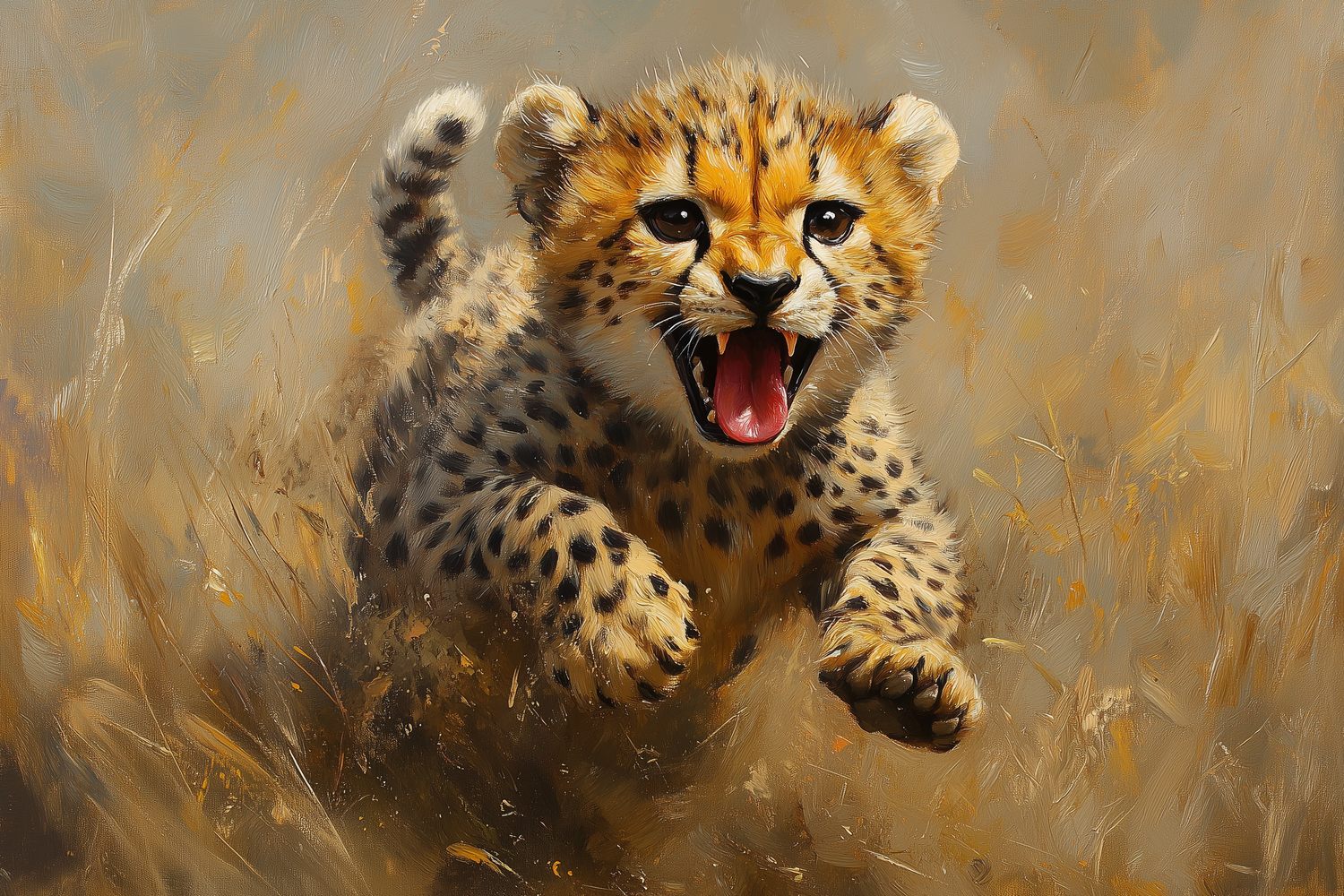 Vurig oranje en goudgeel vangen de dynamische sprong van dit jachtluipaard. Impressionistische penseelstreken geven zijn razende vaart door het hoge gras weer, vol levendige energie. Deze muurdecoratie brengt een wild, ongetemd gevoel naar je interieur, perfect voor wie houdt van een ruimte met passie en beweging.