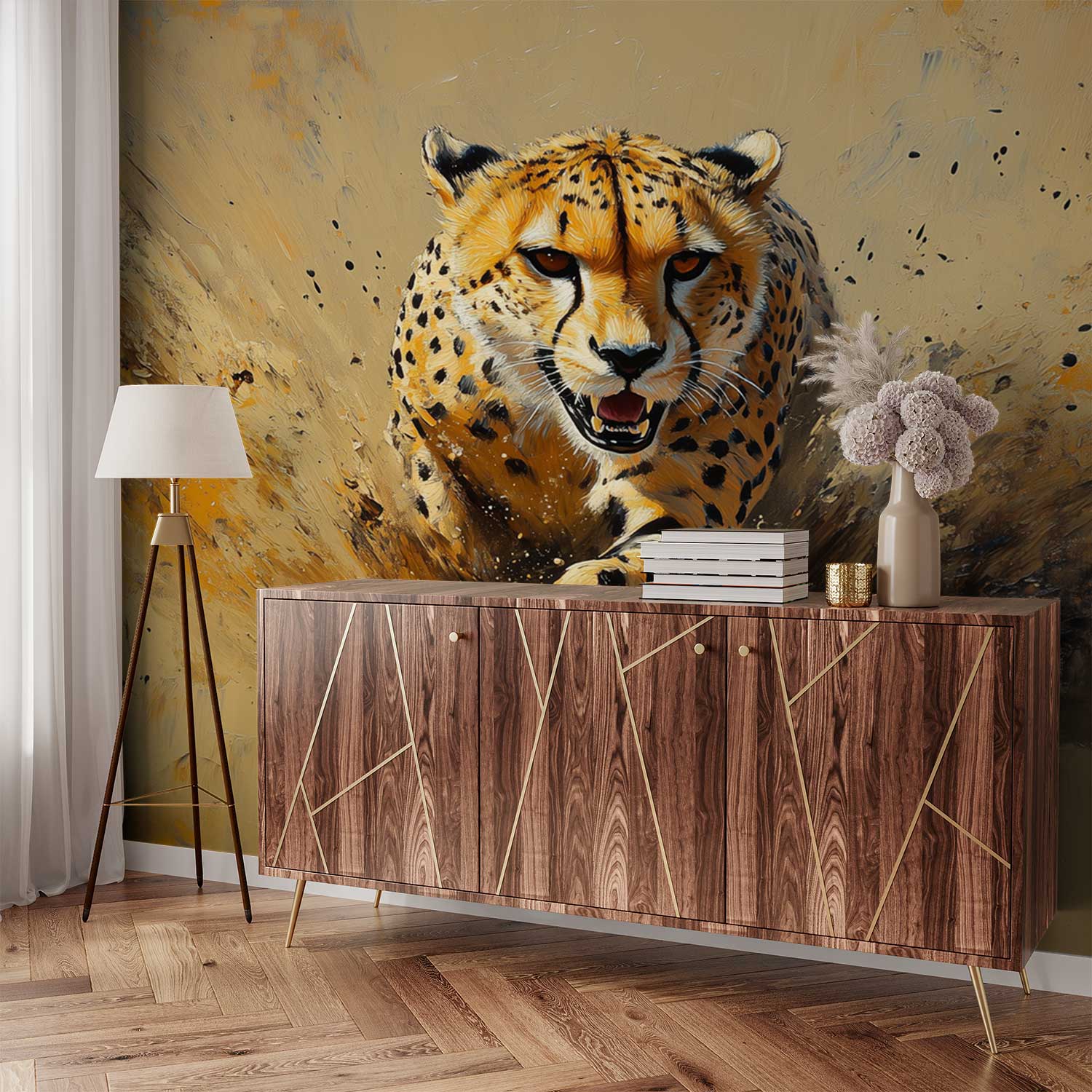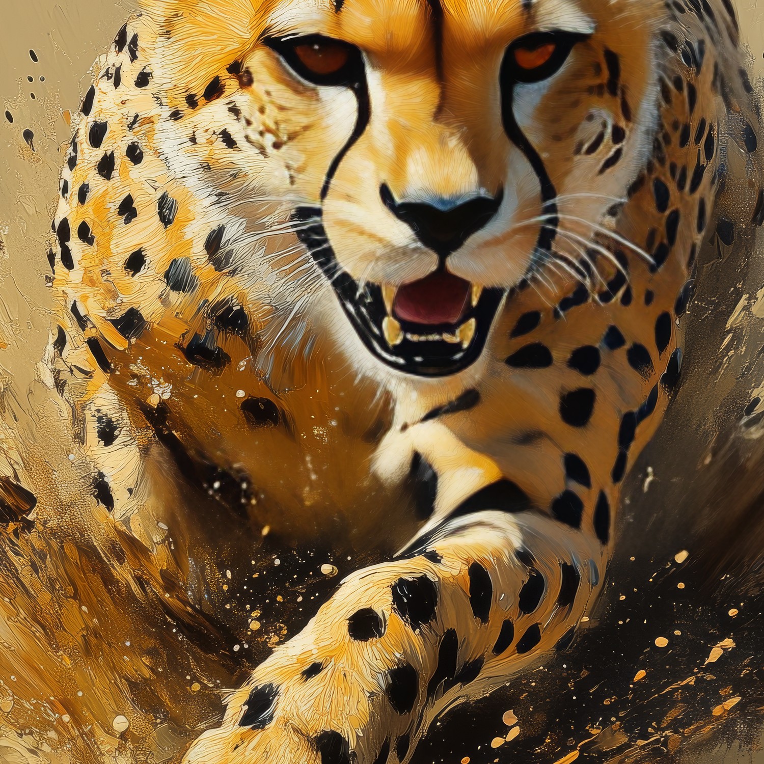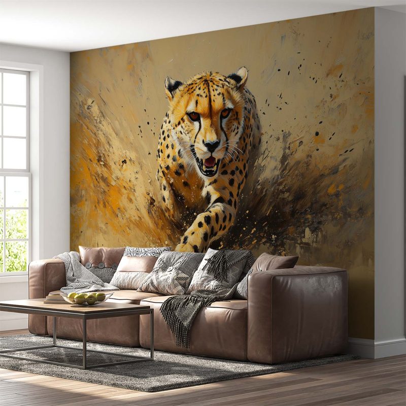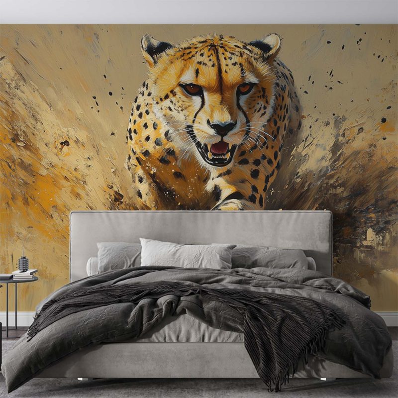Vlugge penseelstreken vangen een jagende cheetah in volle vaart. Warm oranje en geel dansen over het zand, terwijl koelere bruintinten diepte creëren. Dit levendige kunstwerk brengt pure dynamiek en wildernisenergie in je ruimte. Zijn expressieve stijl en centrale focus maken het een adembenemend statement, perfect voor een interieur dat durft en beweging omarmt.