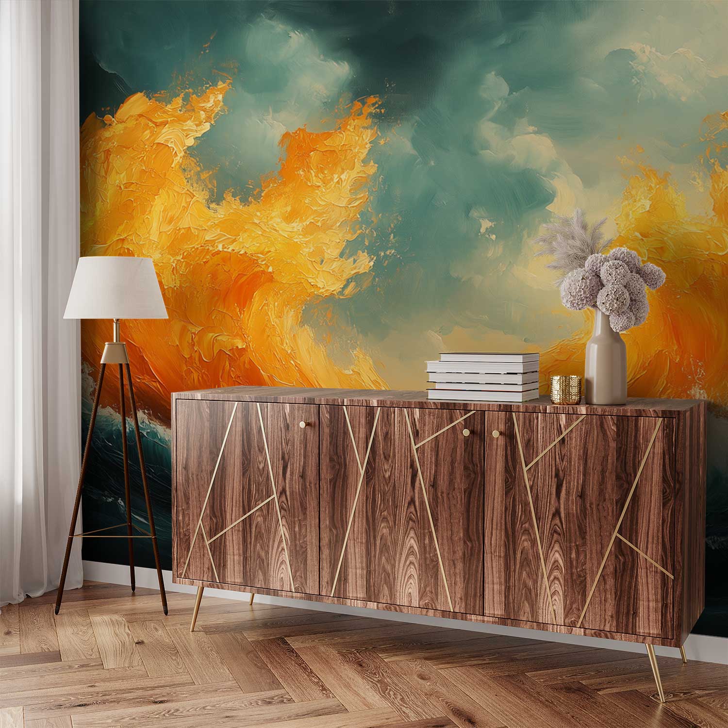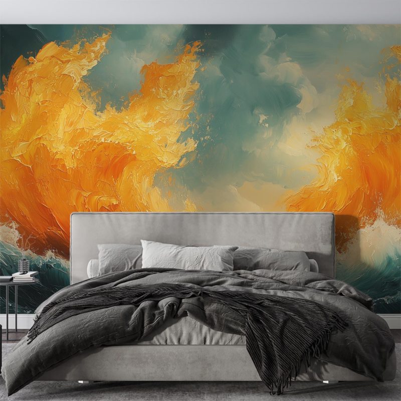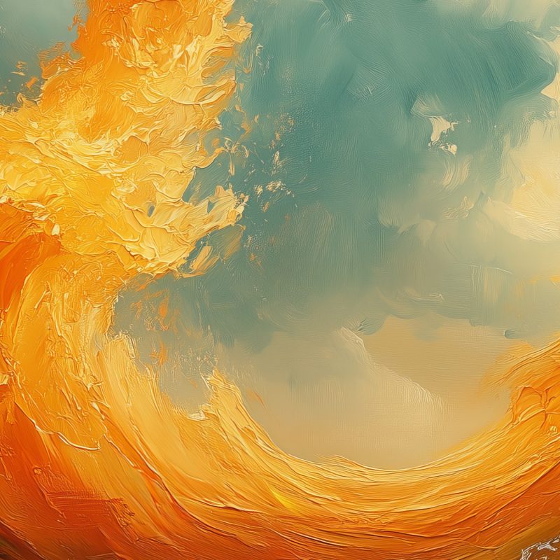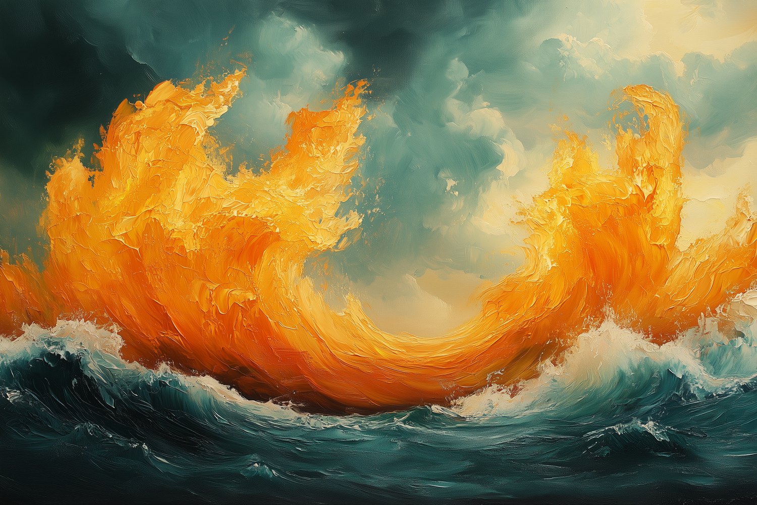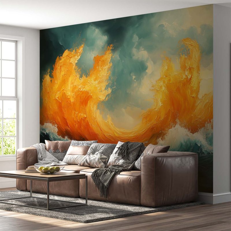 Woest oranje schuim knalt tegen diepblauwe golven. Levendige penseelstreken dansen over het doek en vangen de energie van een stormachtige zee. Dit krachtige tafereel brengt de dynamische energie van de natuur in huis. Perfect voor wie verlangt naar drama en beweging in het interieur, het transformeert elke muur in een meeslepend kunstwerk dat tot de verbeelding spreekt.