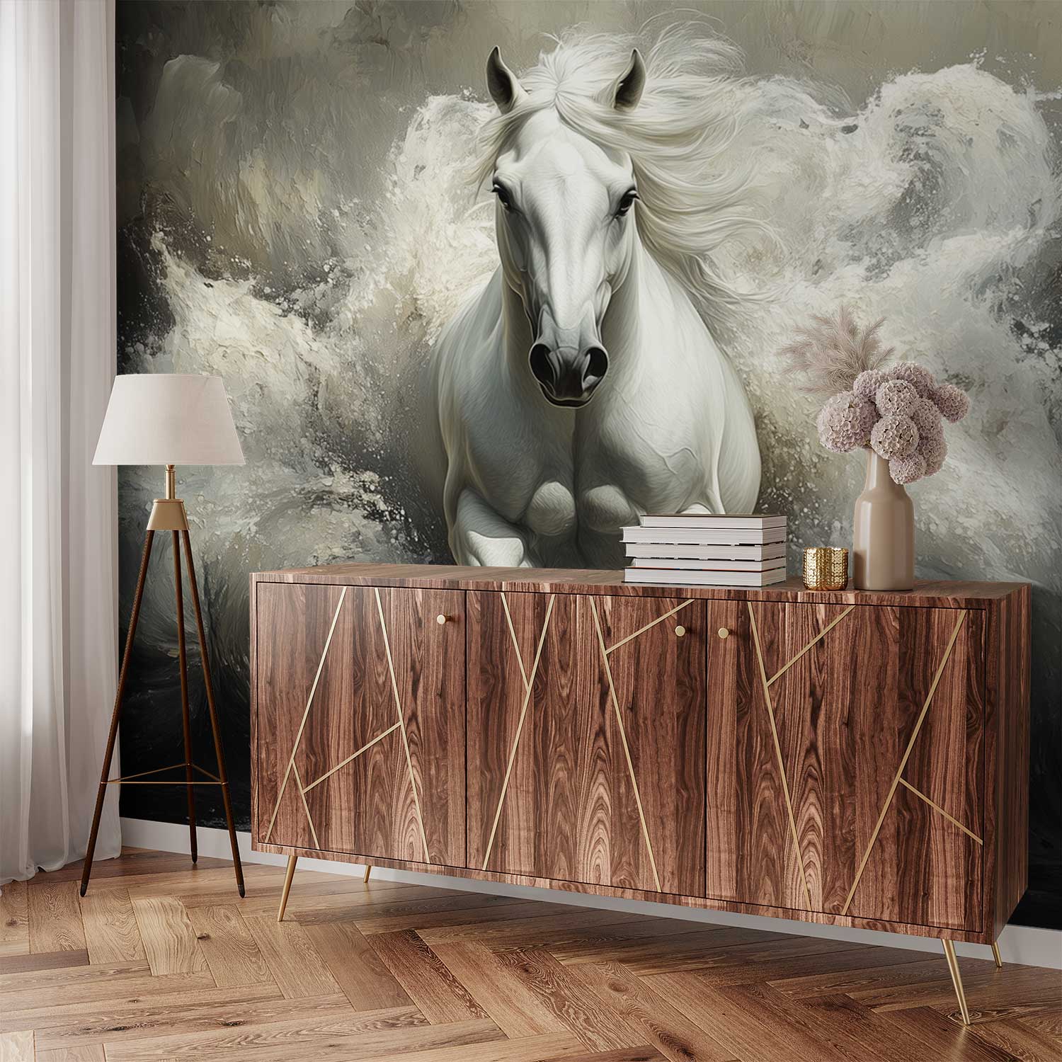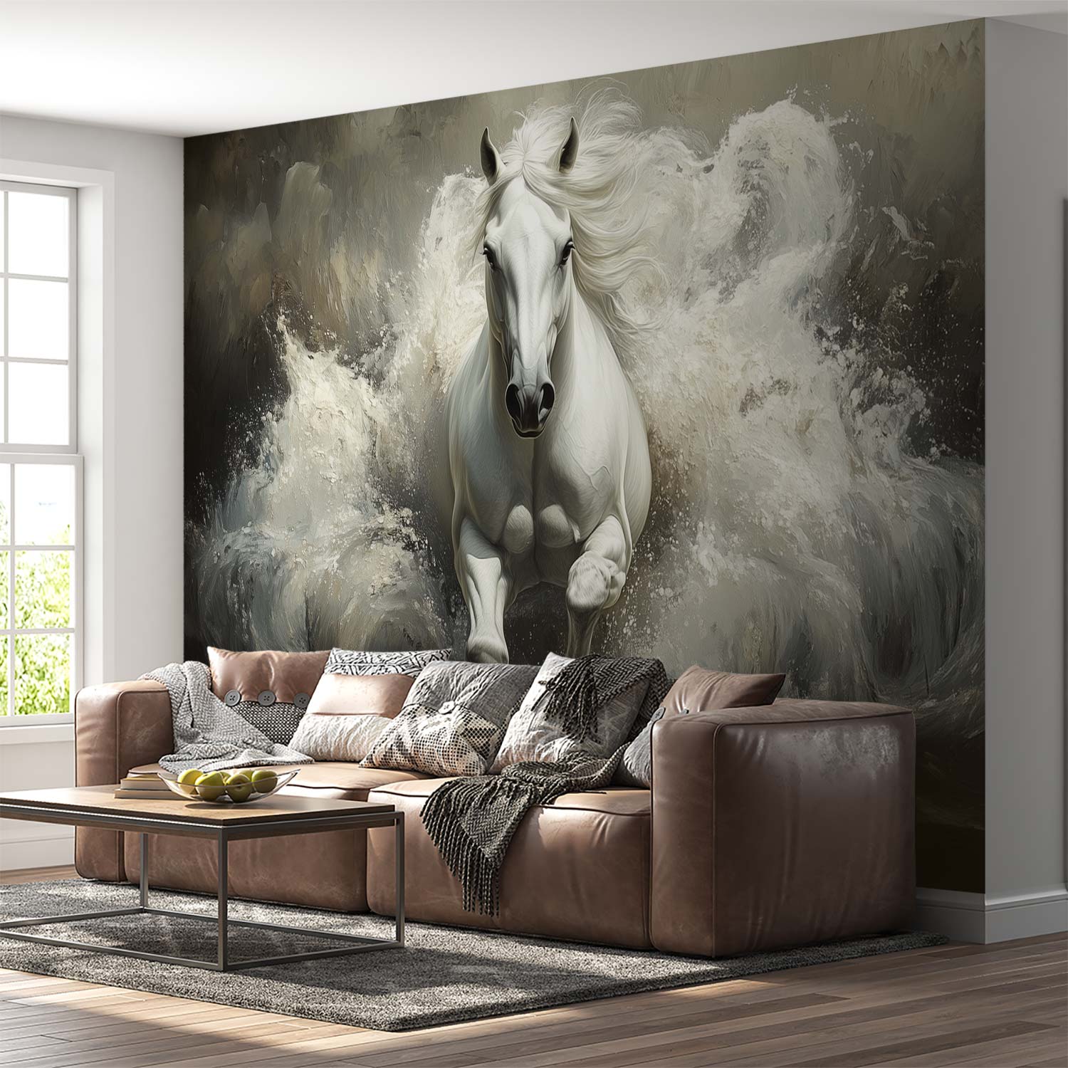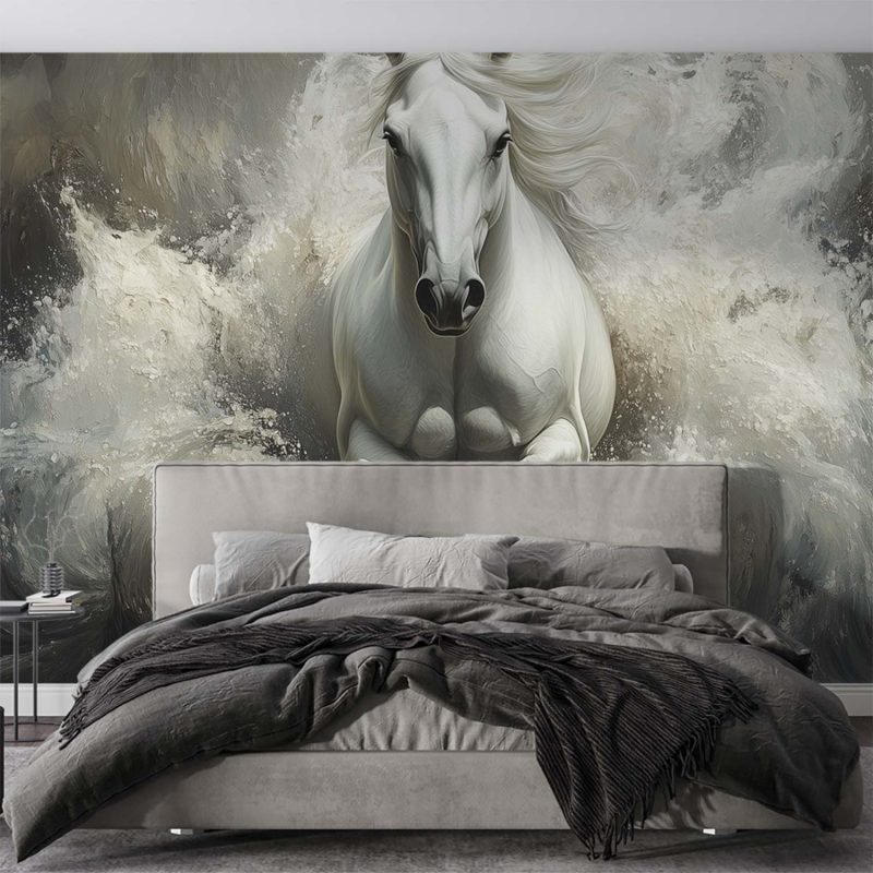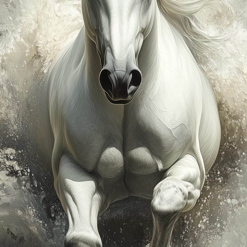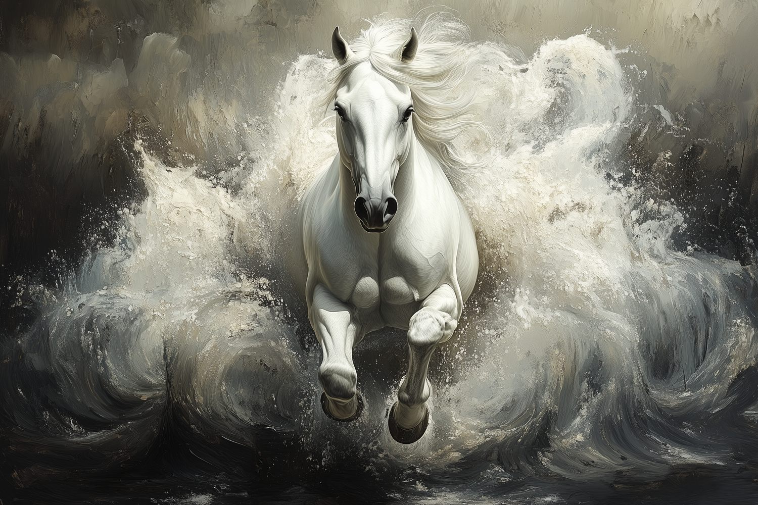 Stormachtige grijstinten wervelen rond een krachtig wit paard dat door woeste golven galoppeert. Zijn wapperende manen en gespierde lijf stralen pure energie en vrijheid uit. Dit dramatische tafereel brengt dynamische beweging en een gevoel van ongebonden wildheid in je ruimte. Perfect voor wie verlangt naar een statement vol passie en natuurlijke kracht in het interieur.