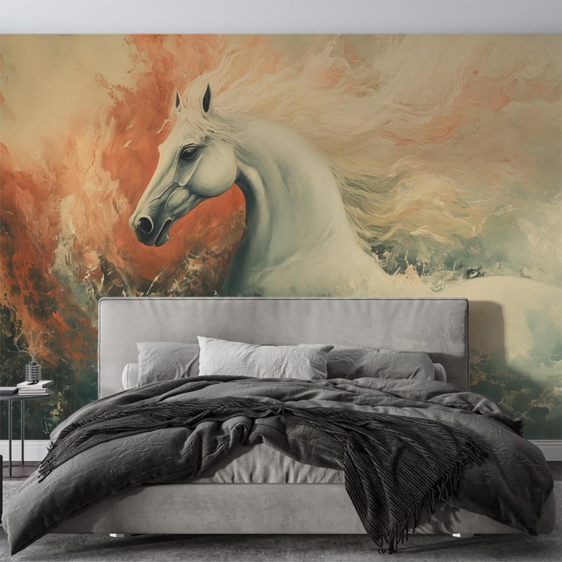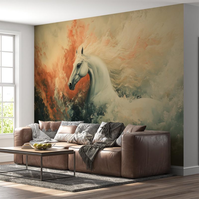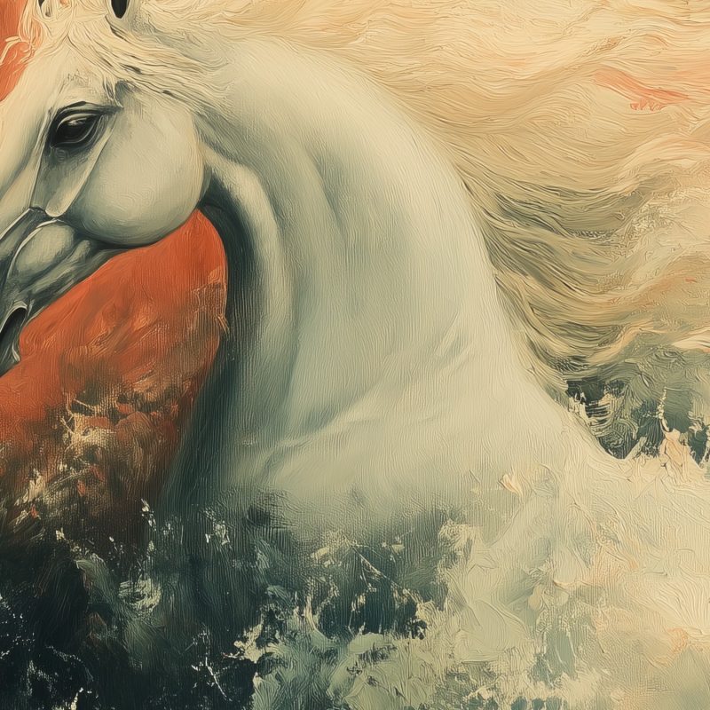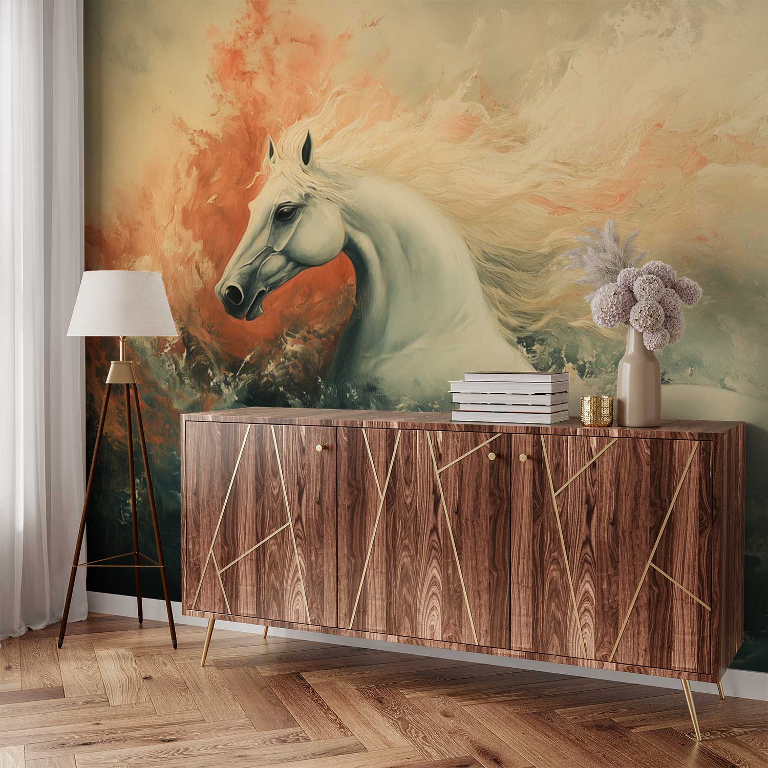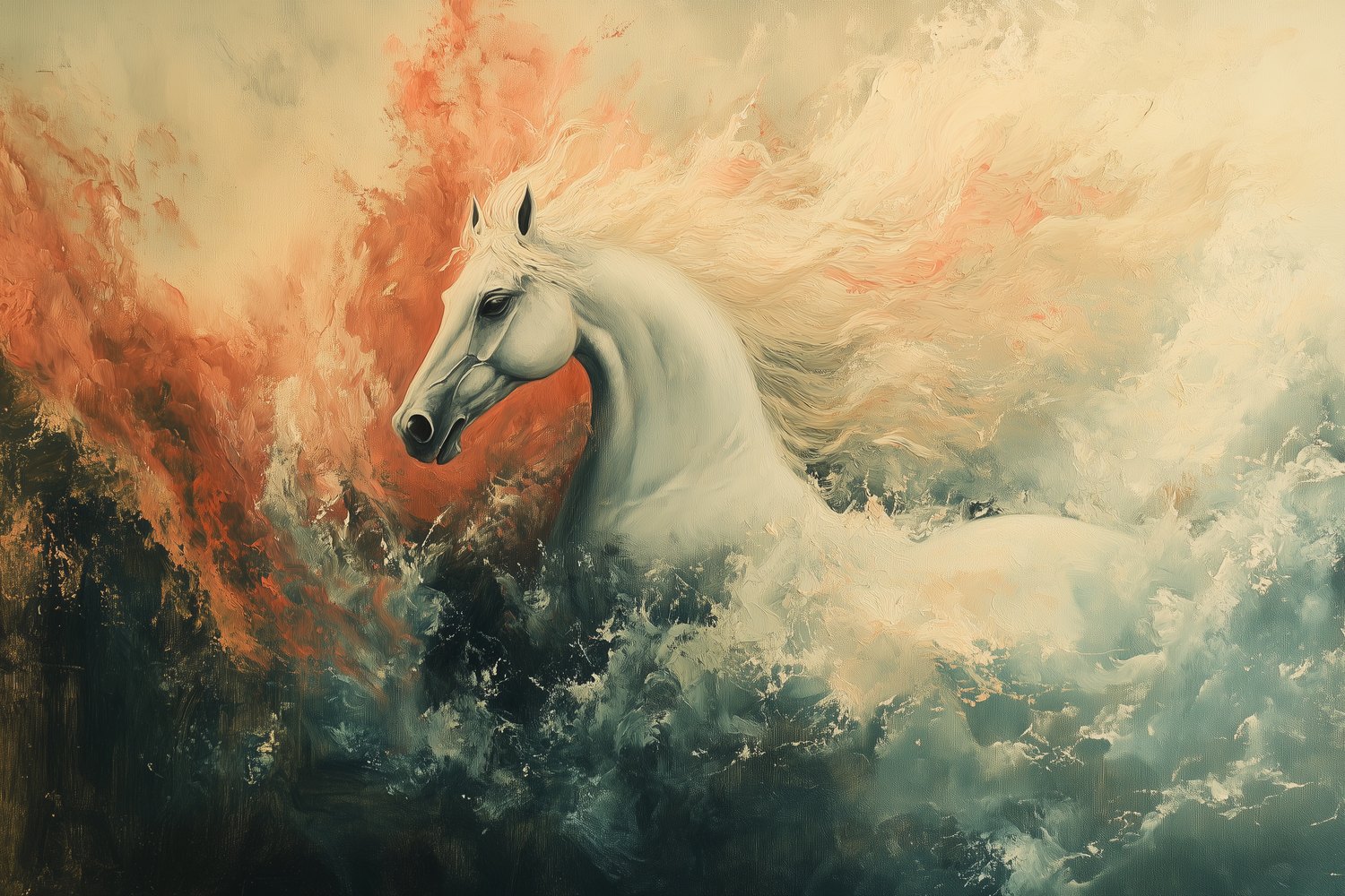Stormachtige golven in diepblauw en oranje omarmen een wit paard dat krachtig door de branding galoppeert. Zijn manen wapperen wild in de wind, vol energie en gratie. Dit levendige tafereel brengt drama en beweging in je ruimte, ideaal voor een statementmuur die zowel kracht als elegantie uitstraalt.
