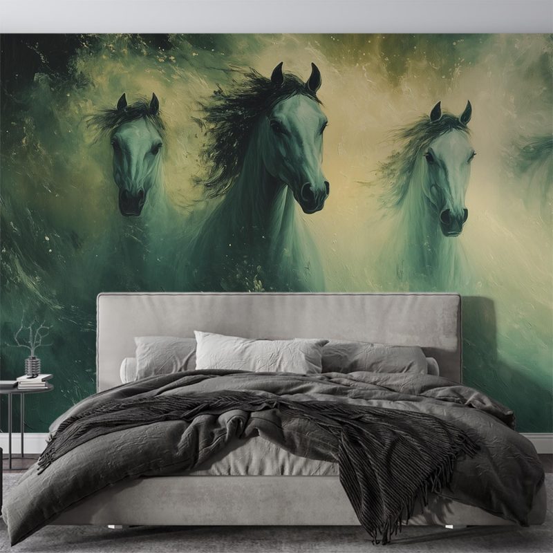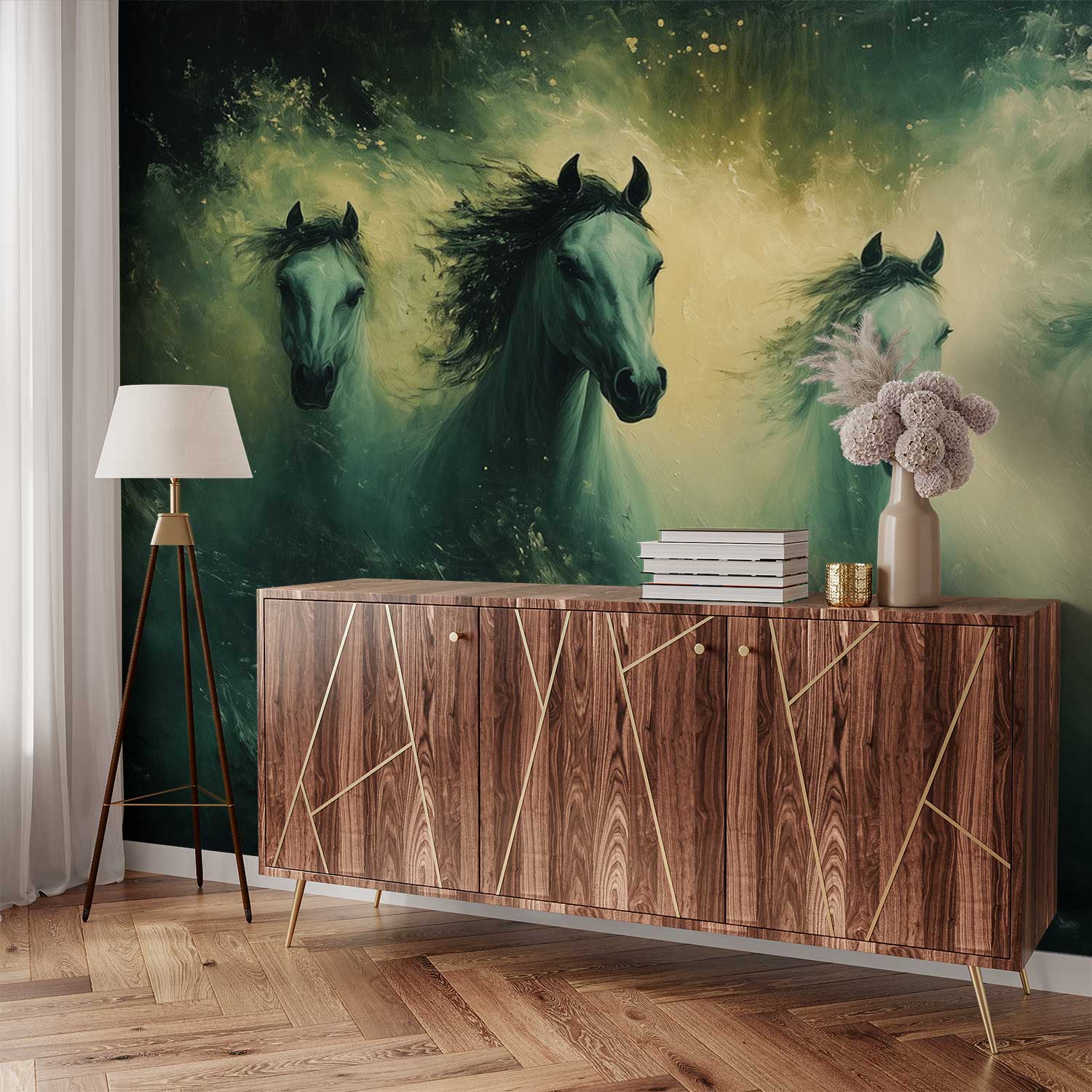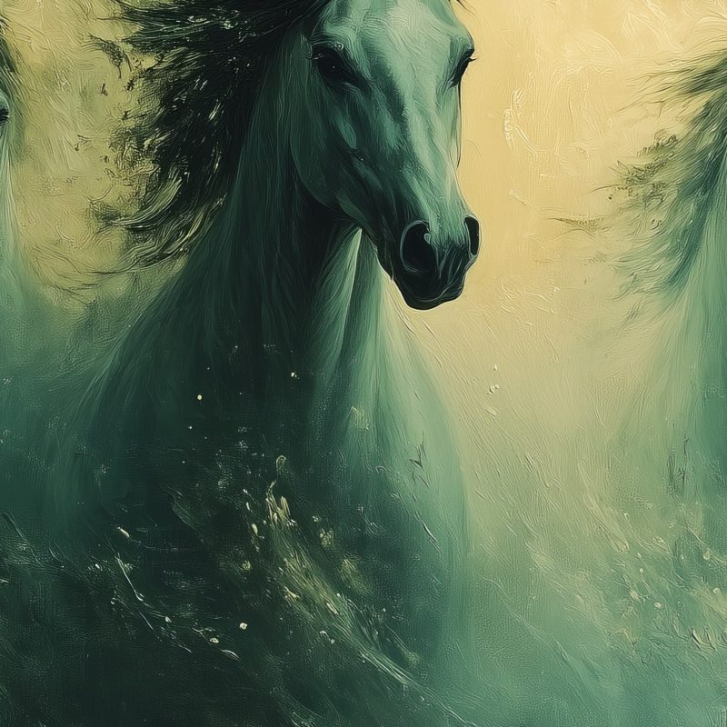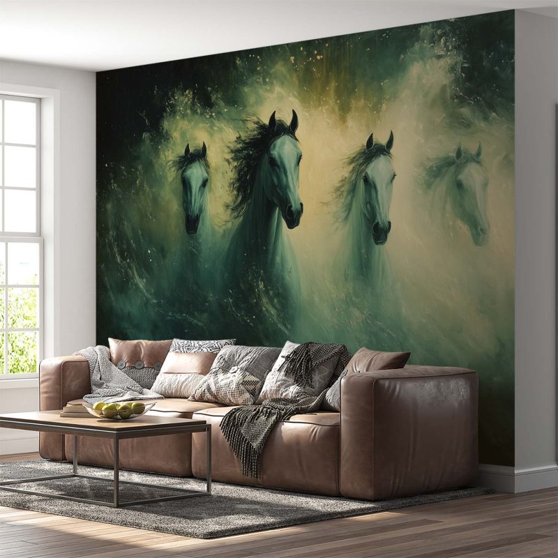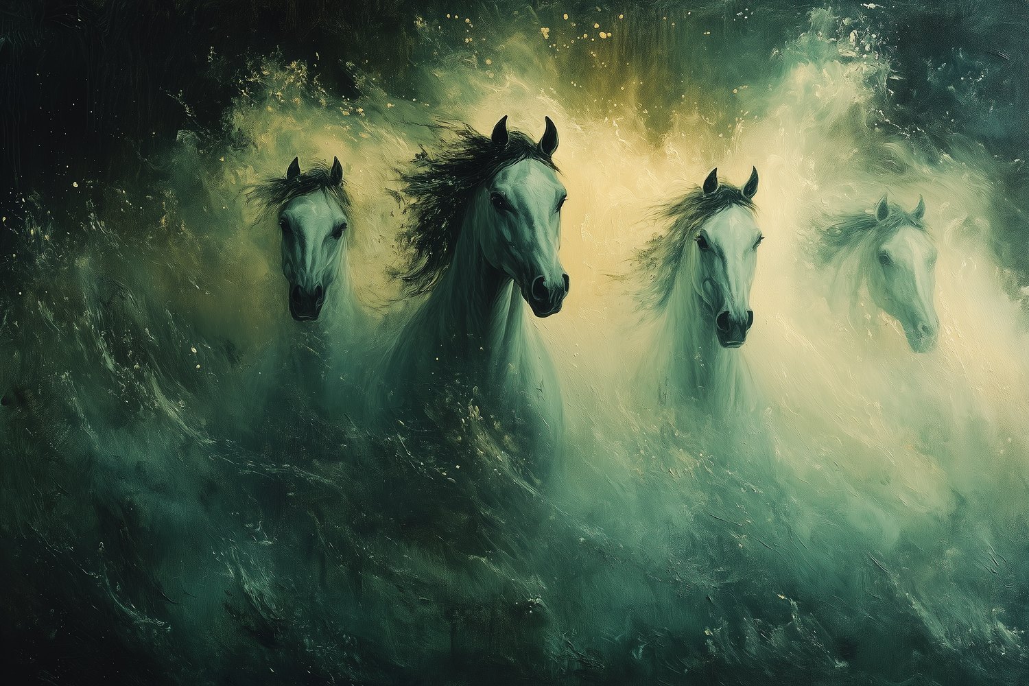 Woeste groene golven breken rond vier witte paarden die door de branding stormen. Hun manen wapperen wild terwijl ze krachtig door het schuimende water galopperen. Dit adembenemende tafereel brengt pure dynamiek en avontuur in je ruimte. Het levendige contrast van wit tegen donkergroen maakt een krachtige stijlstatement. Perfect voor wie verlangt naar drama en beweging in het interieur.