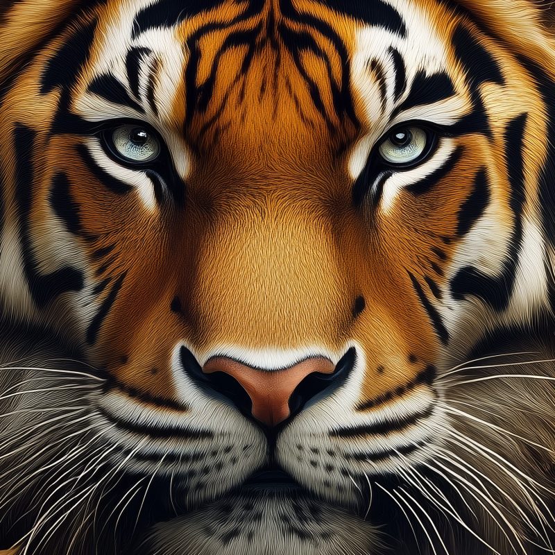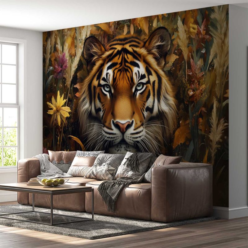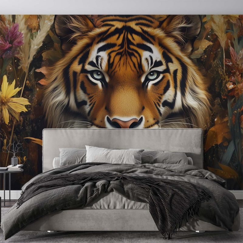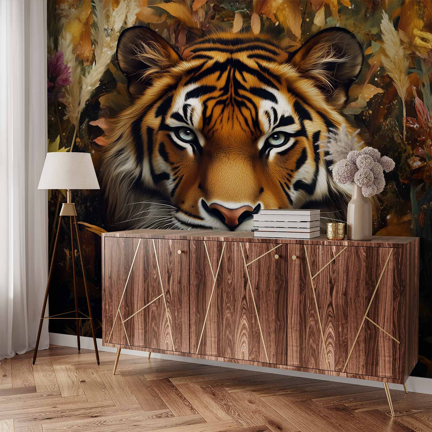 Oranje en geel tinten dansen rond de groene bladeren, terwijl de tijger je met intense blik volgt. Bloemen wervelen om hem heen in een levendig schouwspel van de natuur. Dit behang brengt een gevoel van serene kracht en tropische weelde in je ruimte, perfect voor een statement muur die energie en diepte toevoegt.